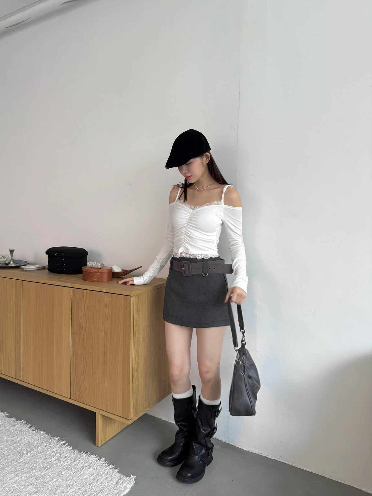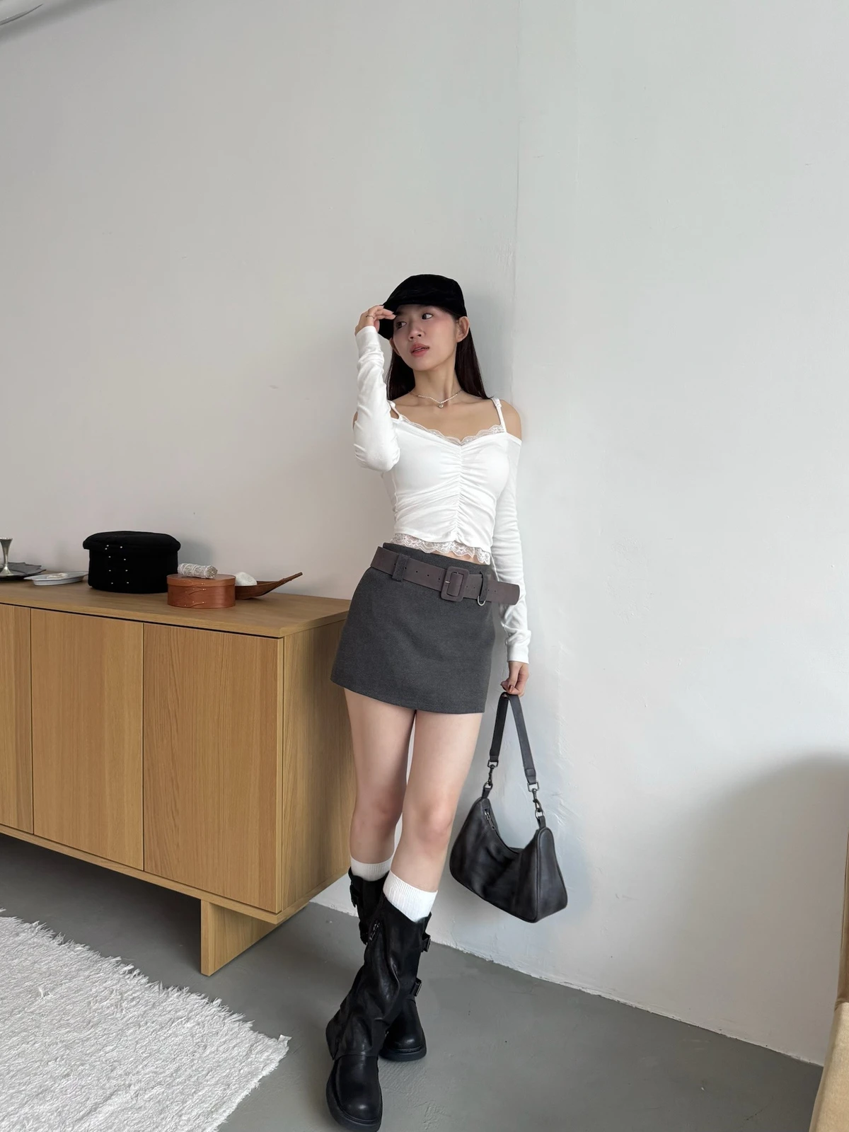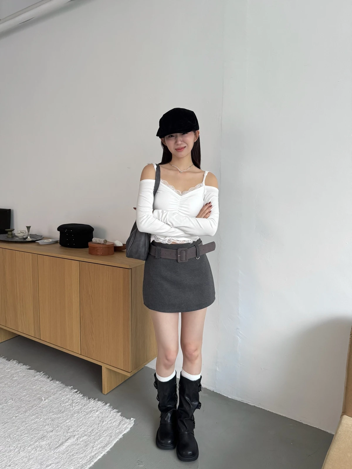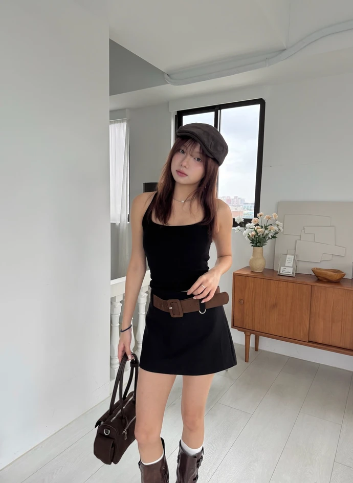推薦!毛呢A字短褲裙-附皮帶/2colors