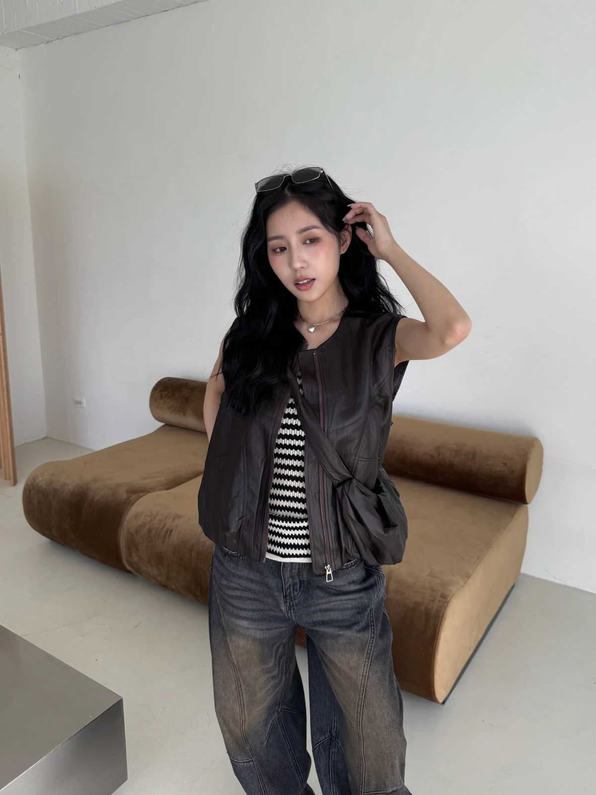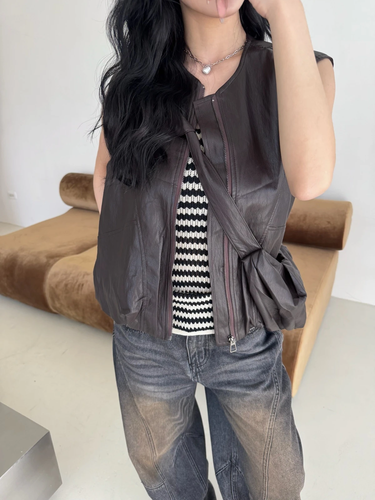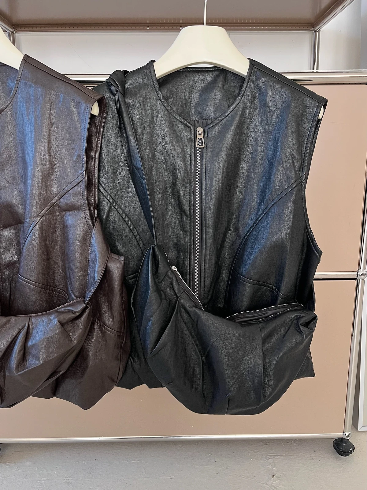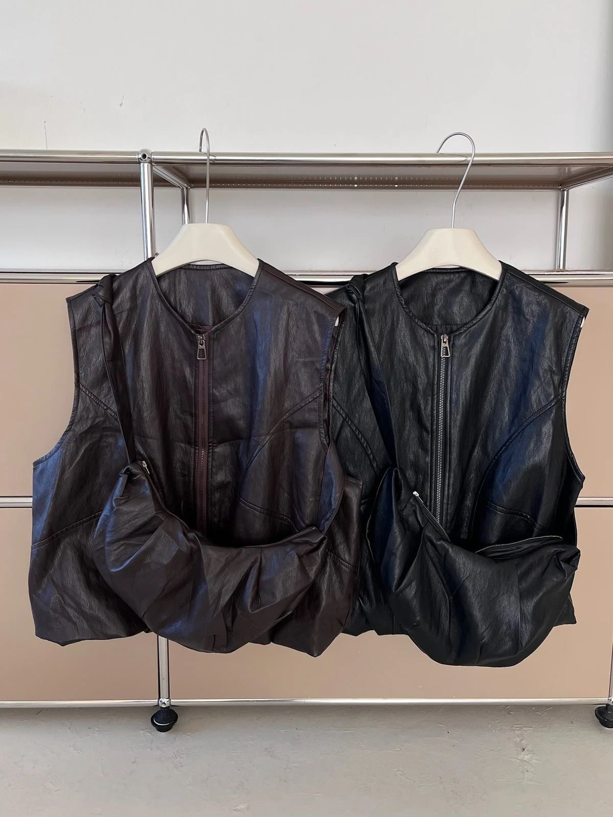 附包包無領拉鍊軟皮革背心/2colors