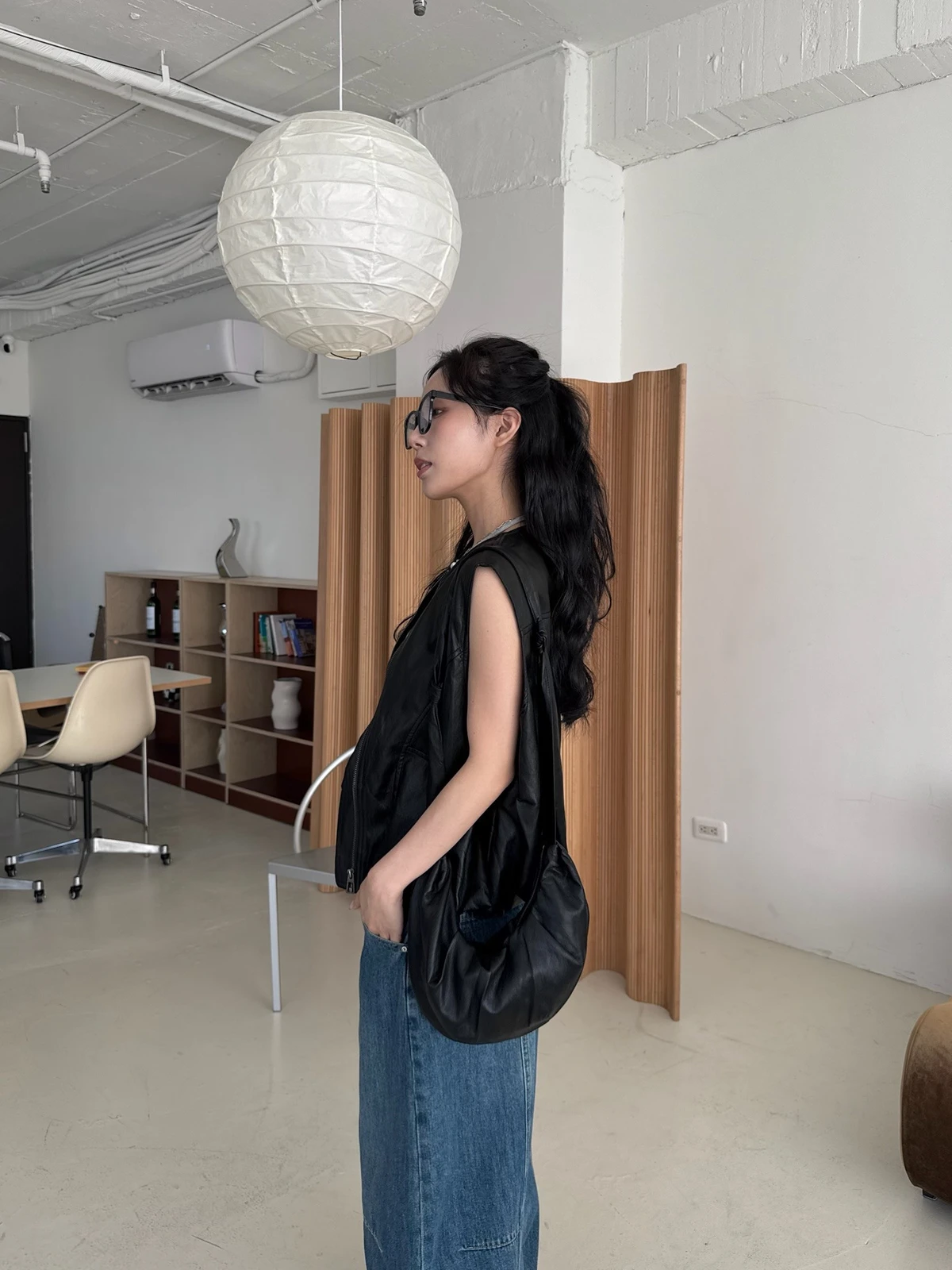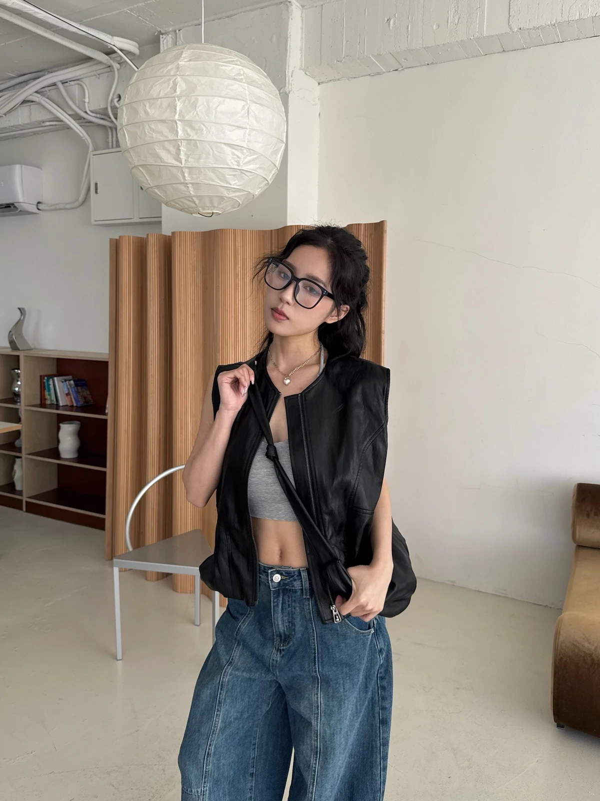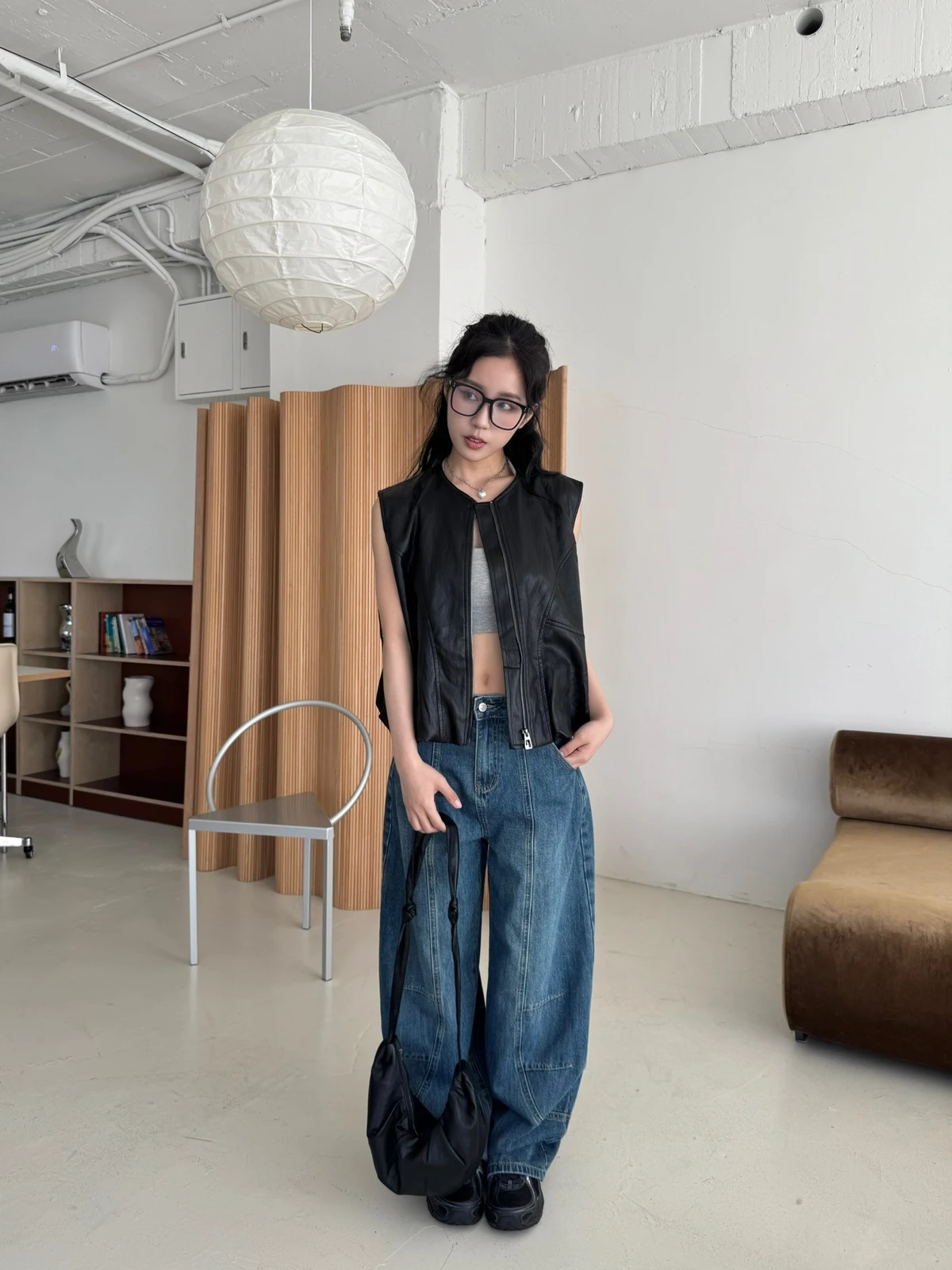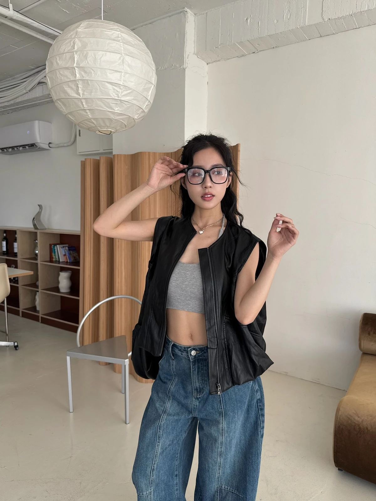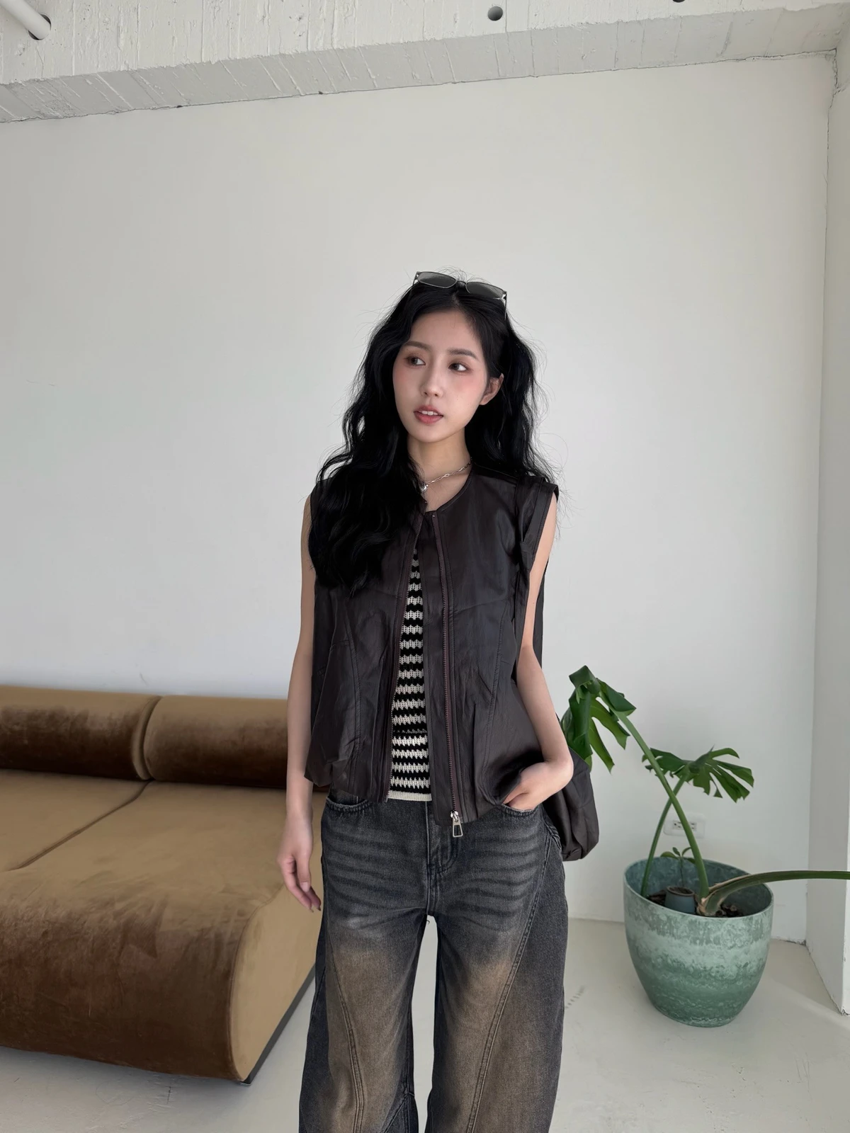 附包包無領拉鍊軟皮革背心/2colors
