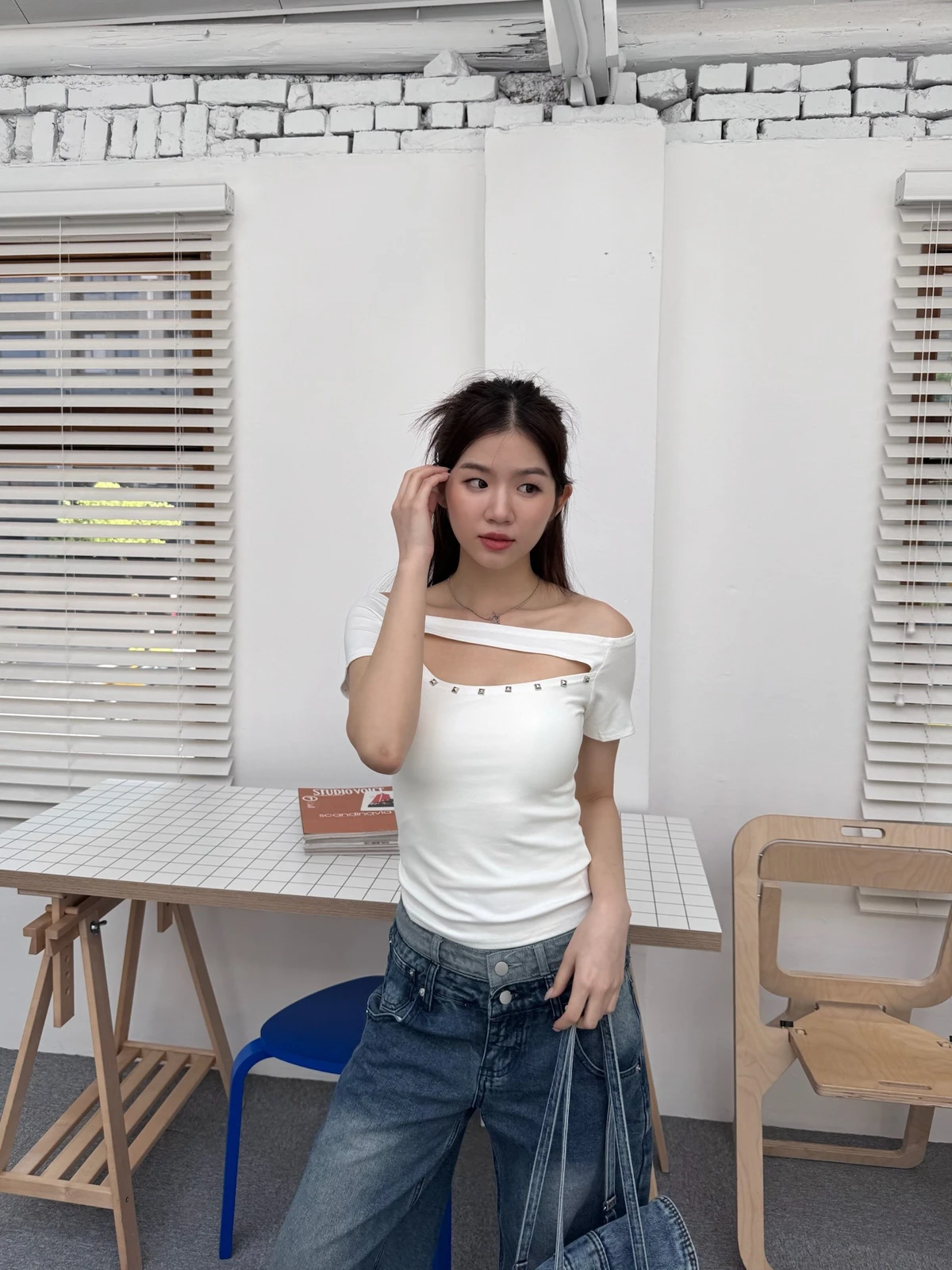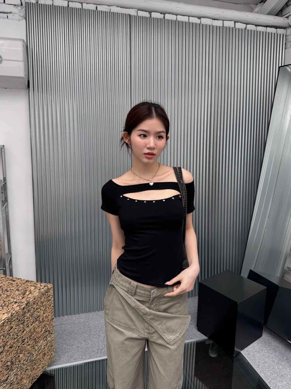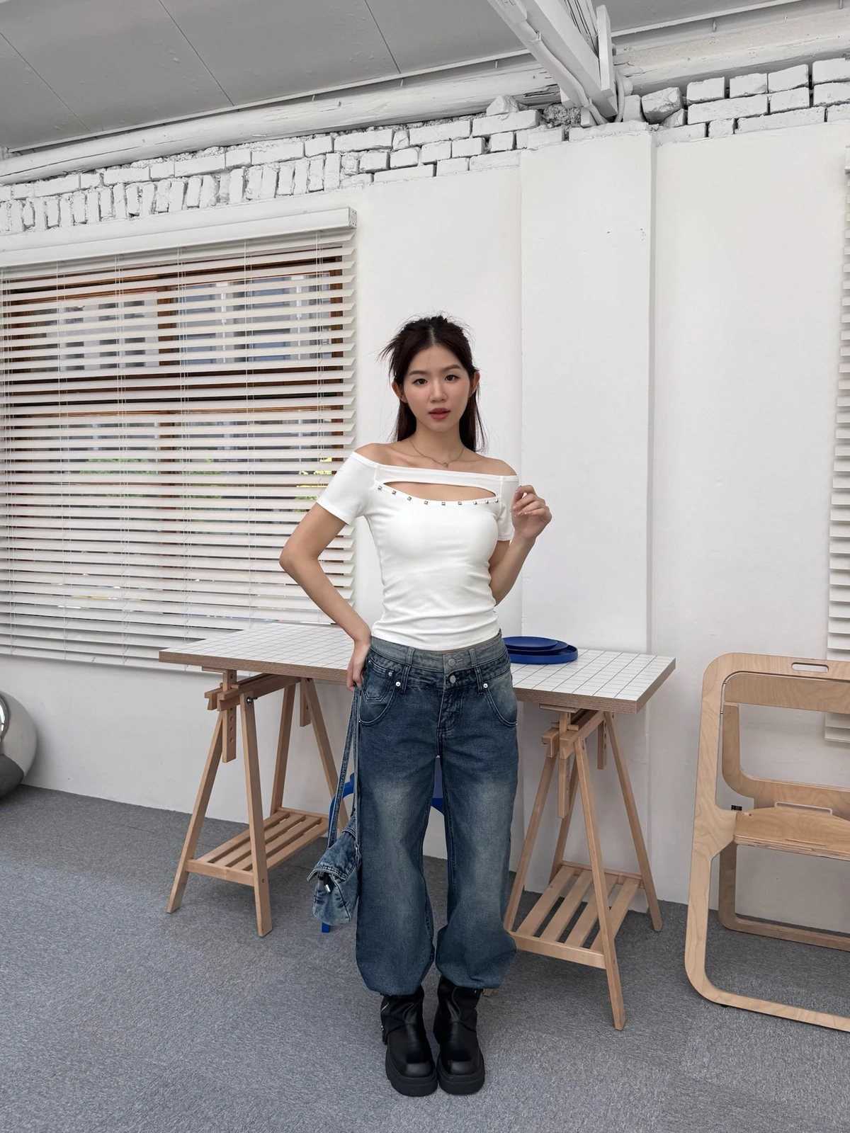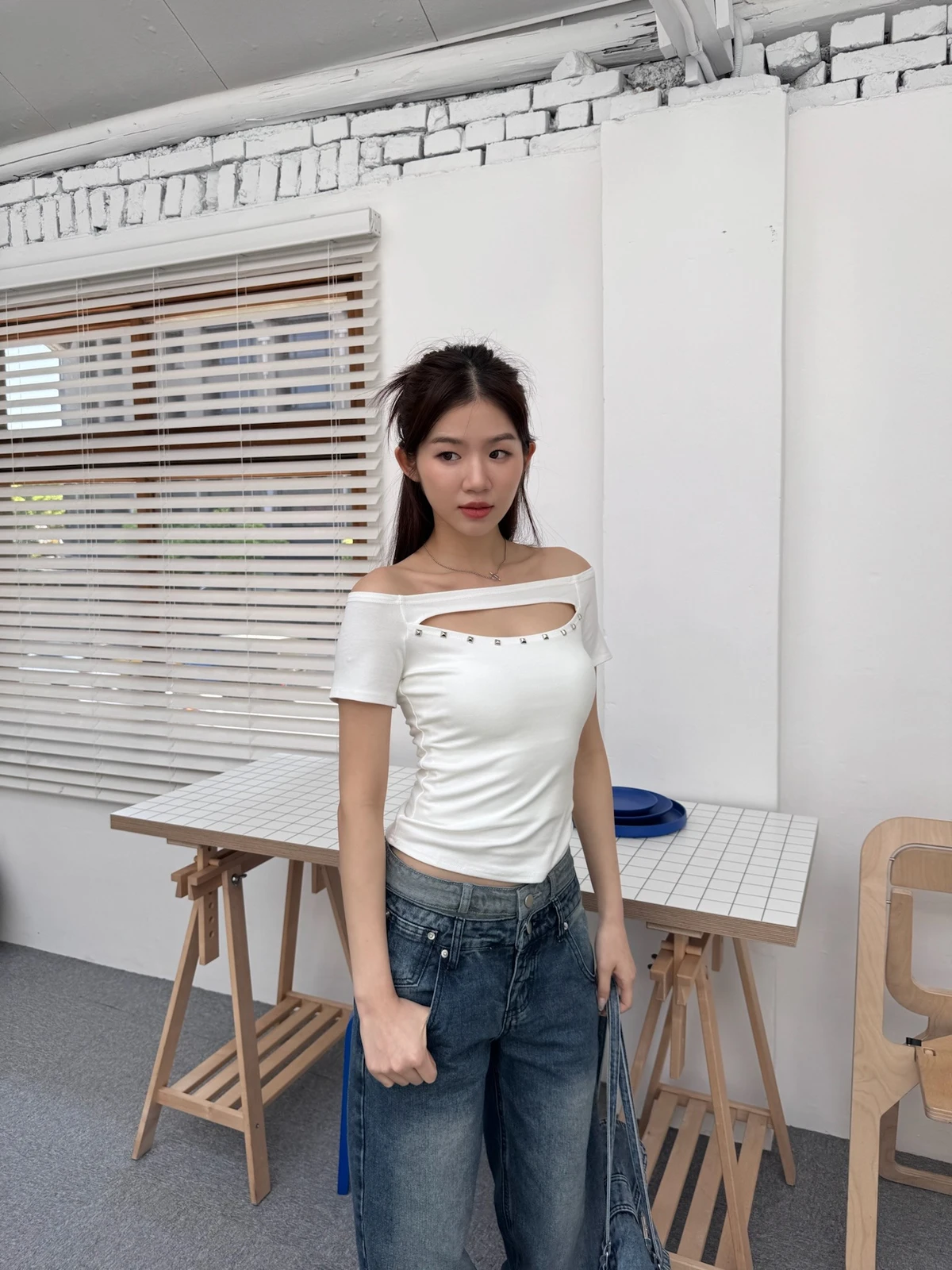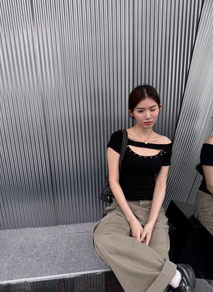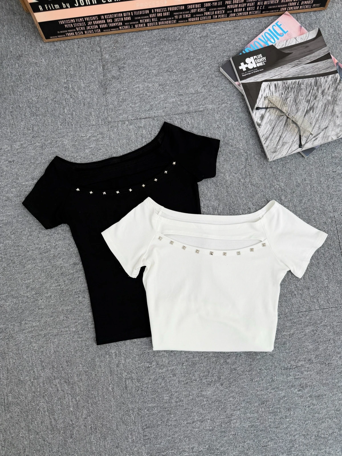簍空設計方鉚釘一字領短T/2colors