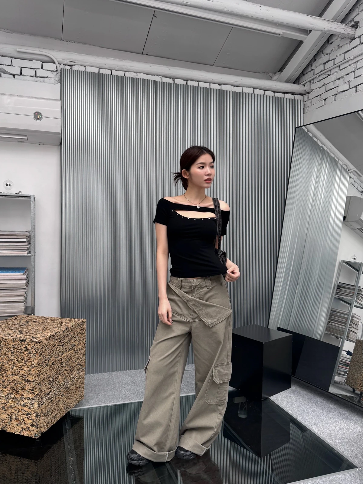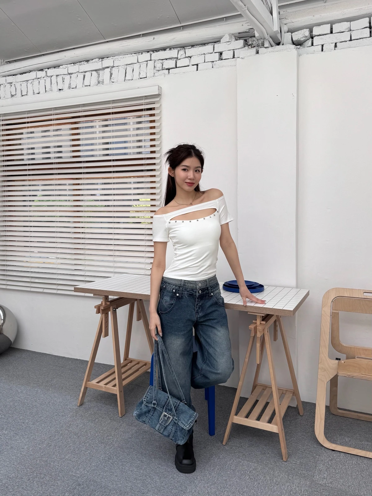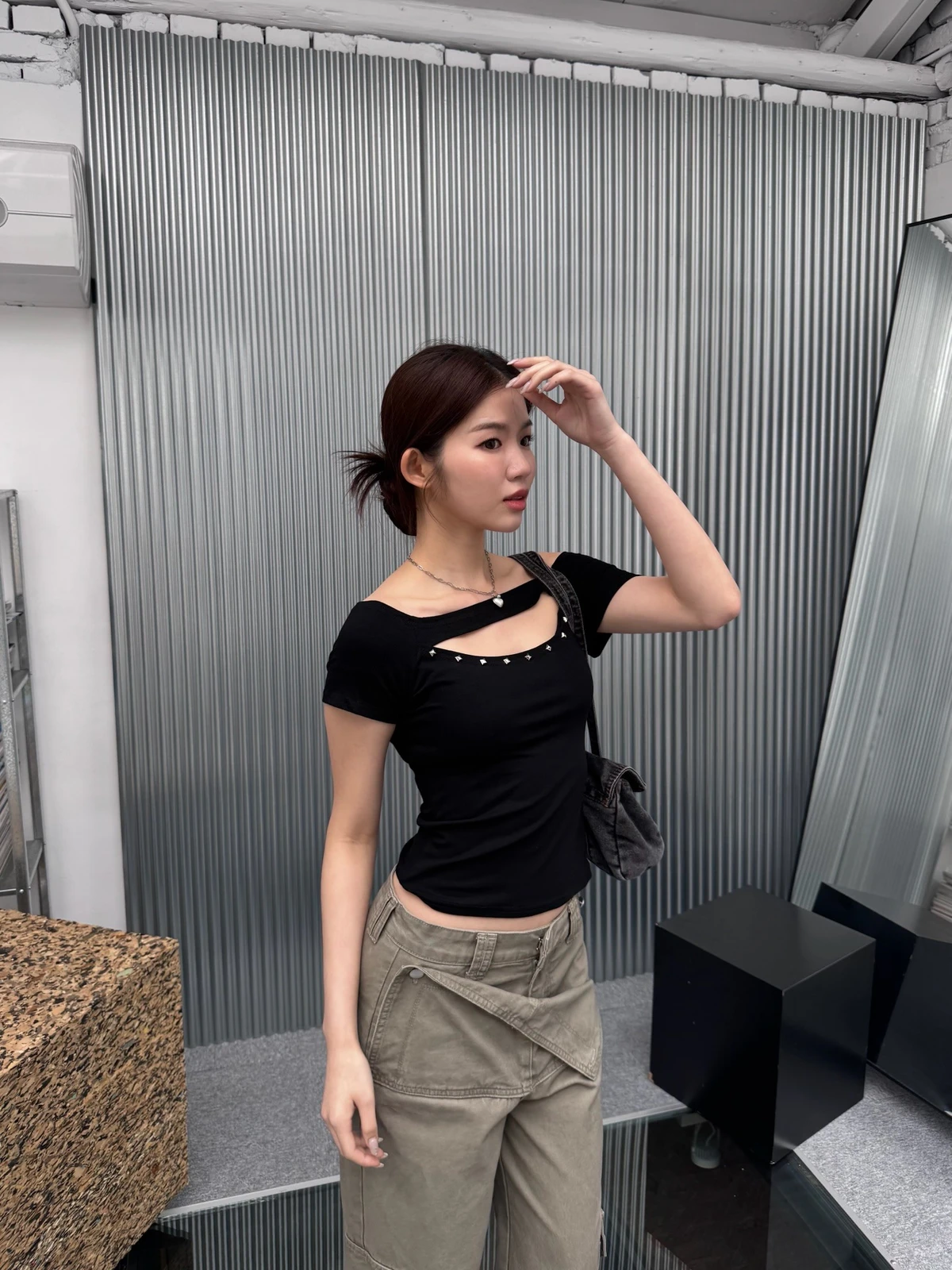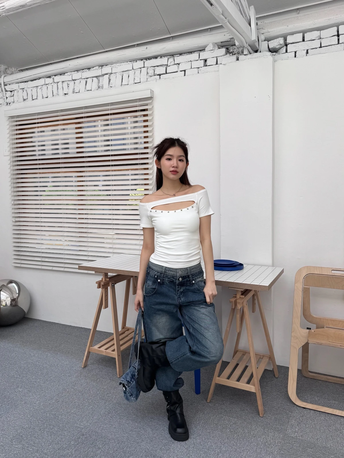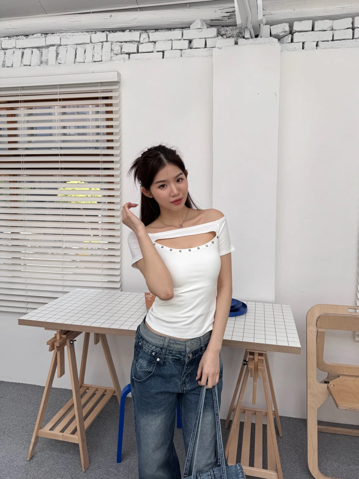 簍空設計方鉚釘一字領短T/2colors
