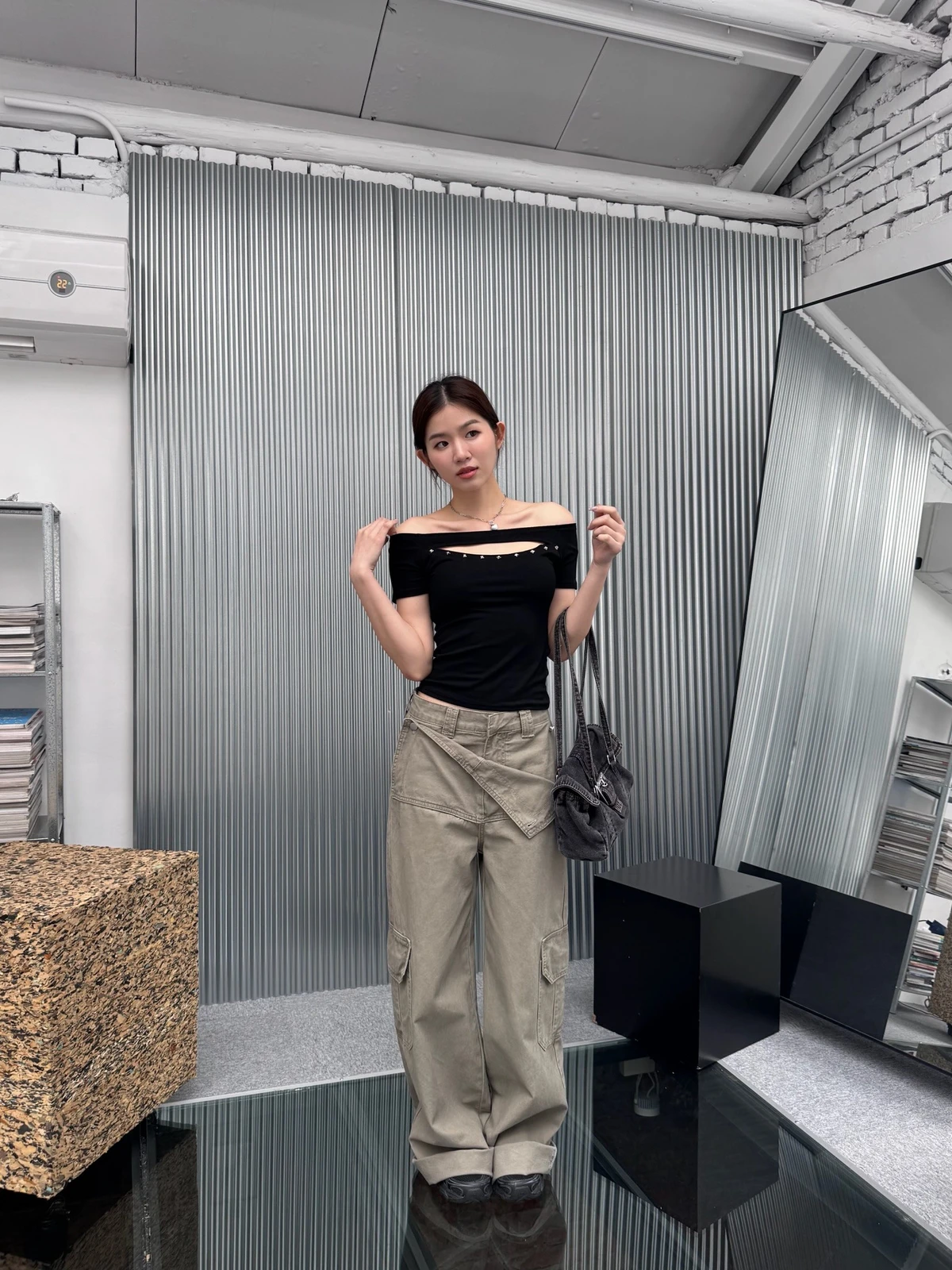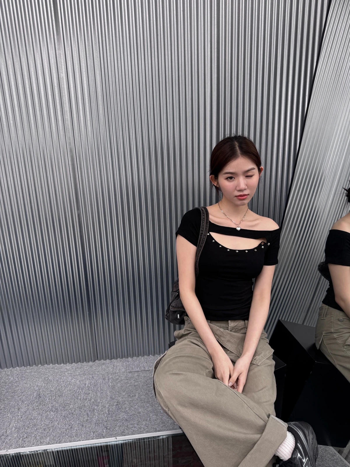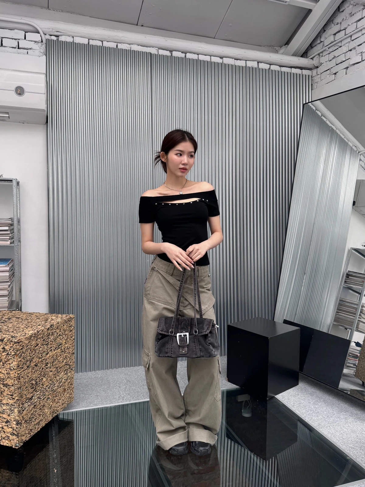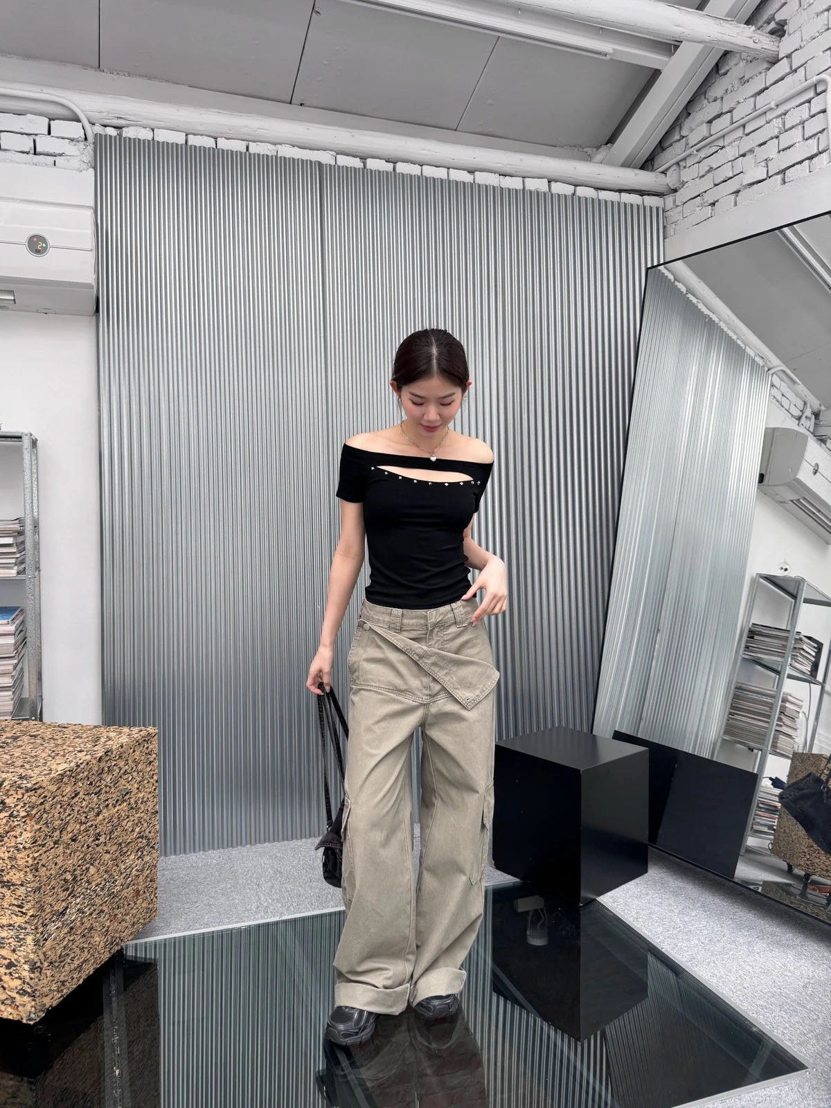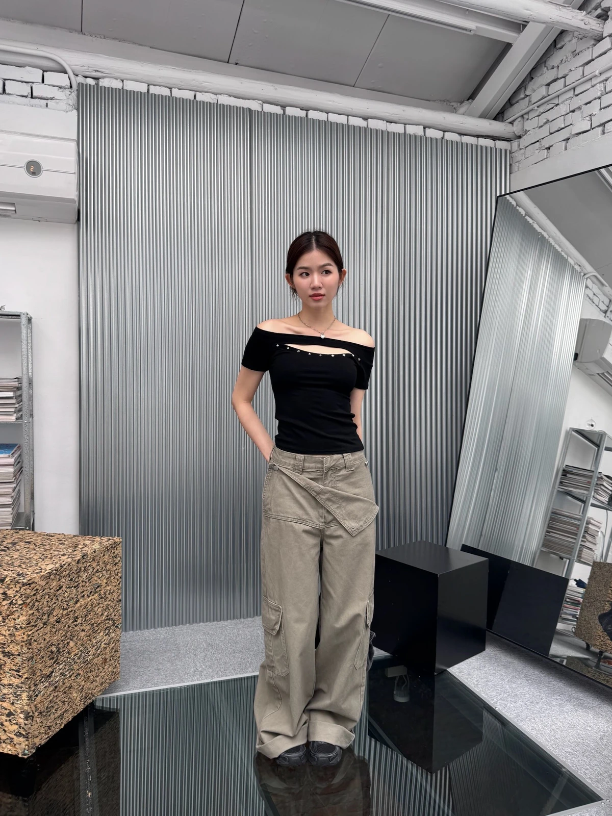 簍空設計方鉚釘一字領短T/2colors