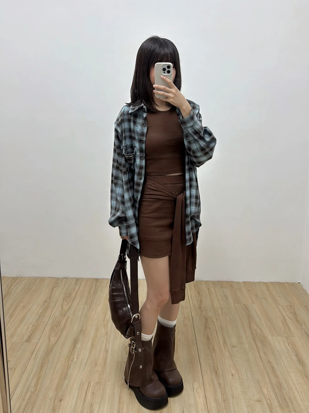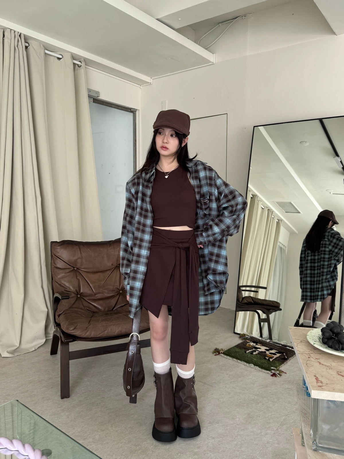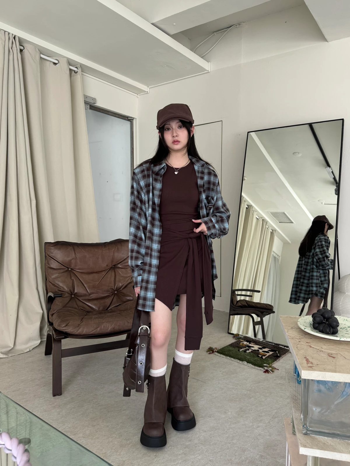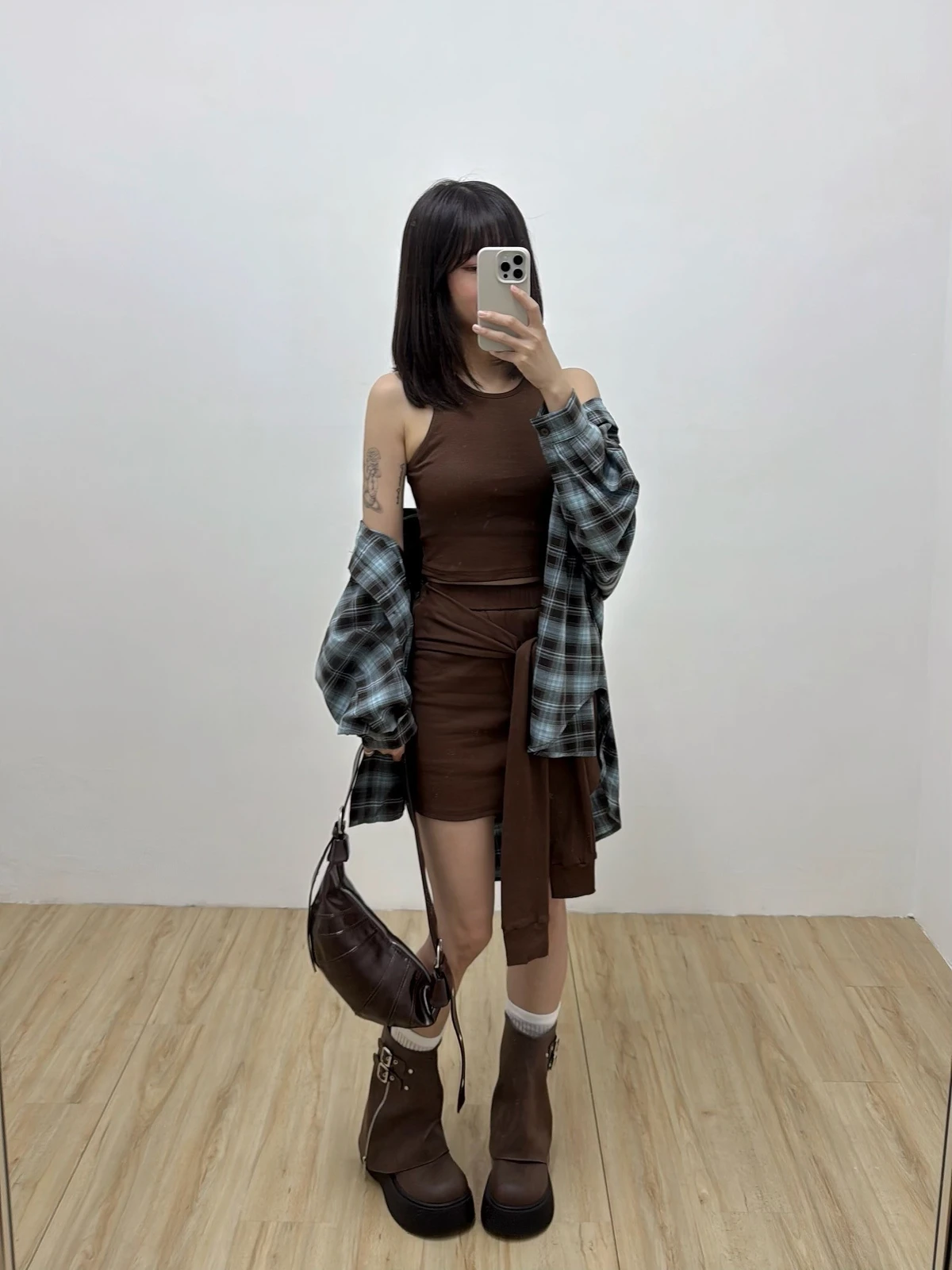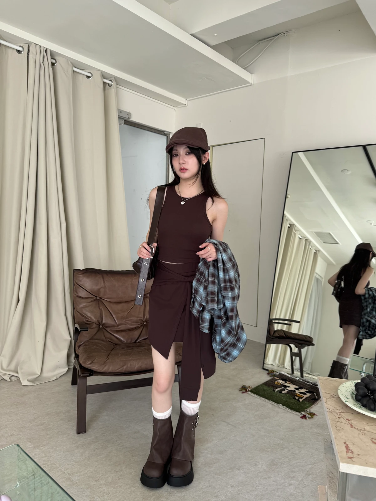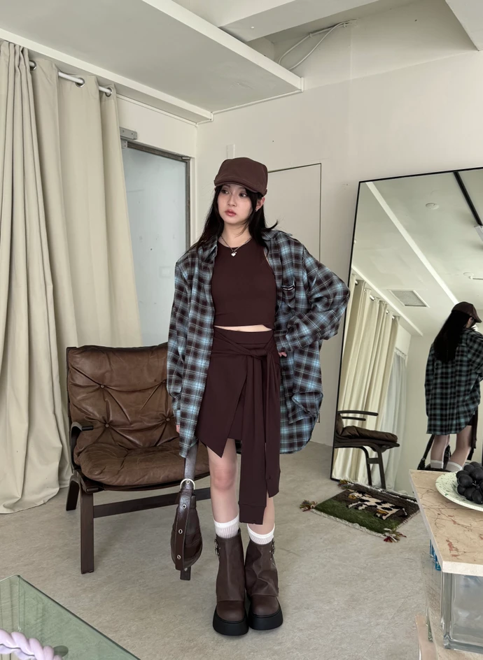 格紋襯衫+背心褲裙套裝三件式/咖啡