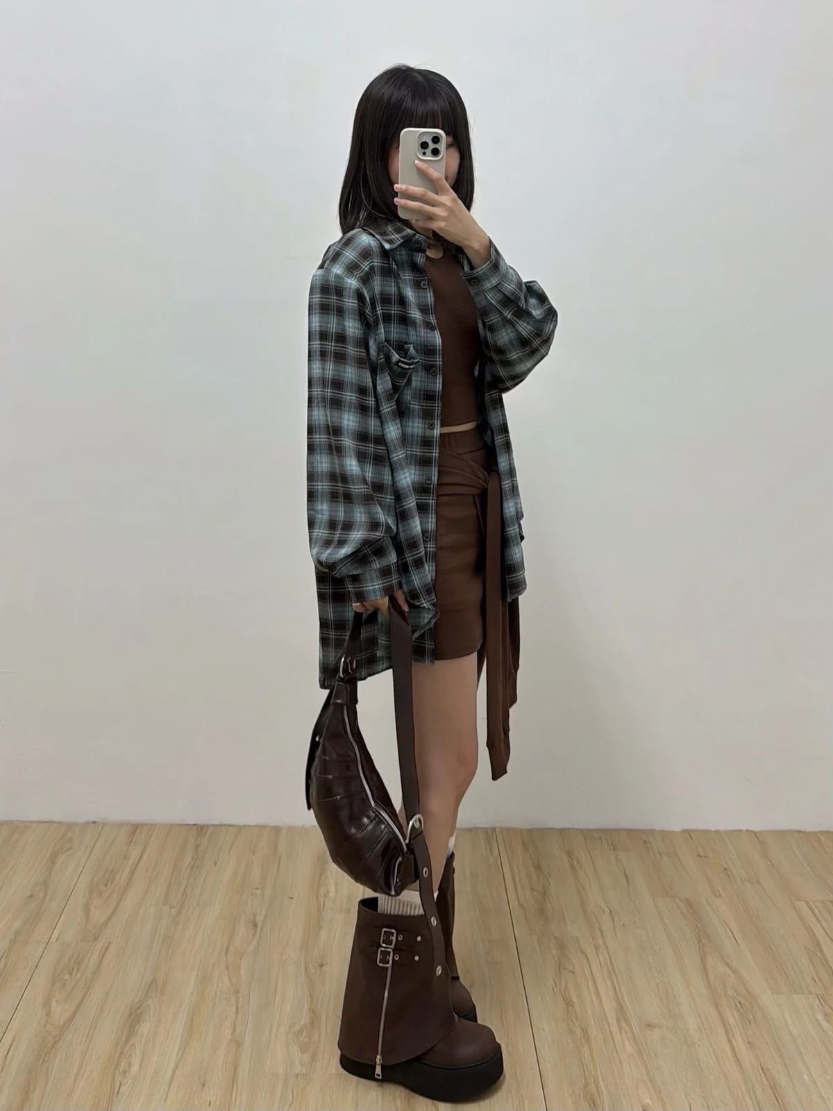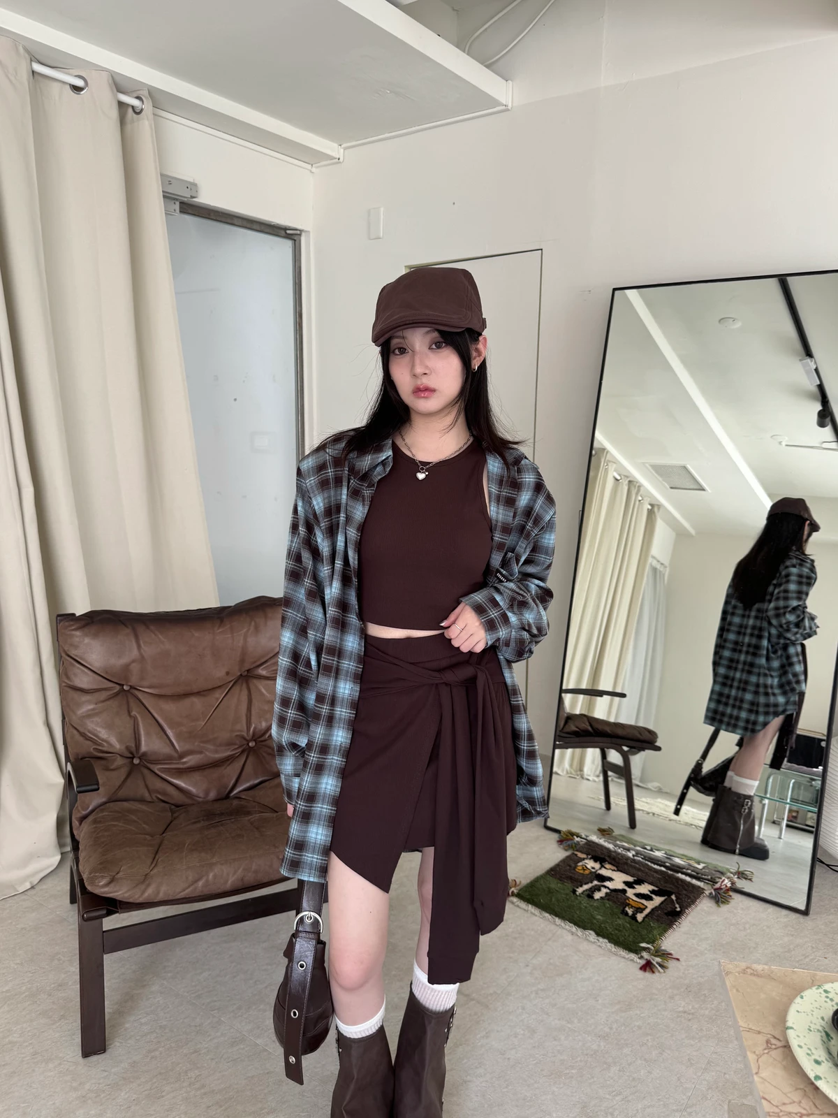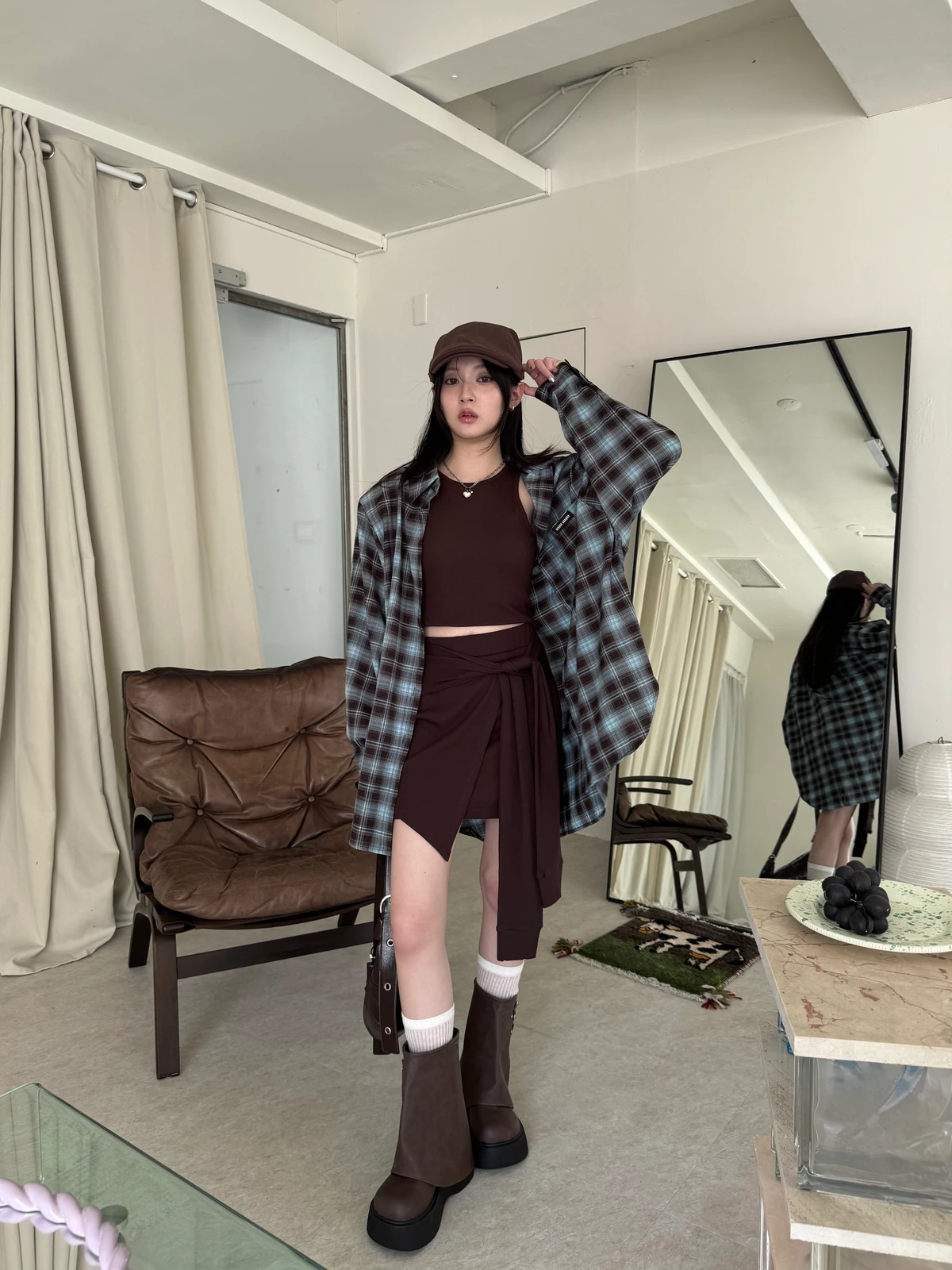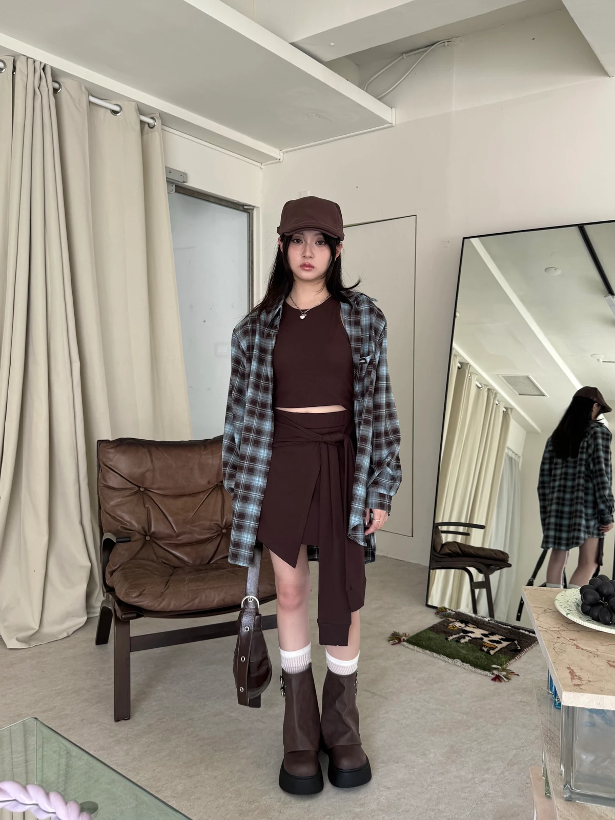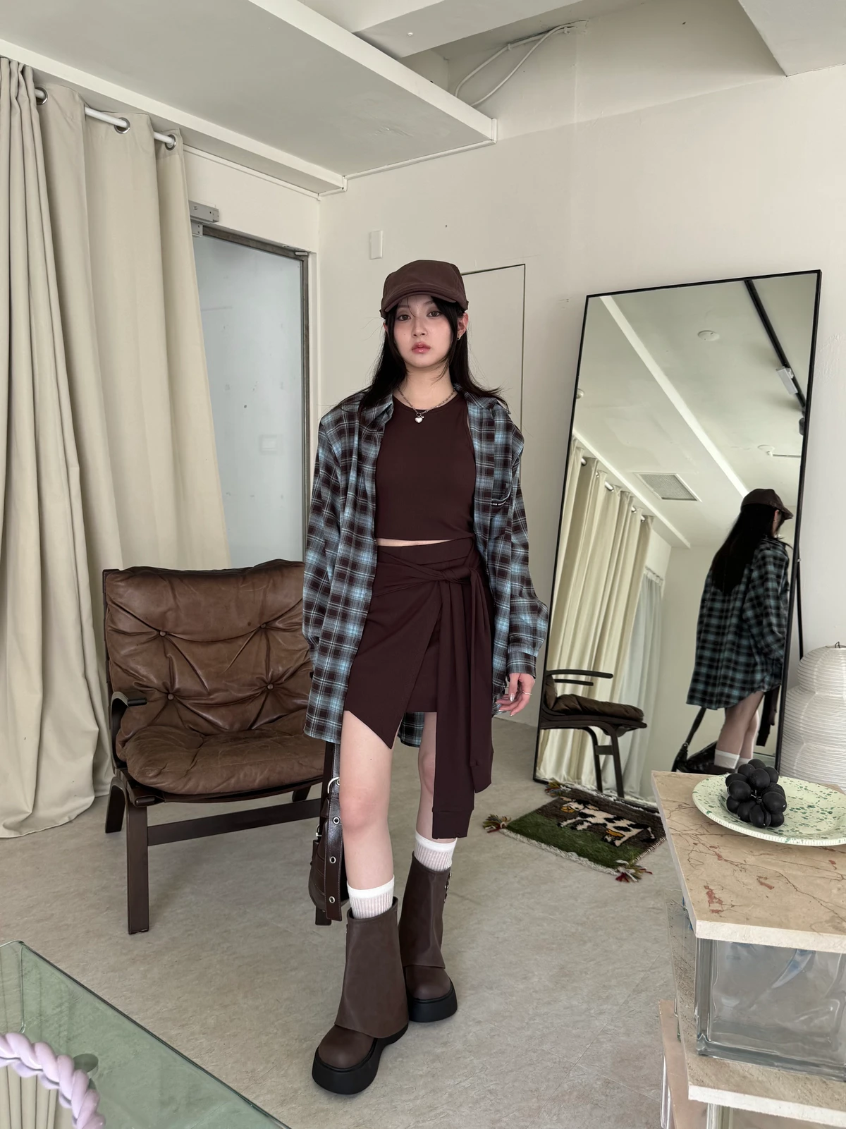 格紋襯衫+背心褲裙套裝三件式/咖啡