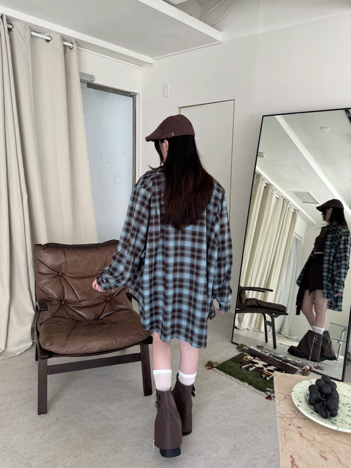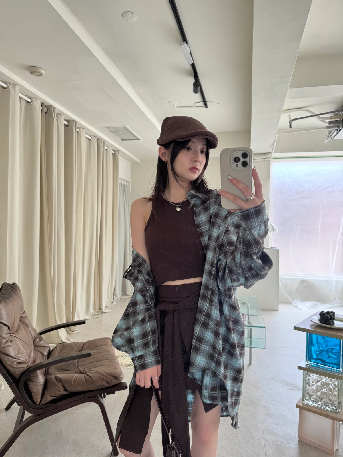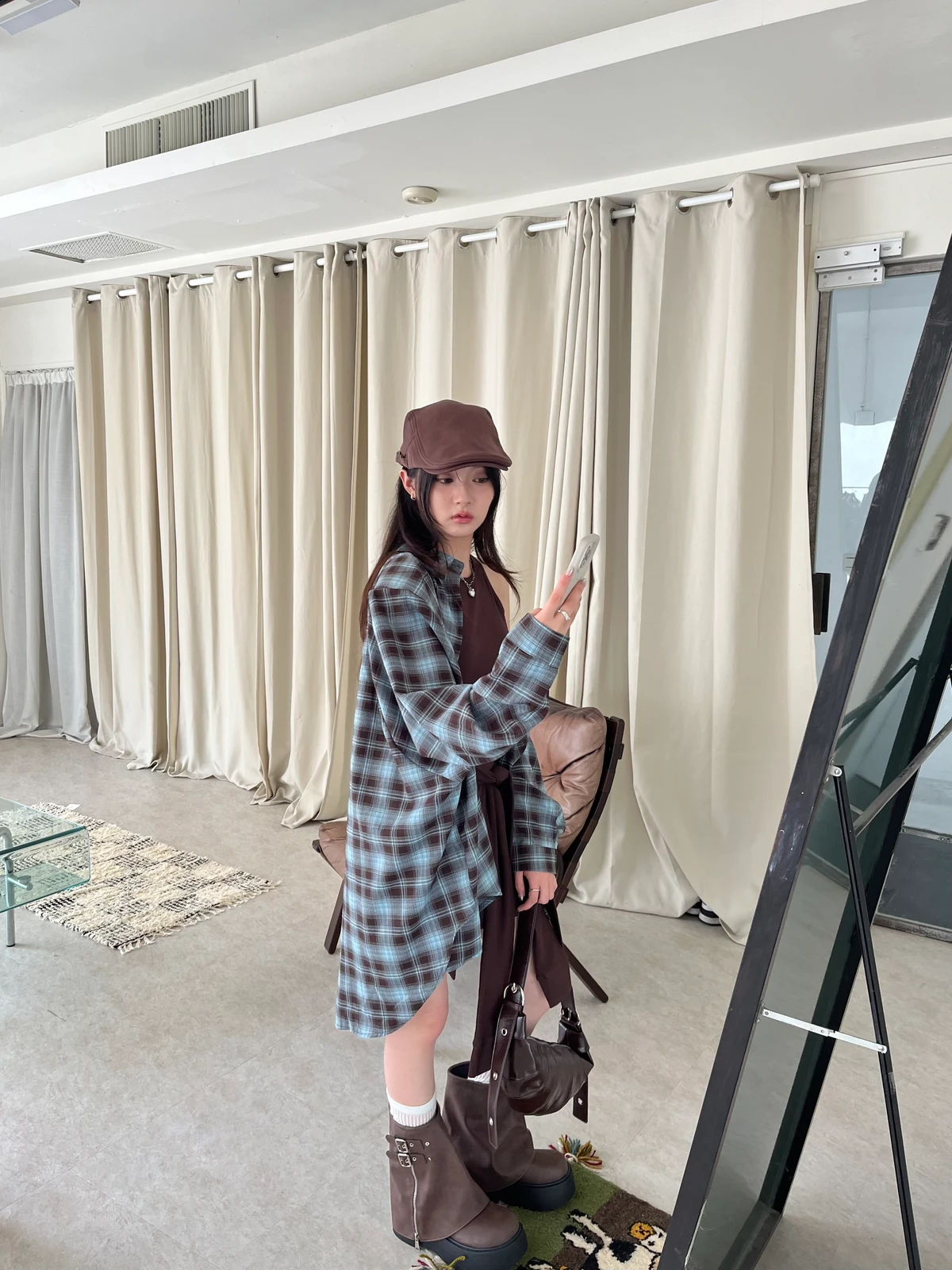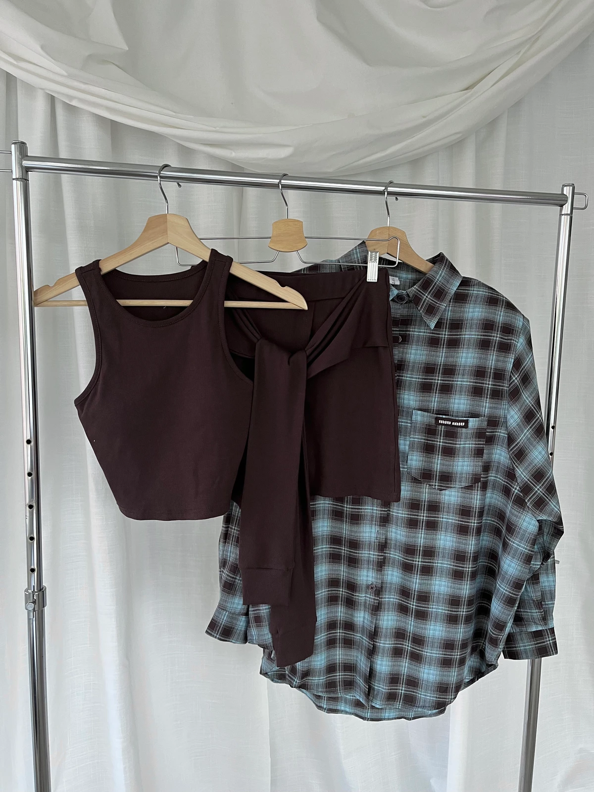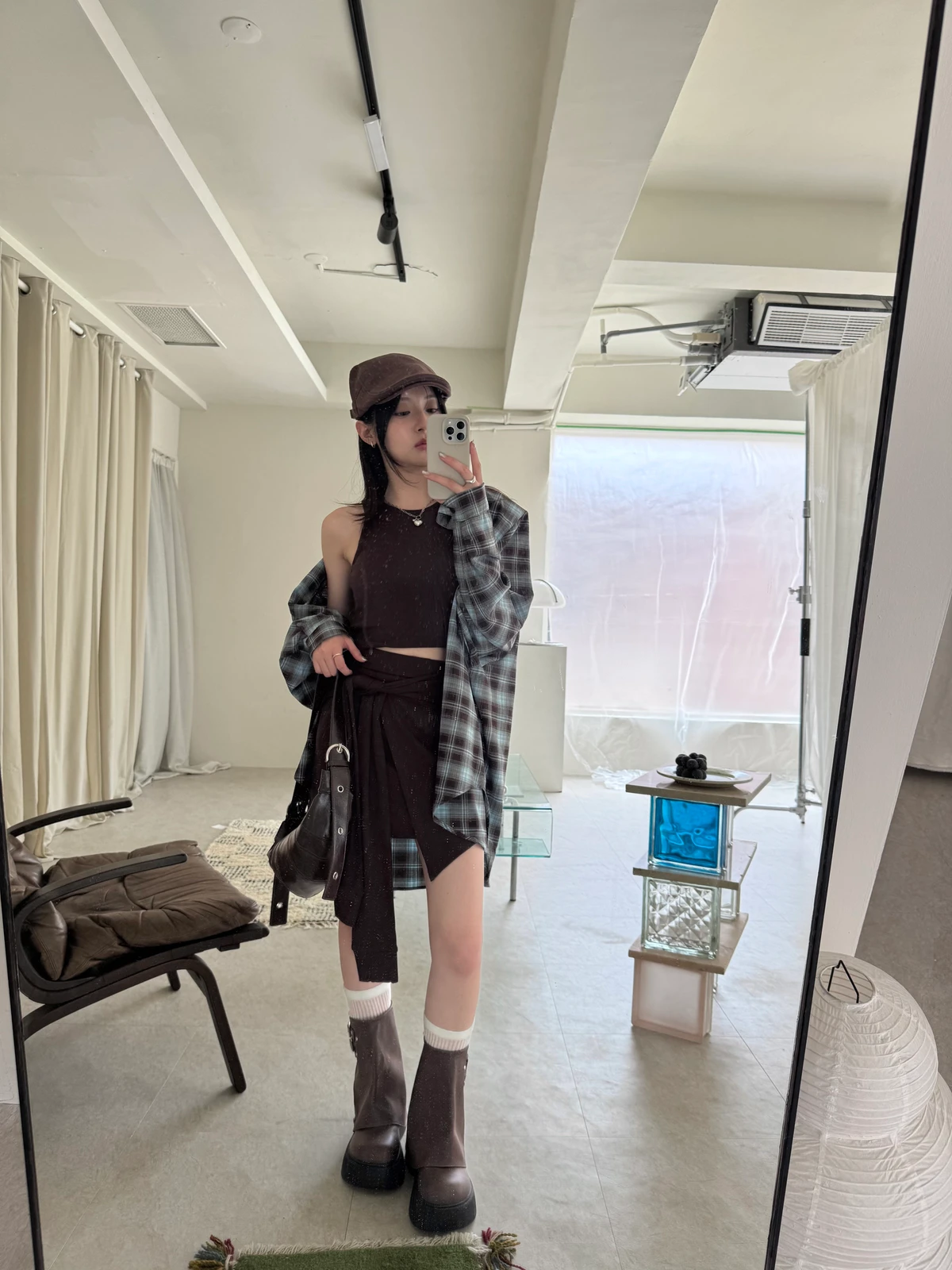 格紋襯衫+背心褲裙套裝三件式/咖啡