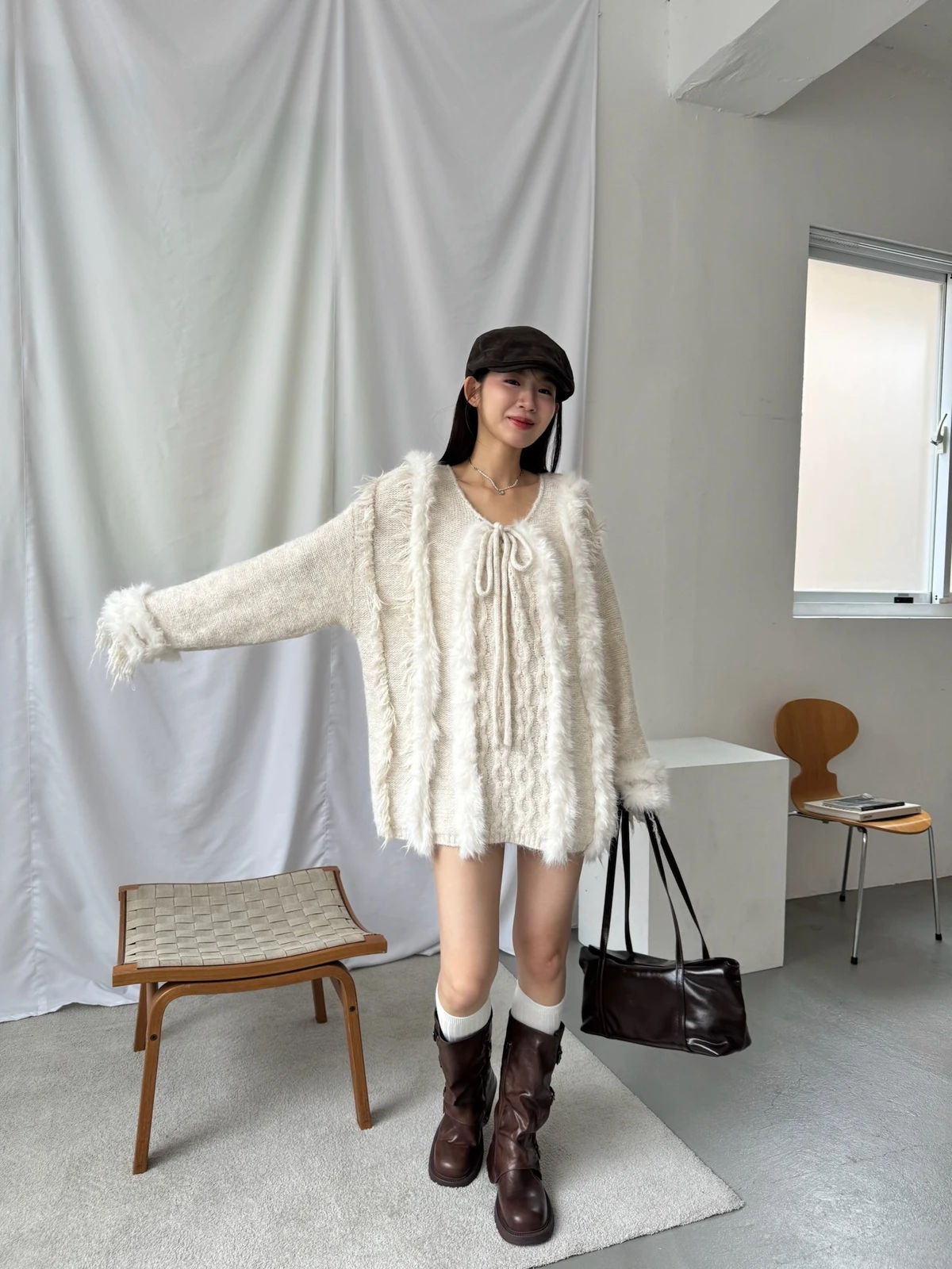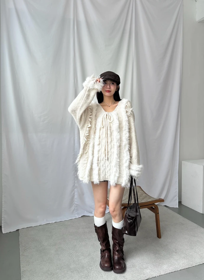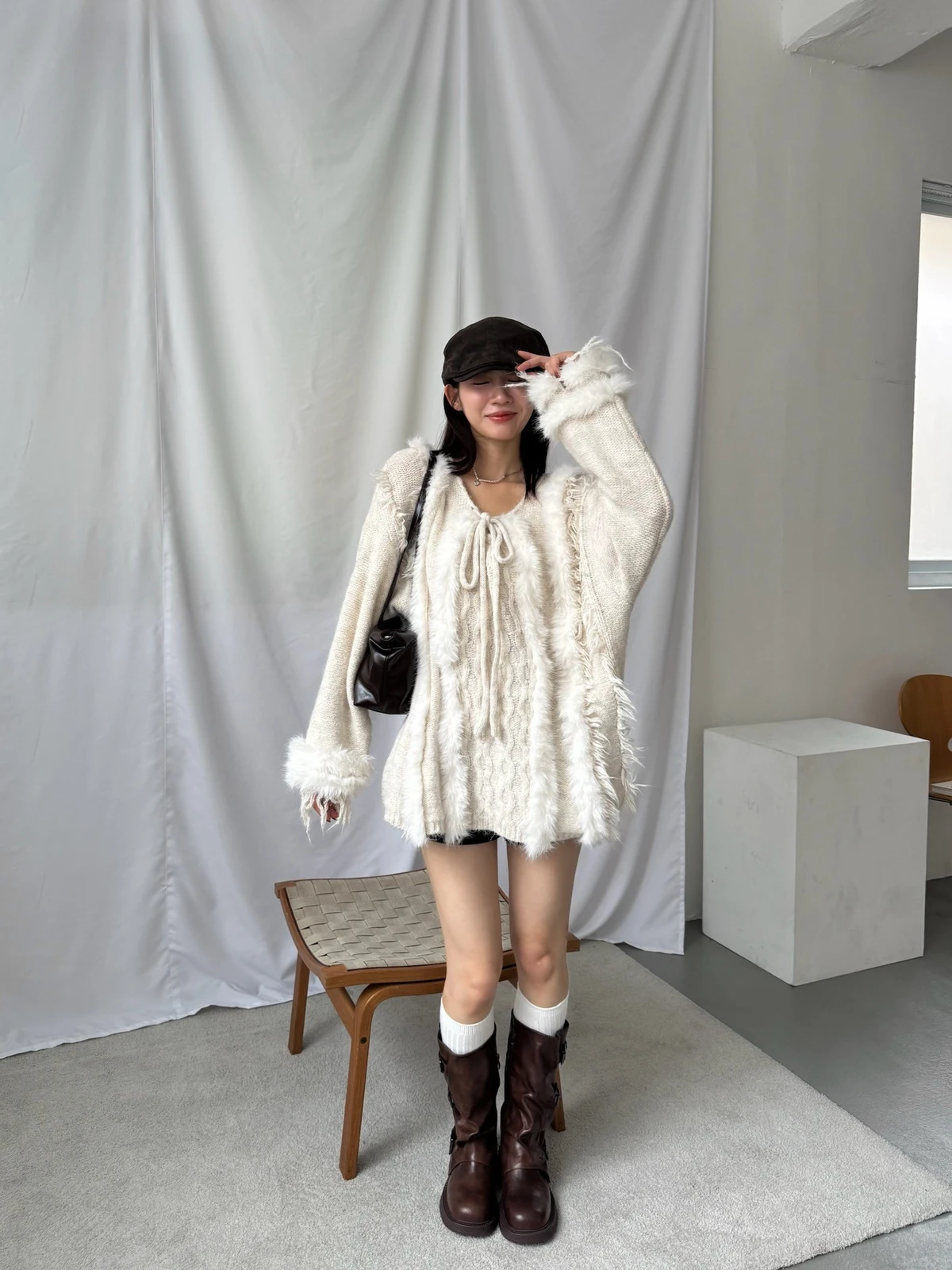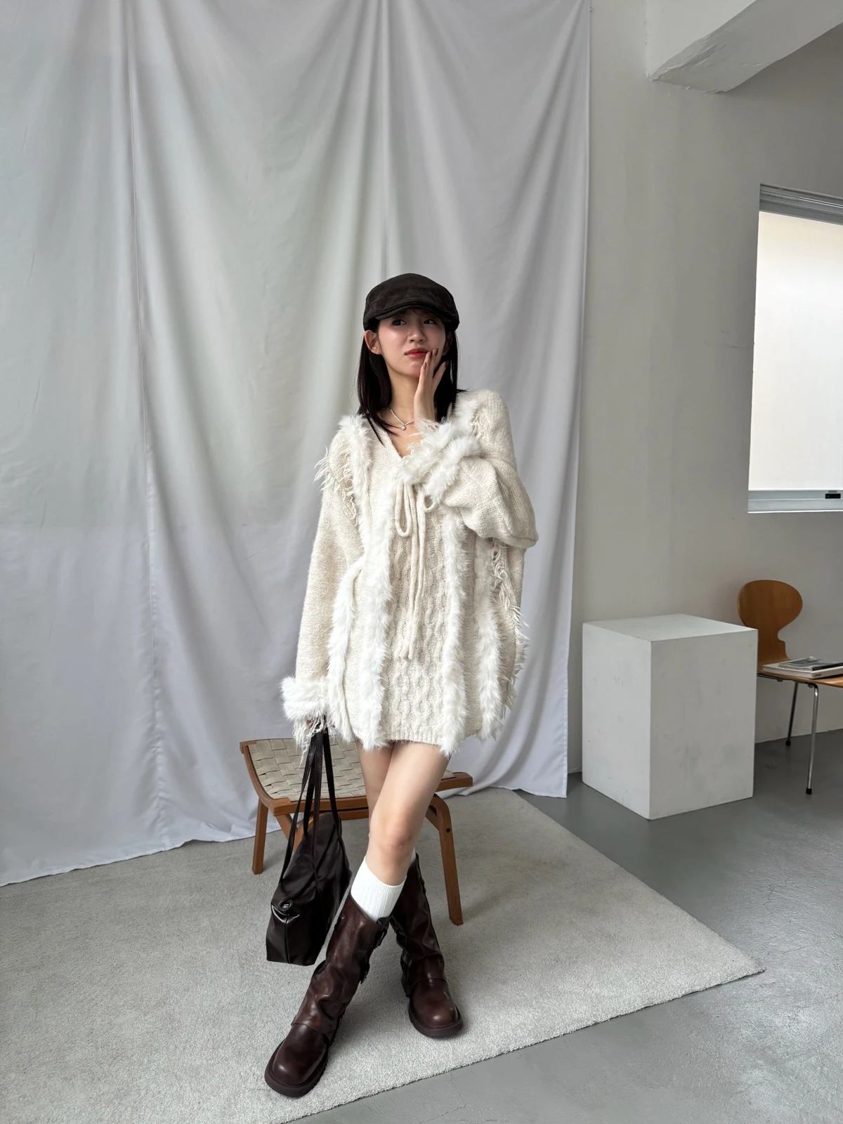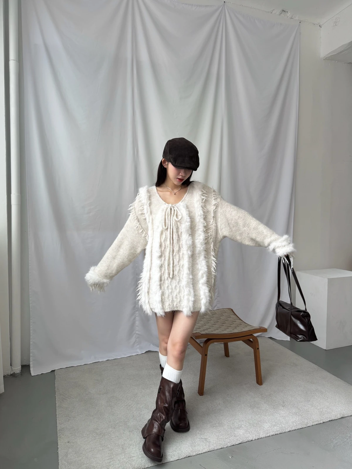 本期推薦!毛毛拼接針織設計綁繩毛衣