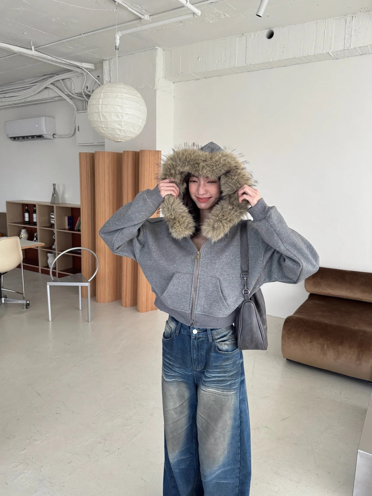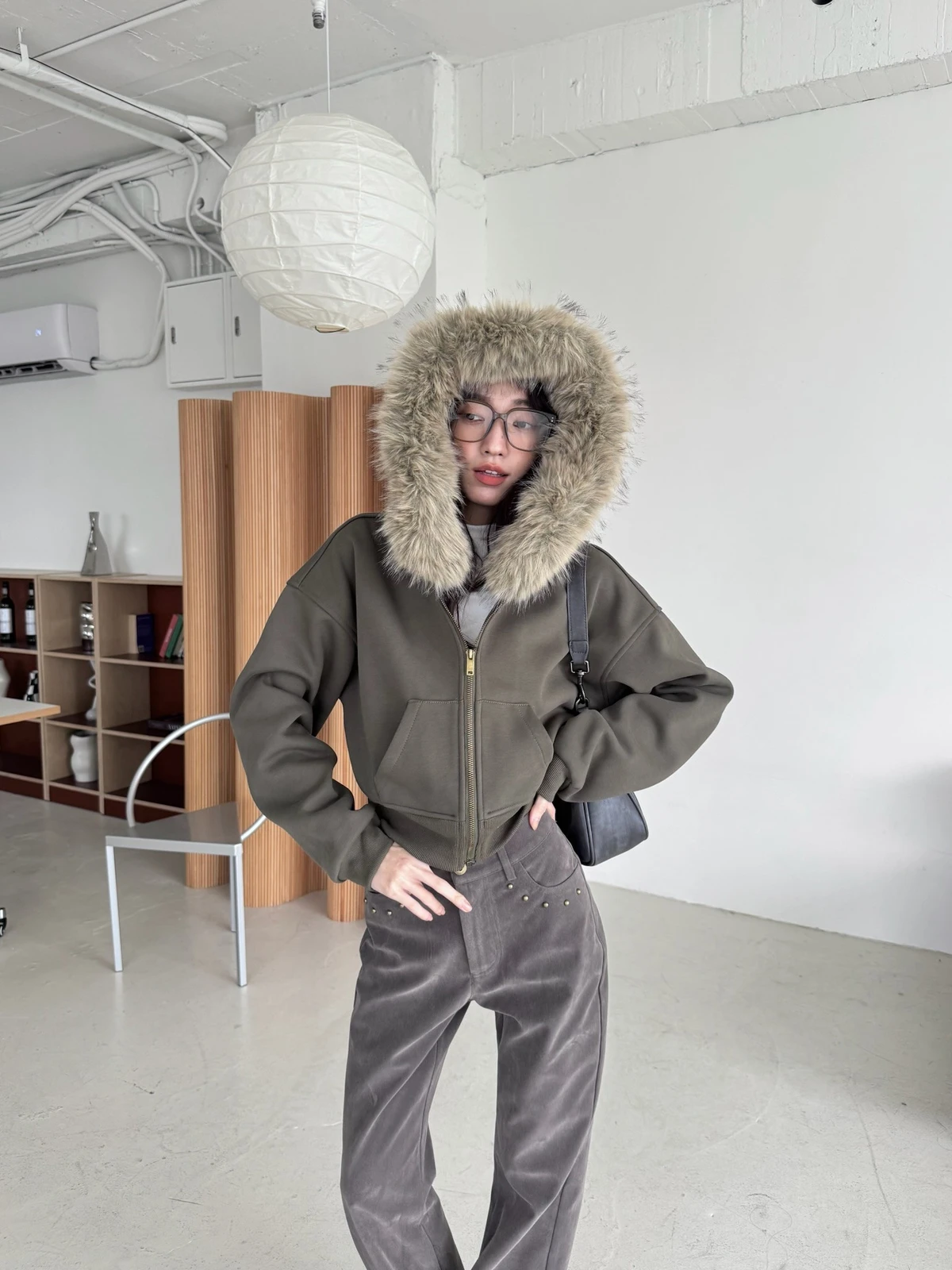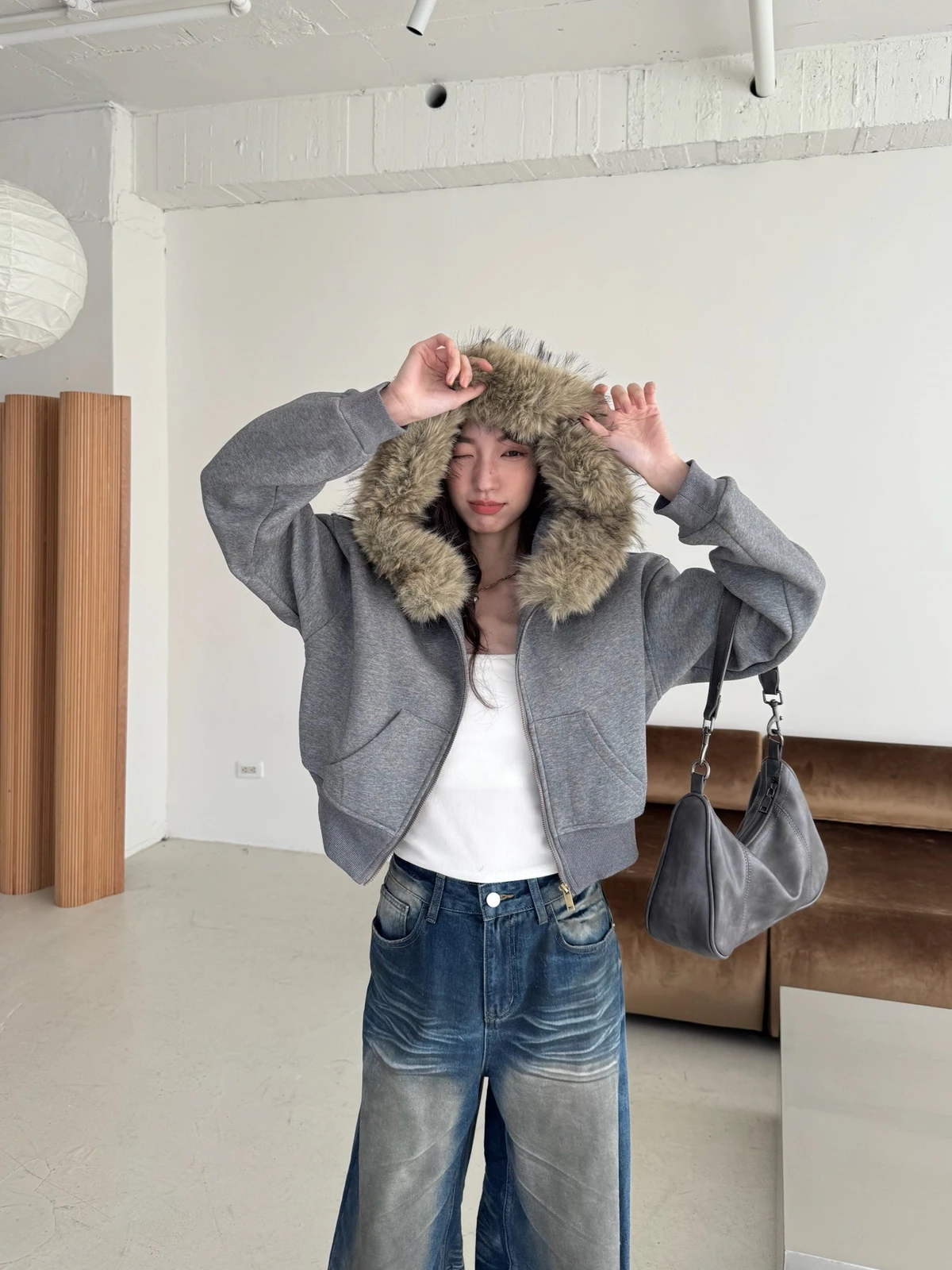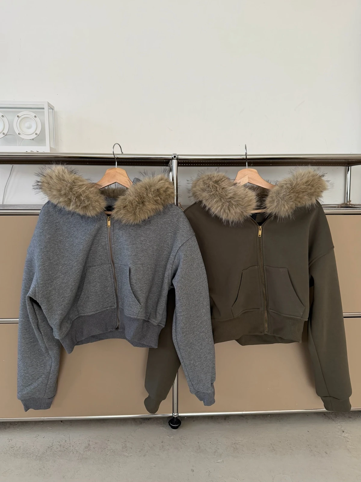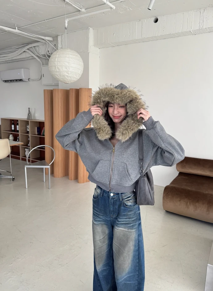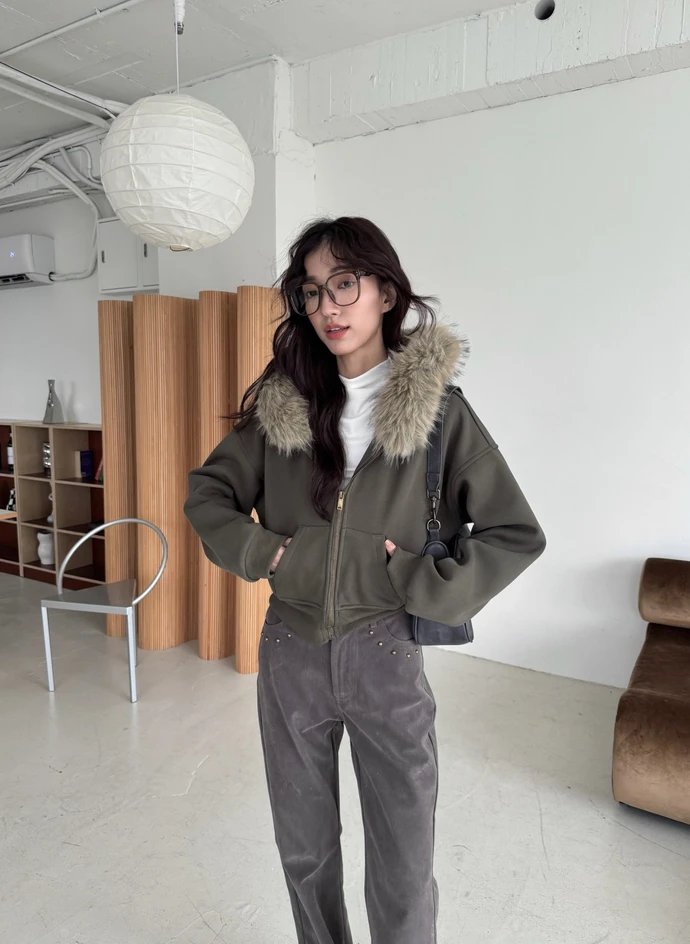 可拆式毛毛帽內磨毛拉鍊短版外套/2colors