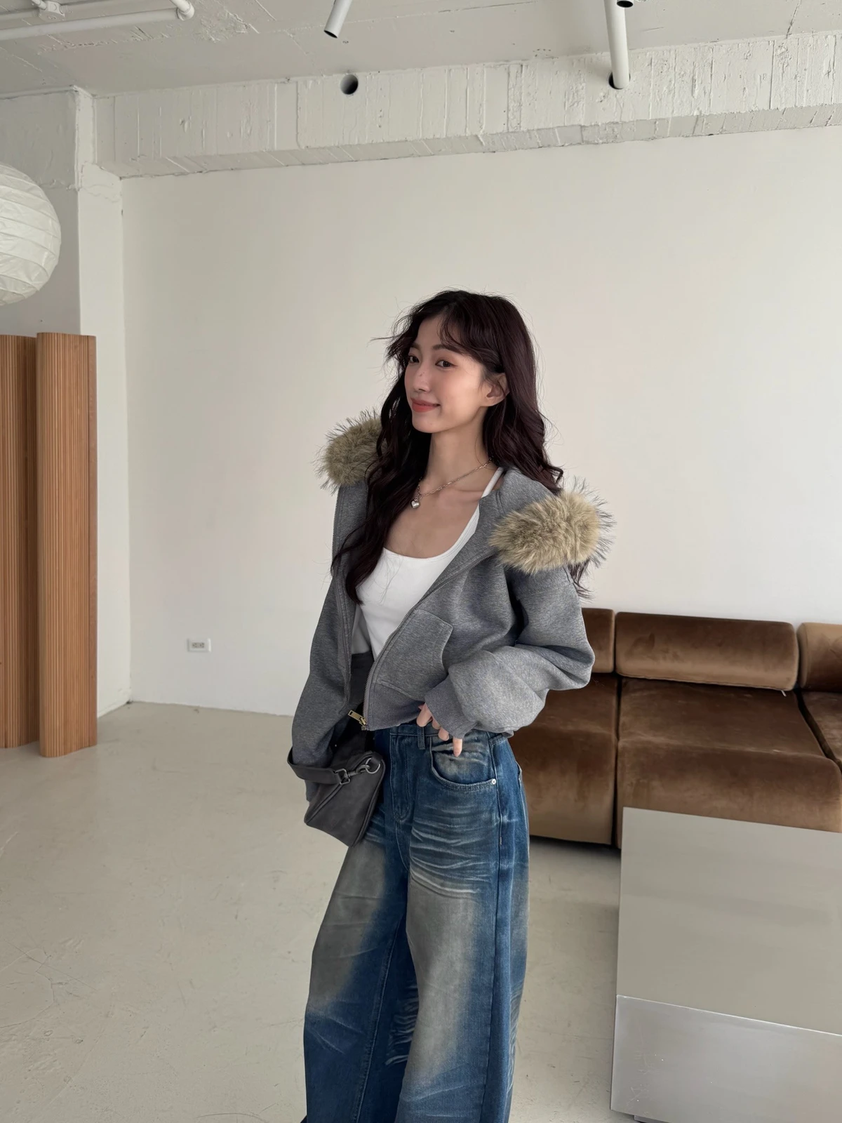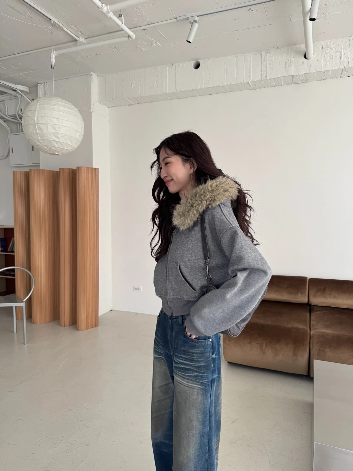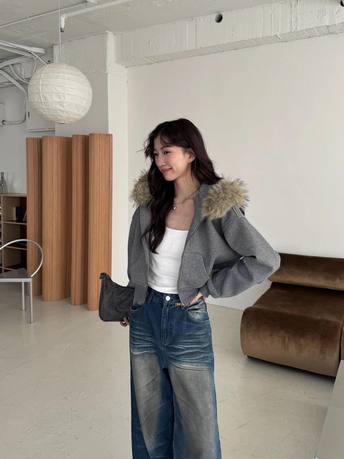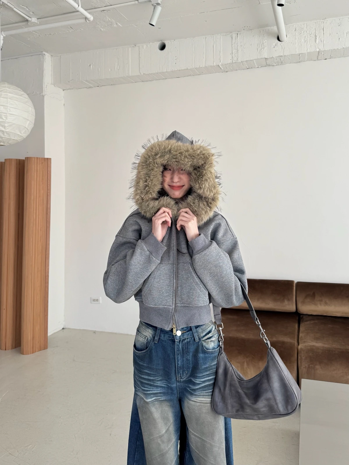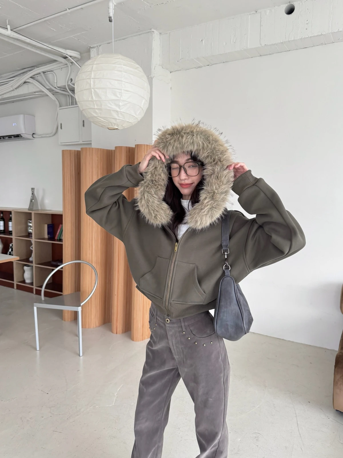 可拆式毛毛帽內磨毛拉鍊短版外套/2colors