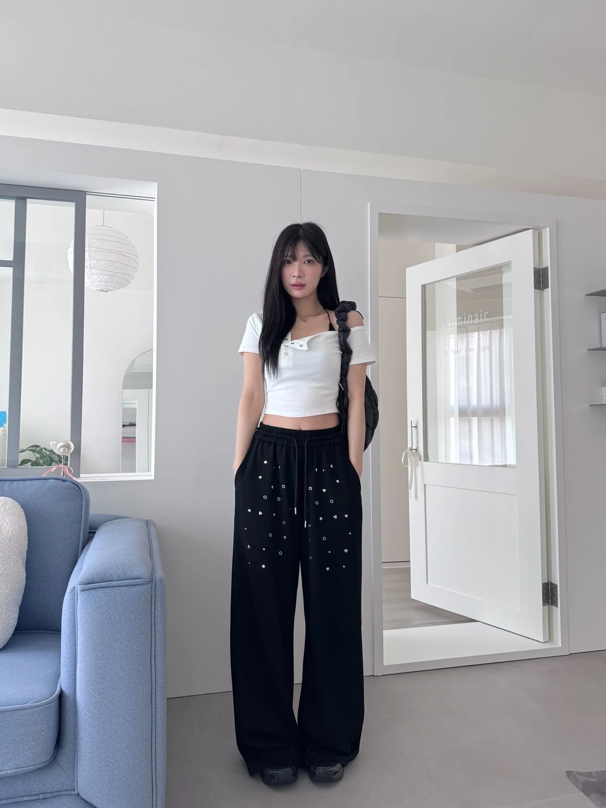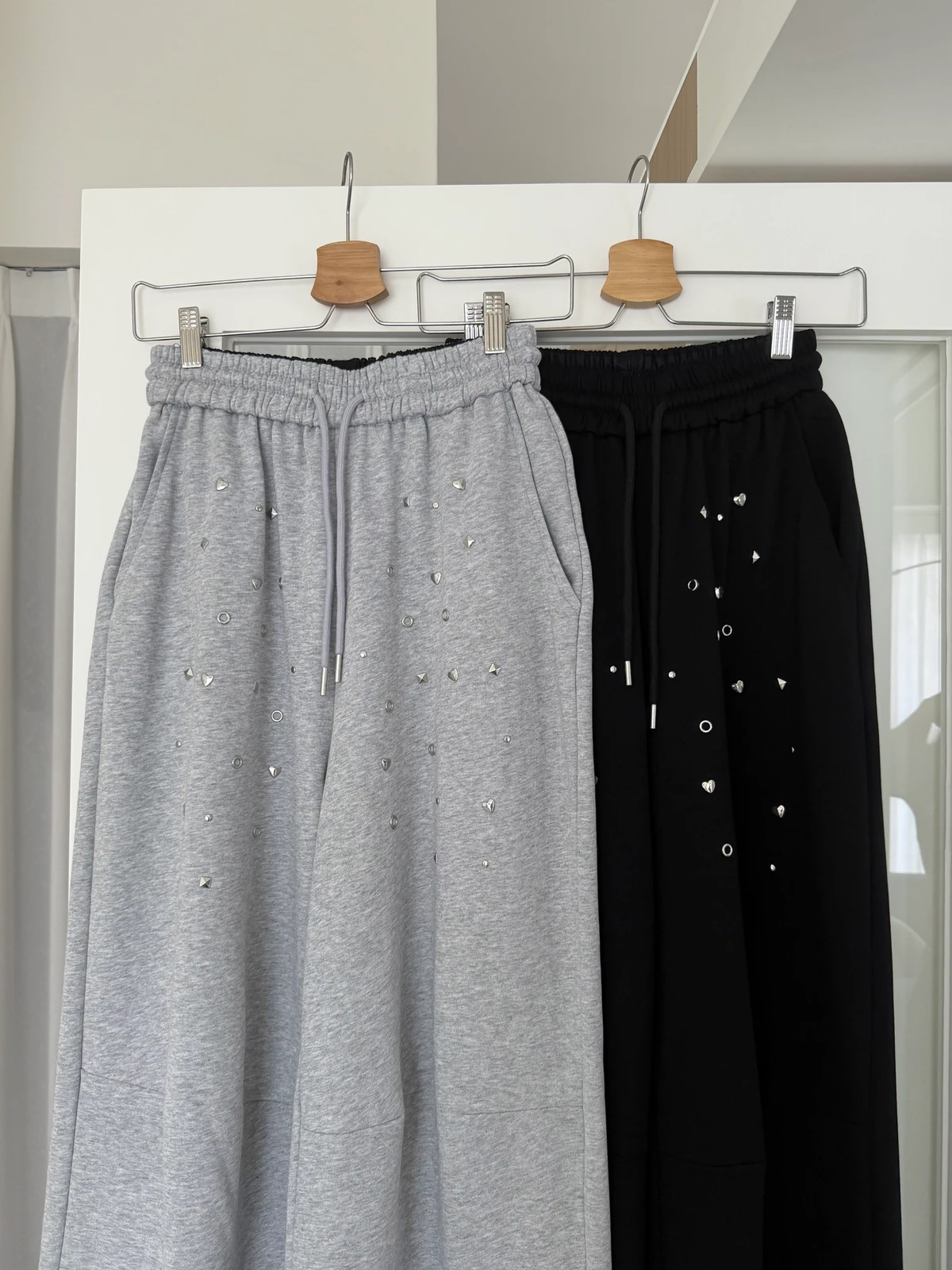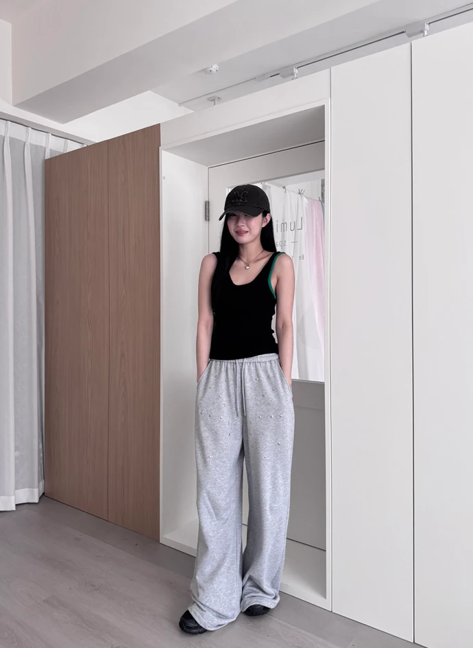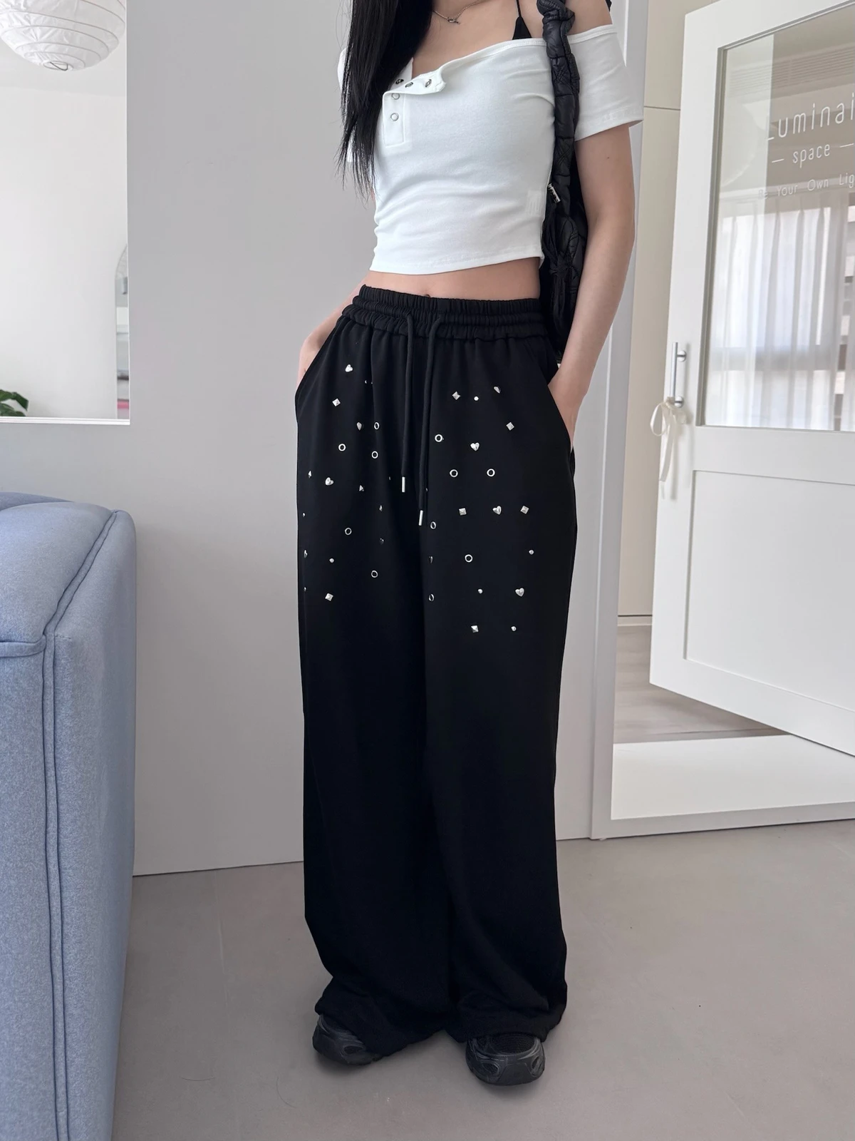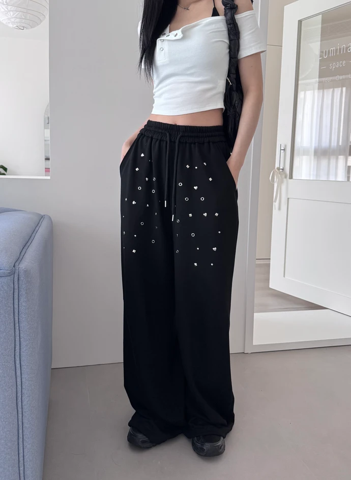 圖案鉚釘腰鬆緊落地棉褲/2colors