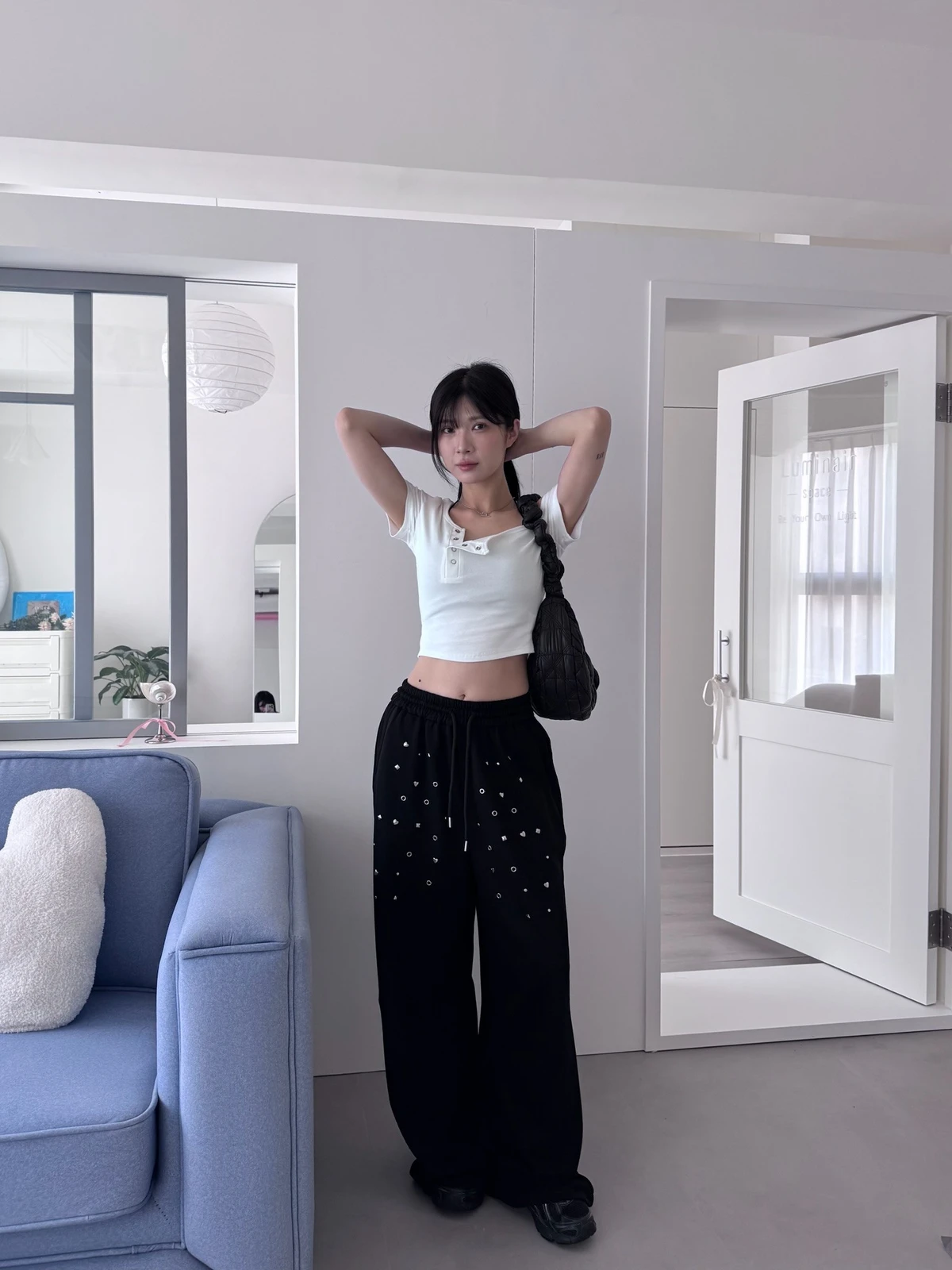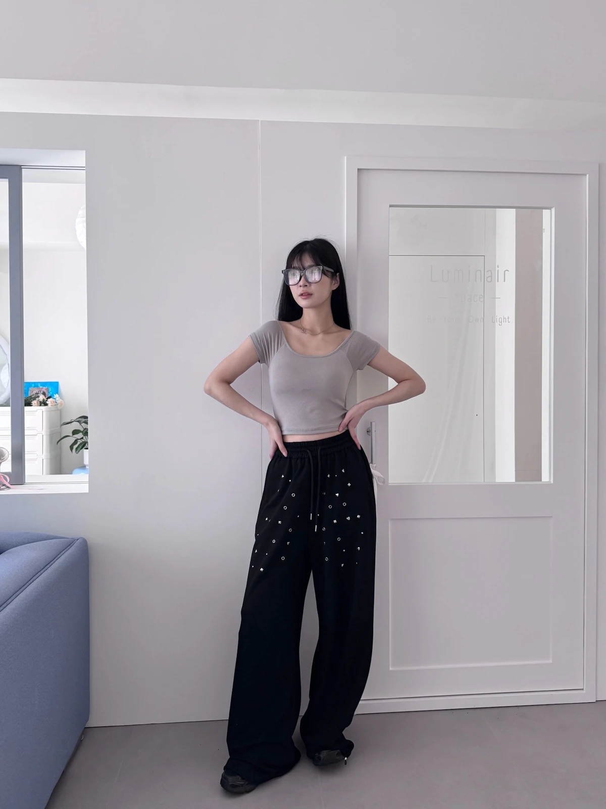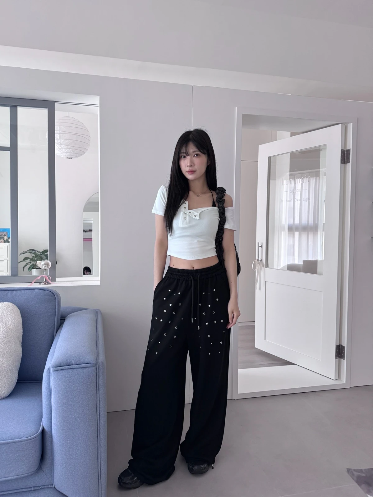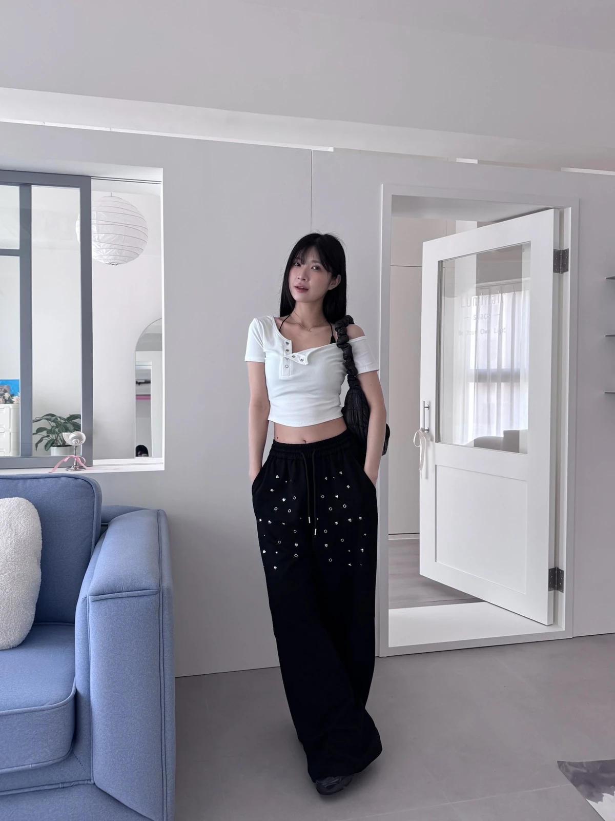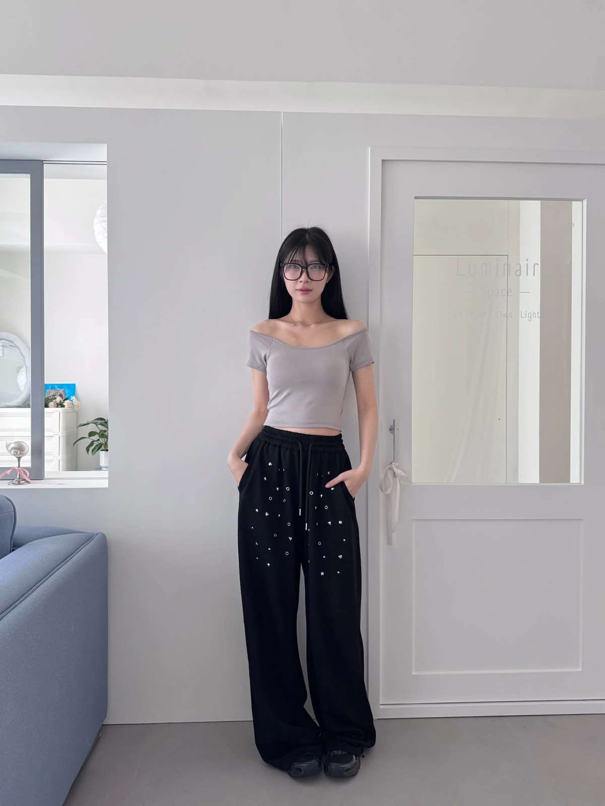 圖案鉚釘腰鬆緊落地棉褲/2colors