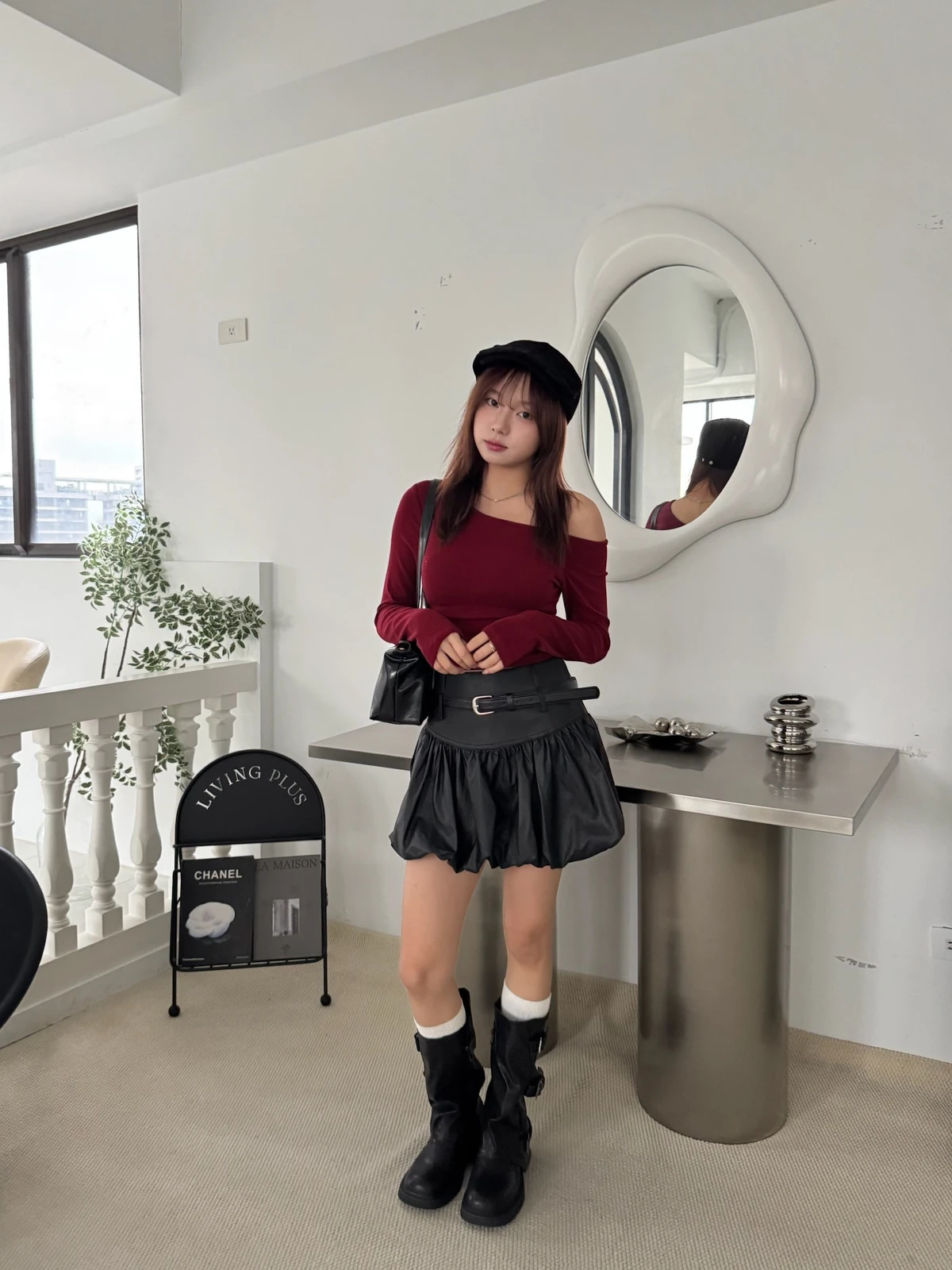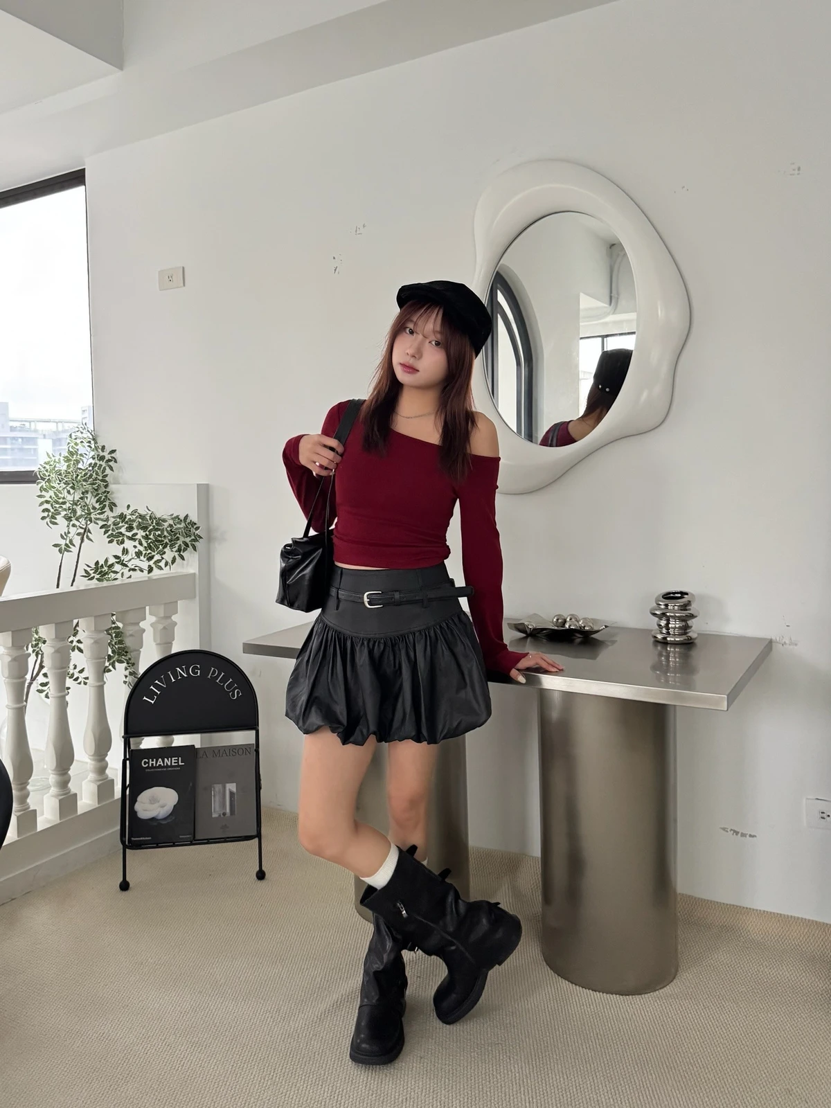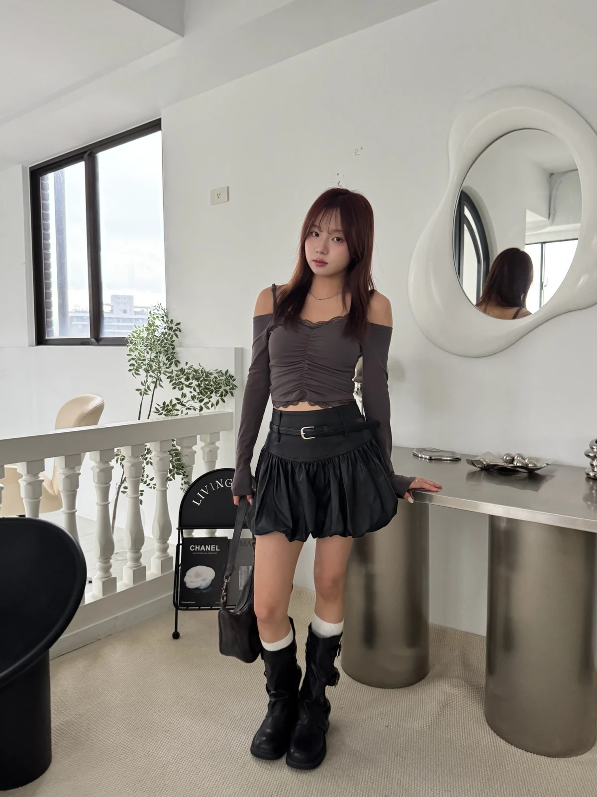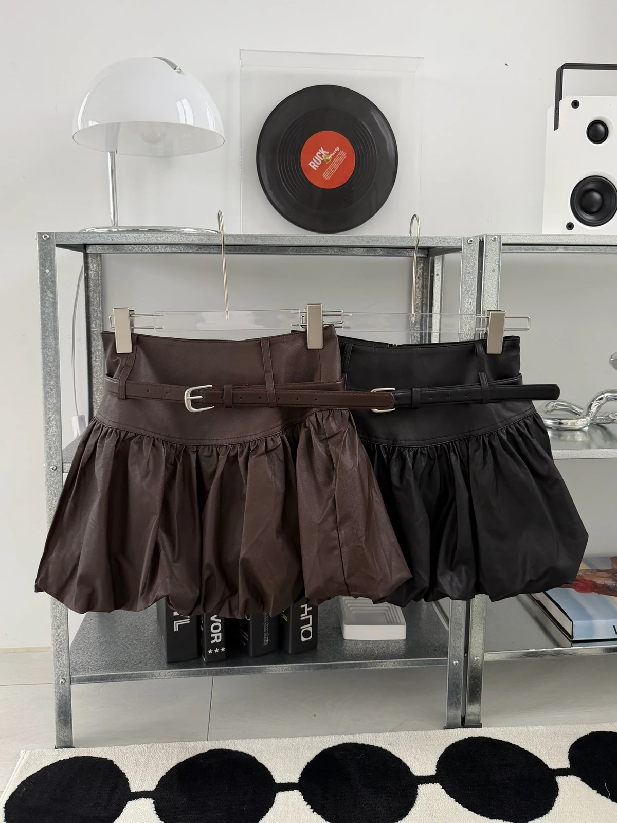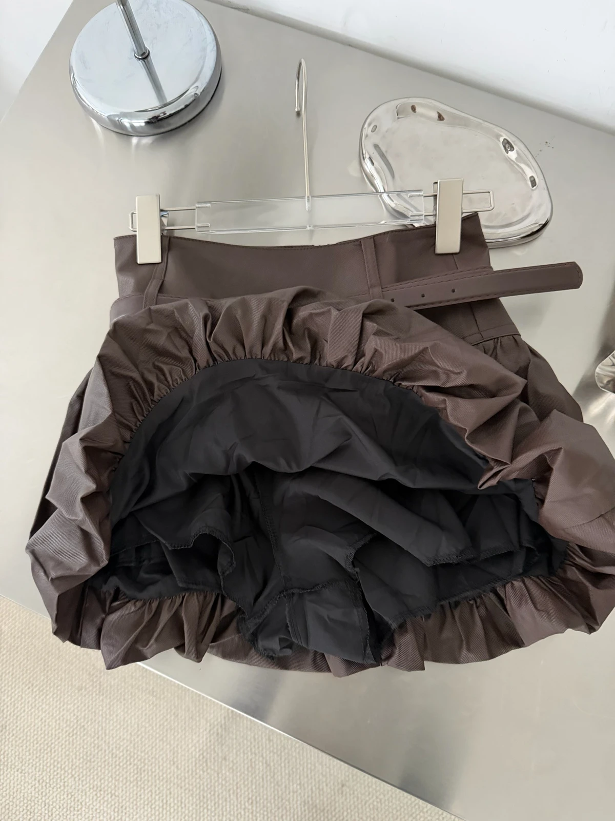 霧感皮革花苞短褲裙-附皮帶/2colors