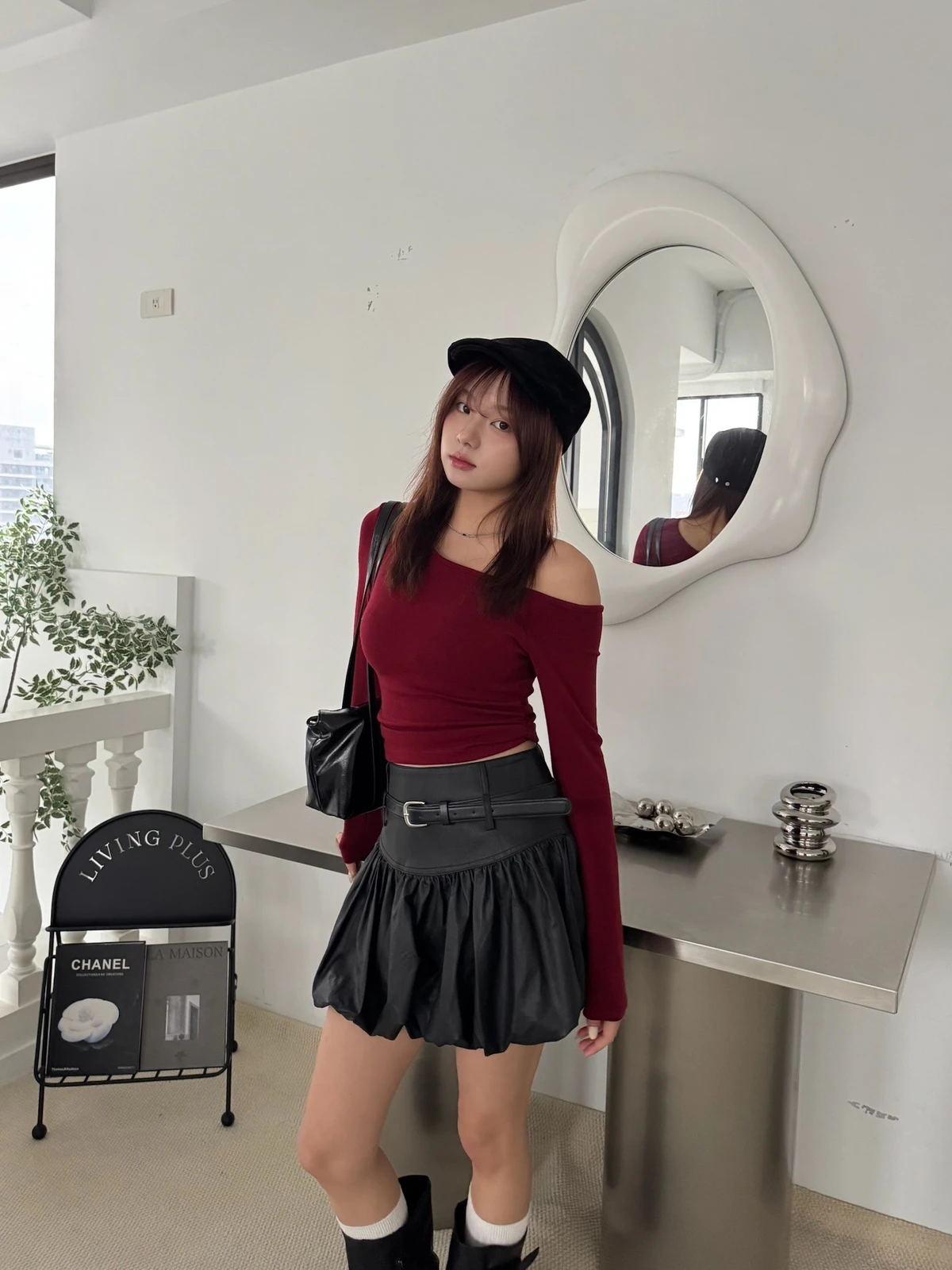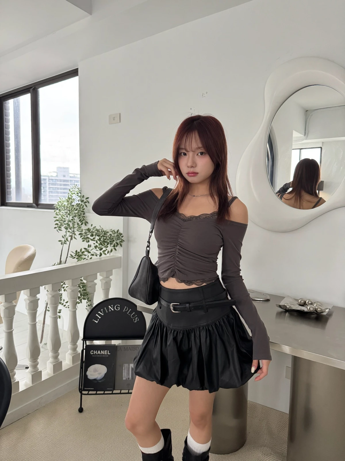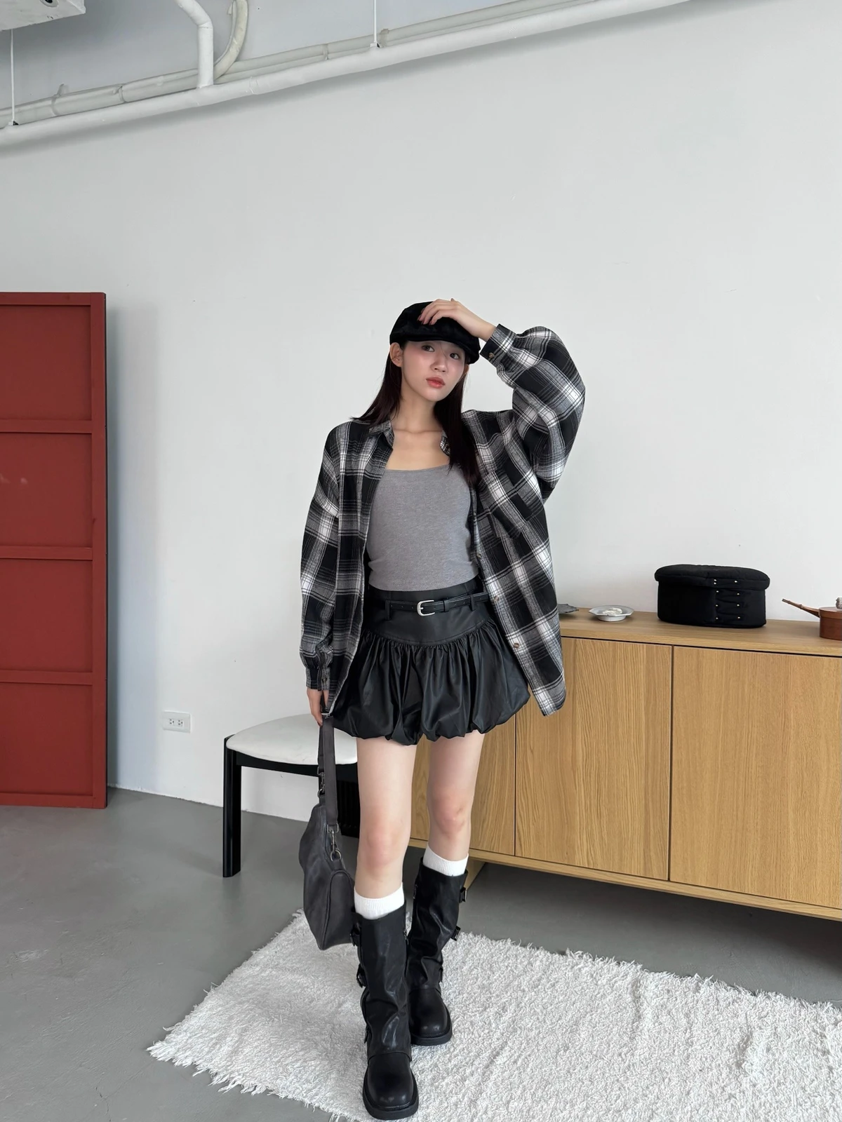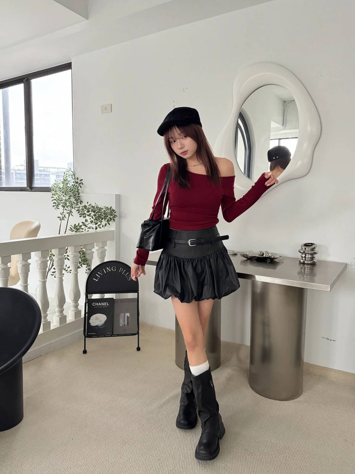 霧感皮革花苞短褲裙-附皮帶/2colors
