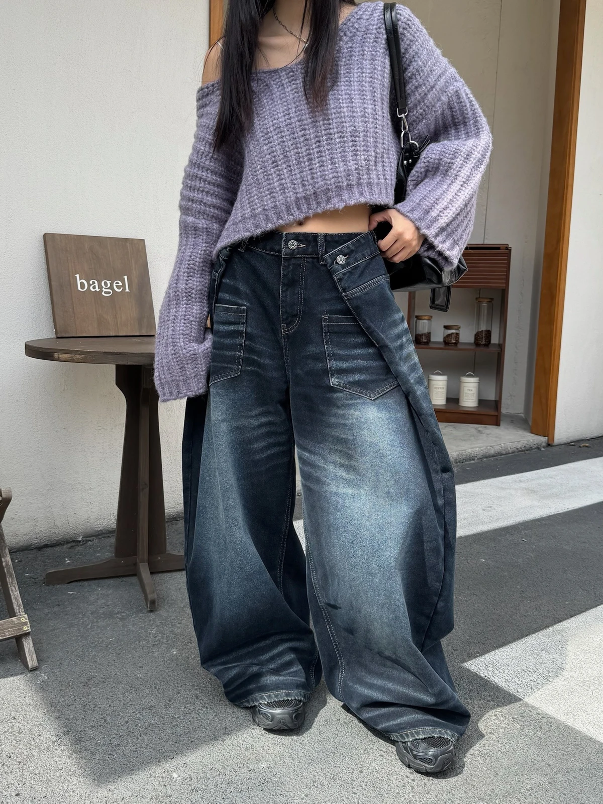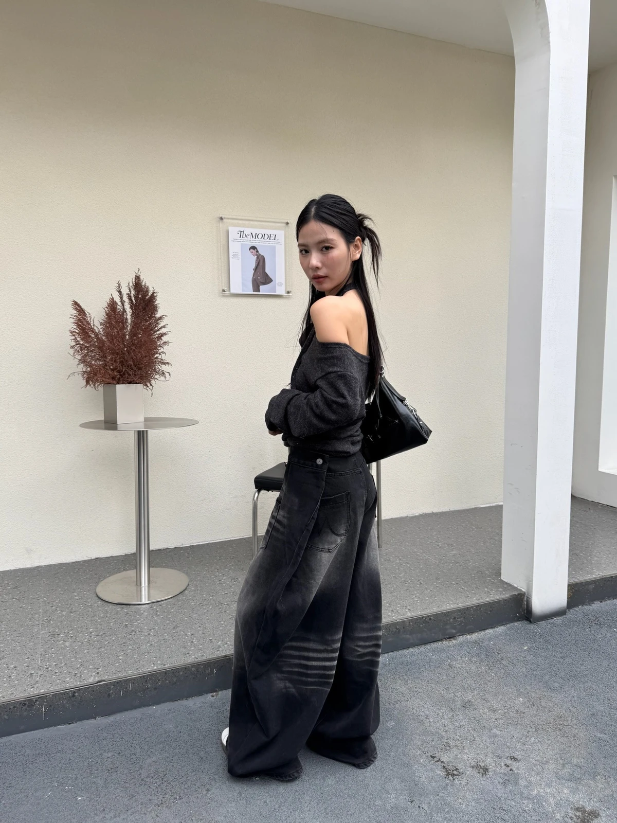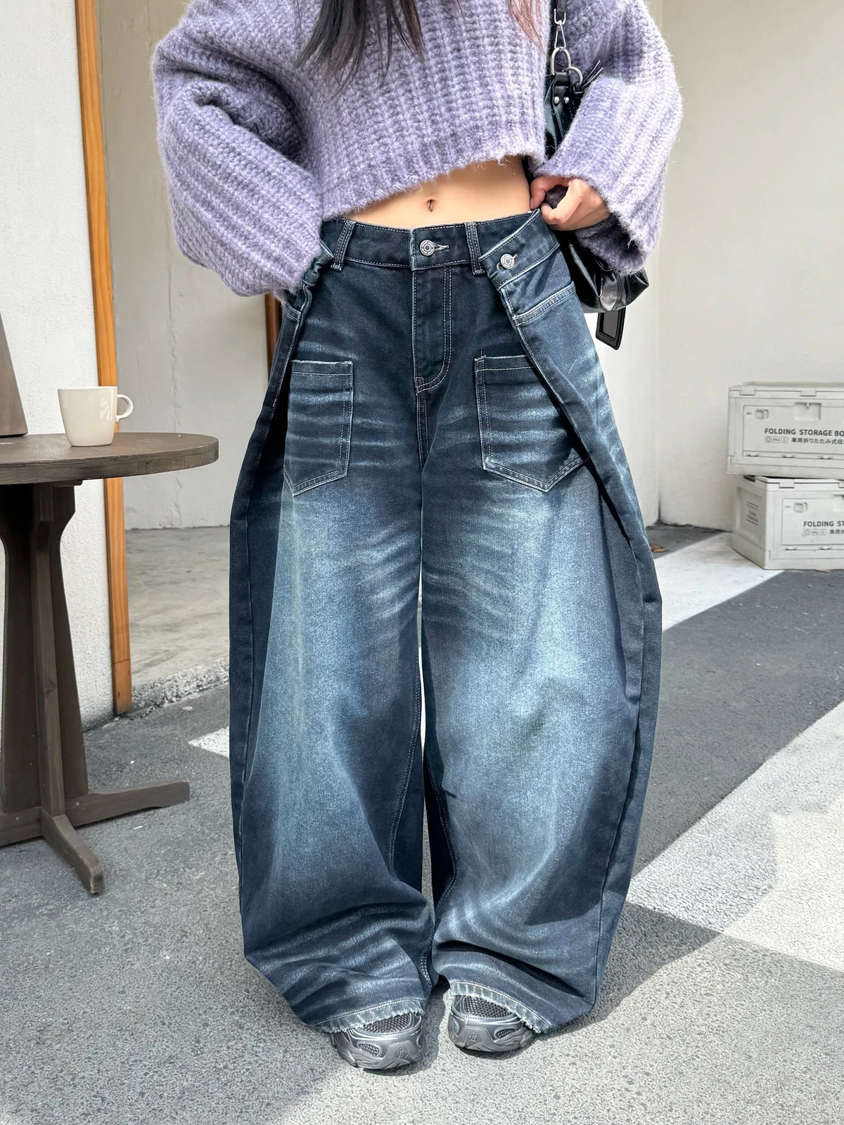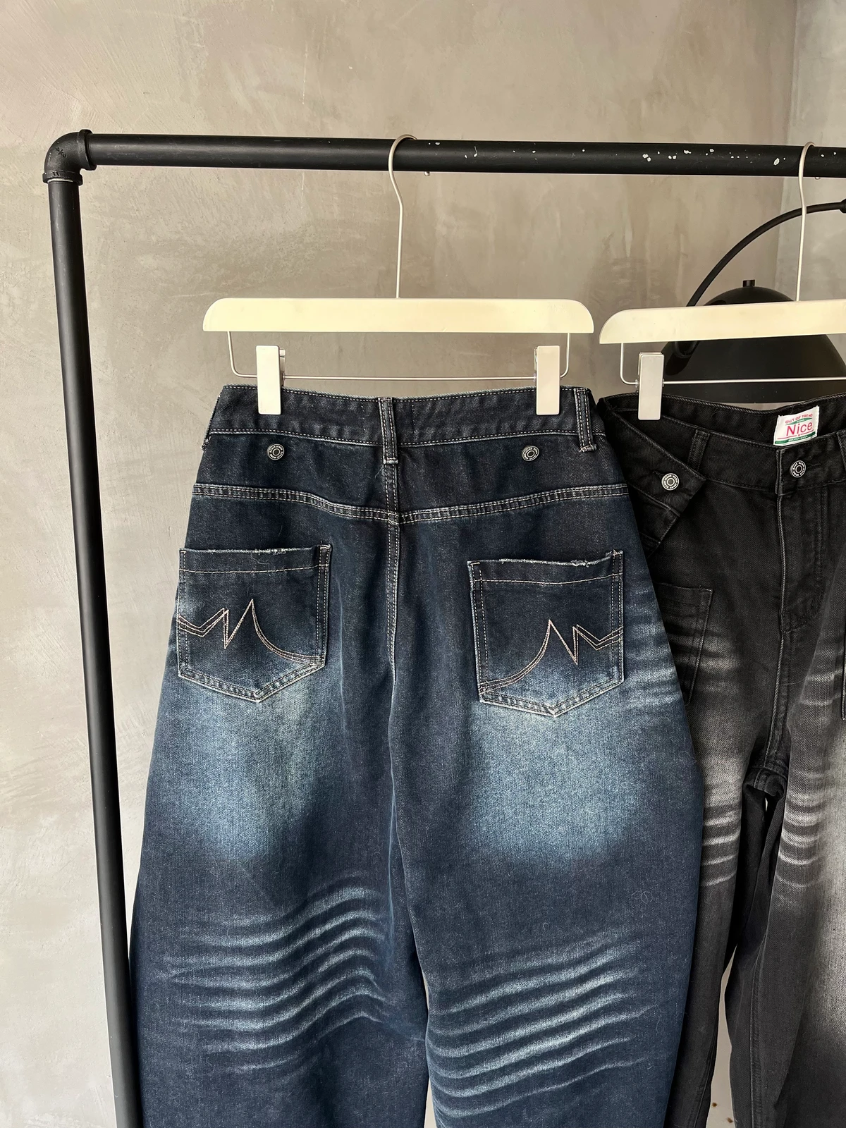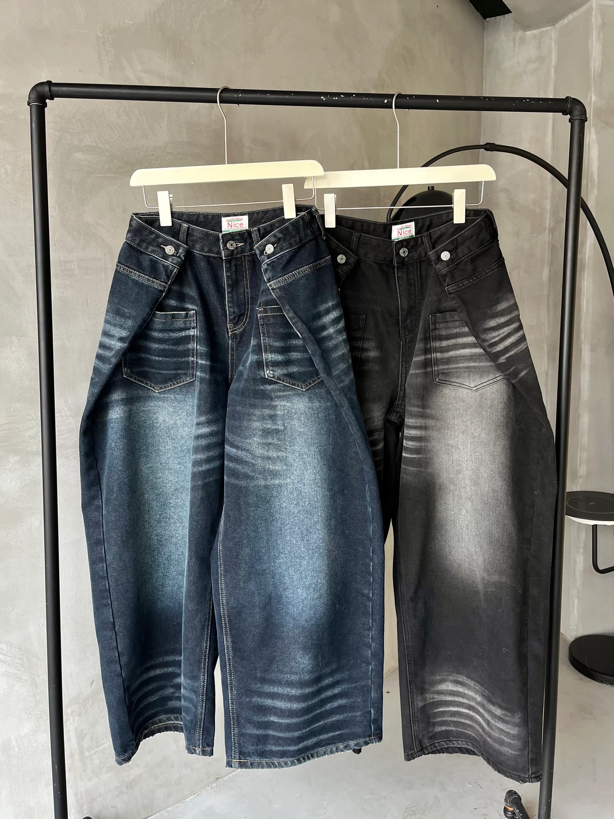 疊腰兩穿寬鬆彎刀牛仔長褲/2colors
