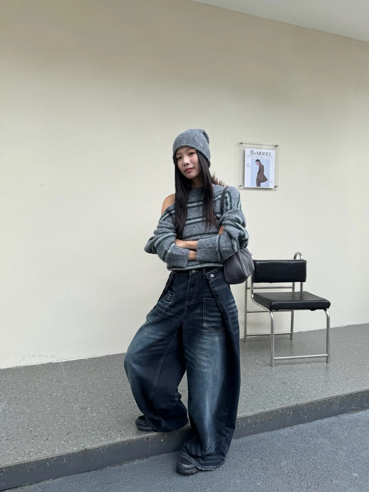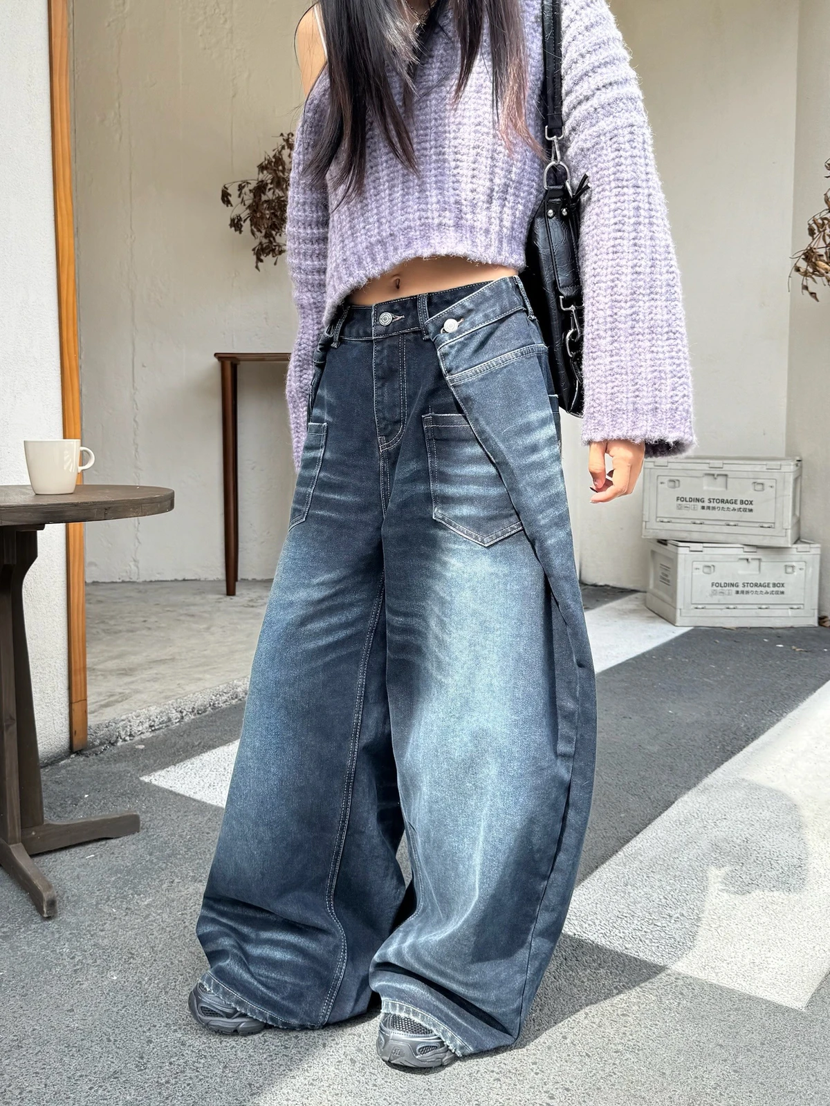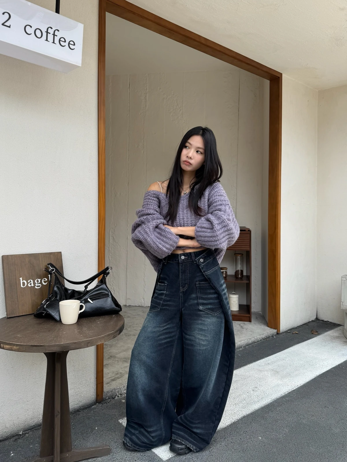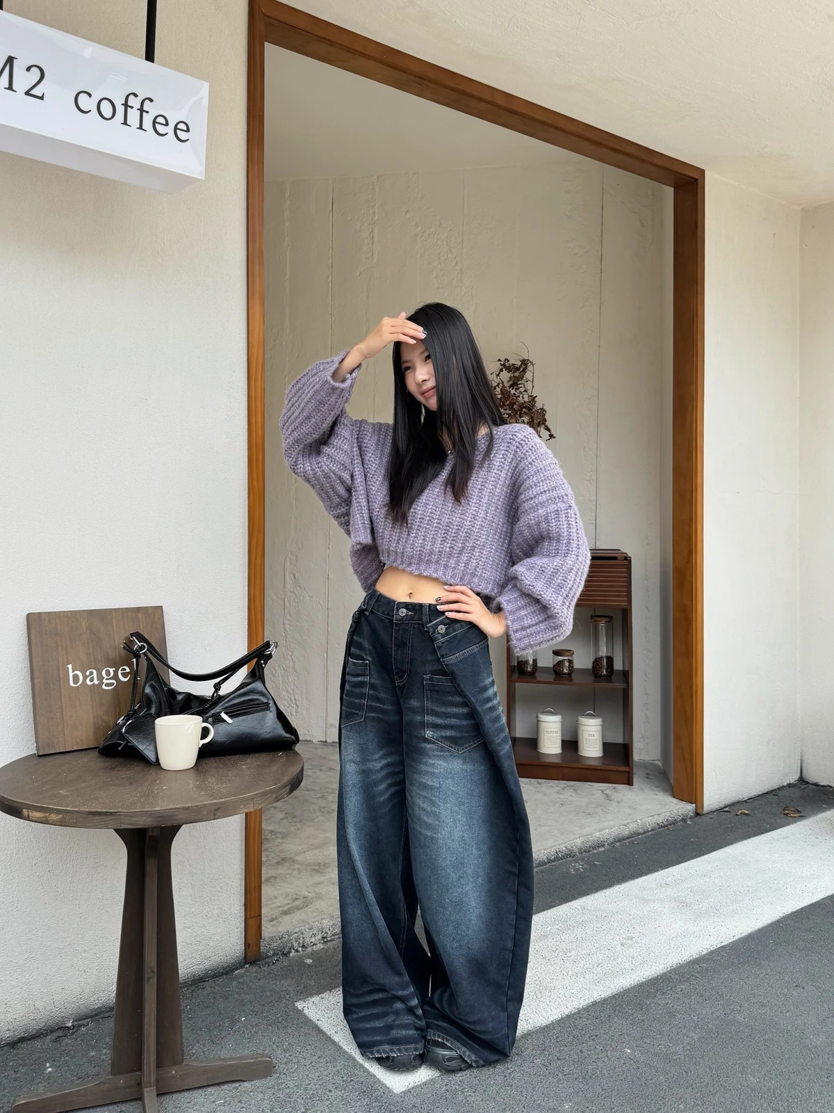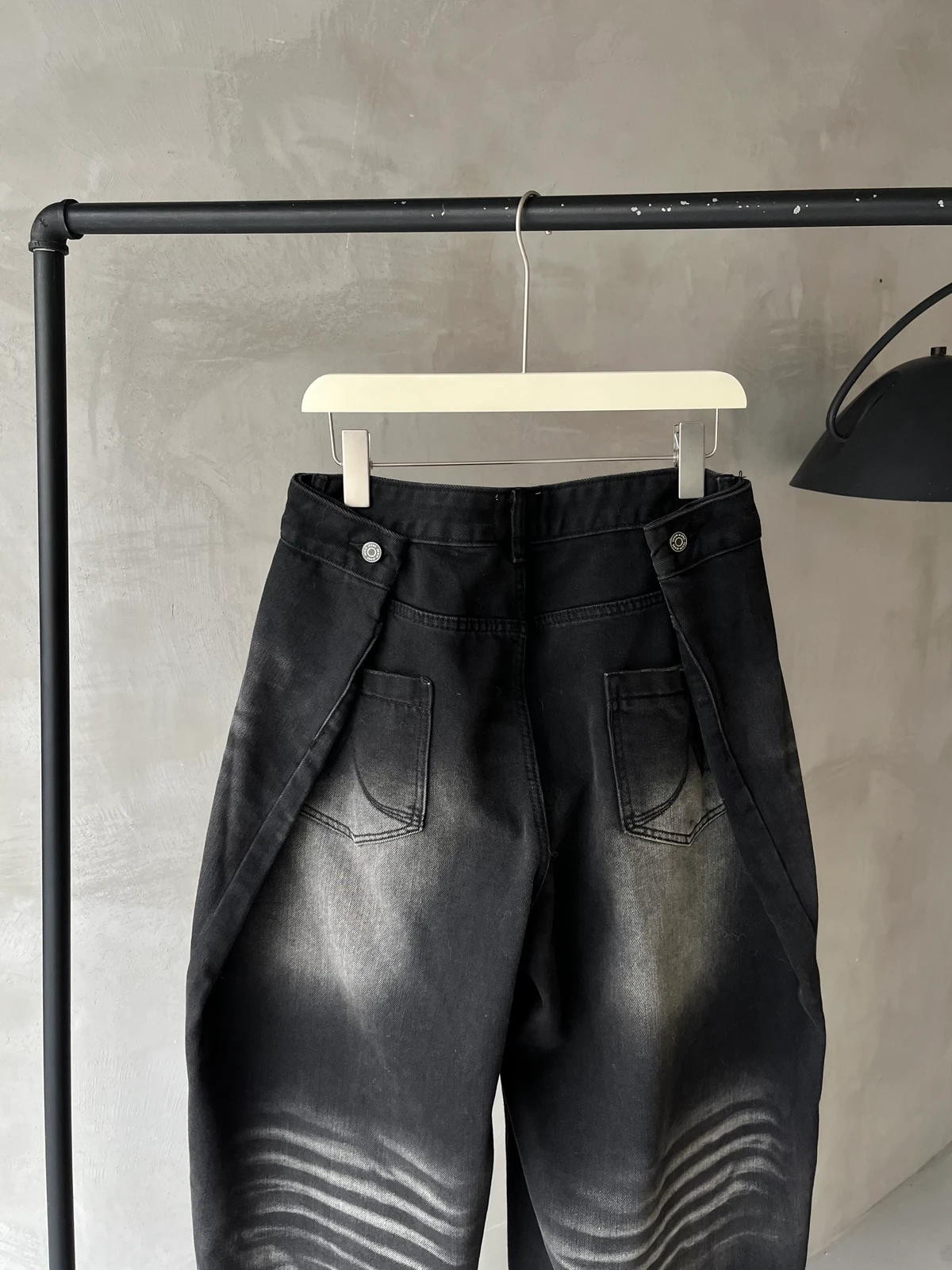 疊腰兩穿寬鬆彎刀牛仔長褲/2colors