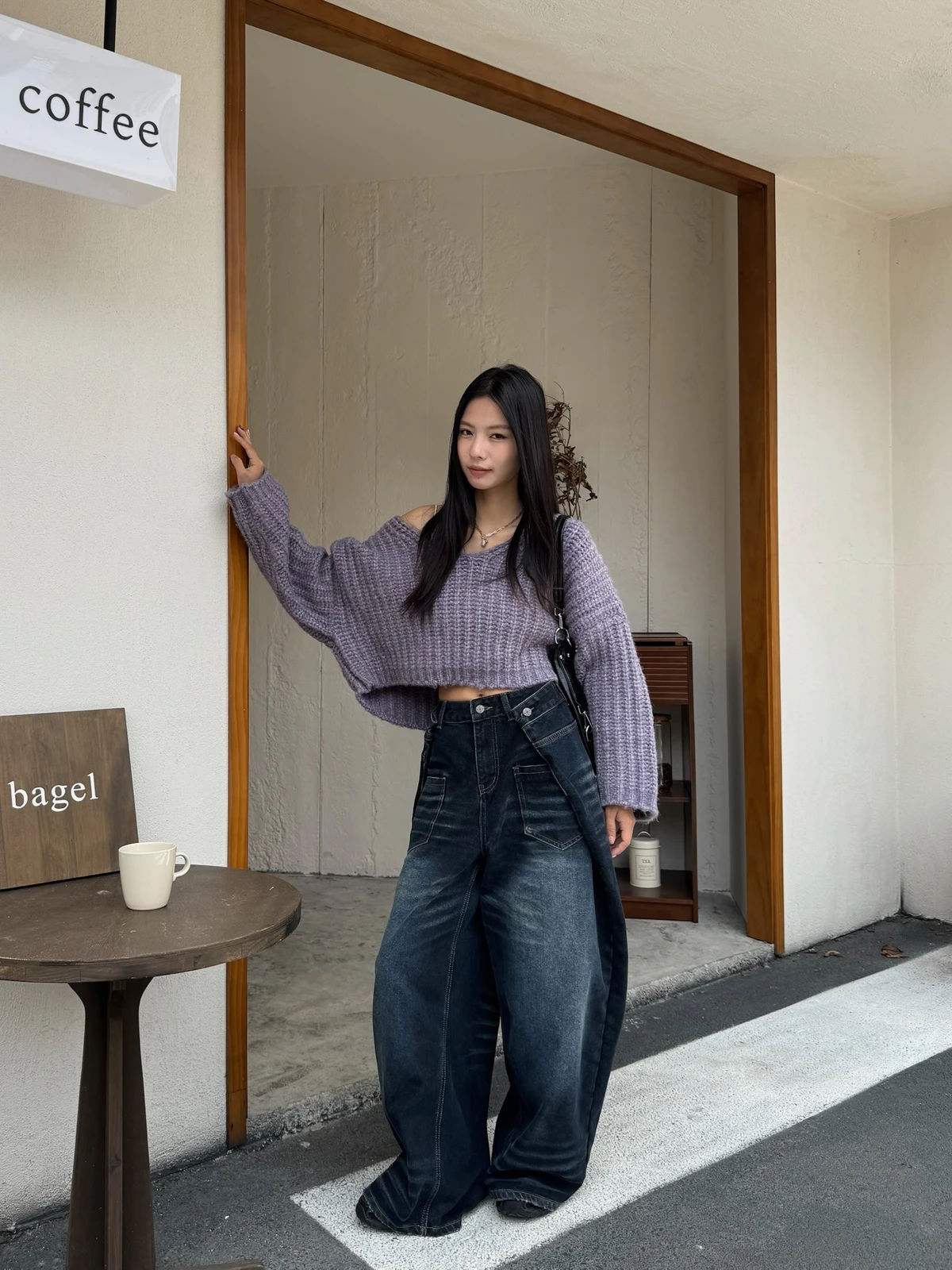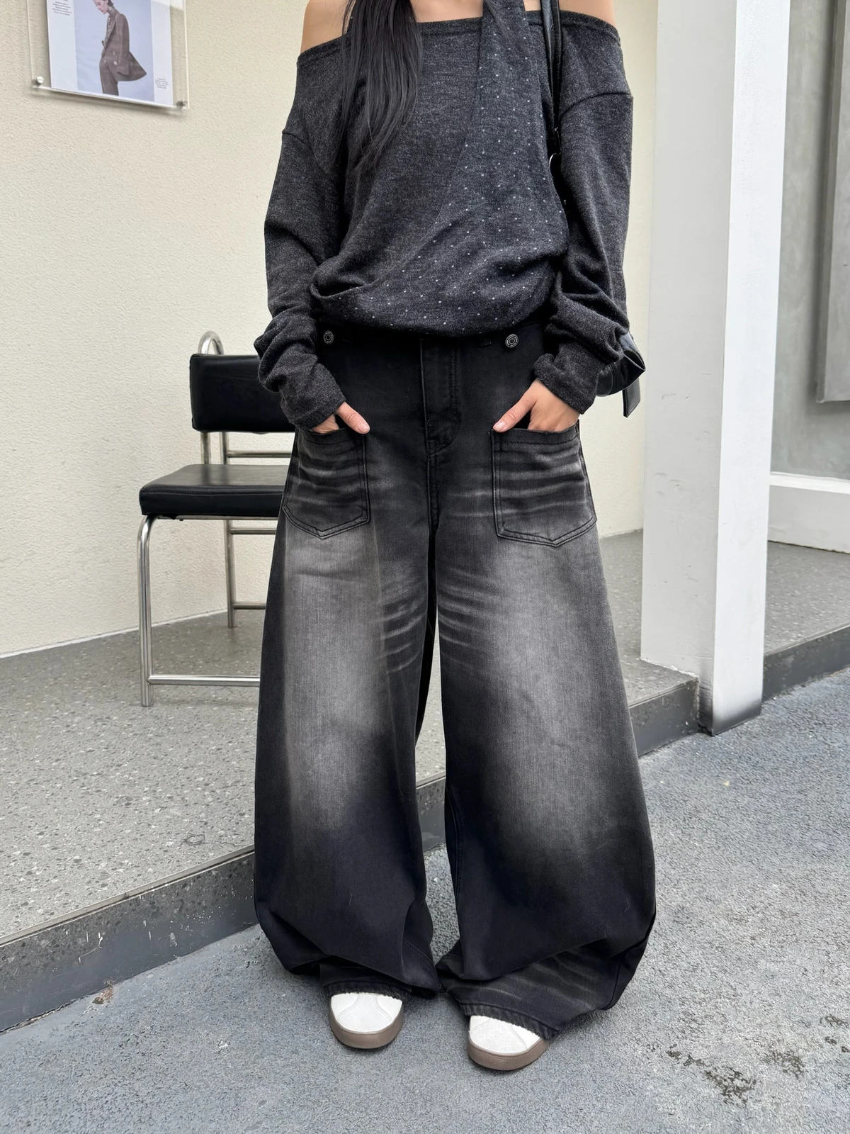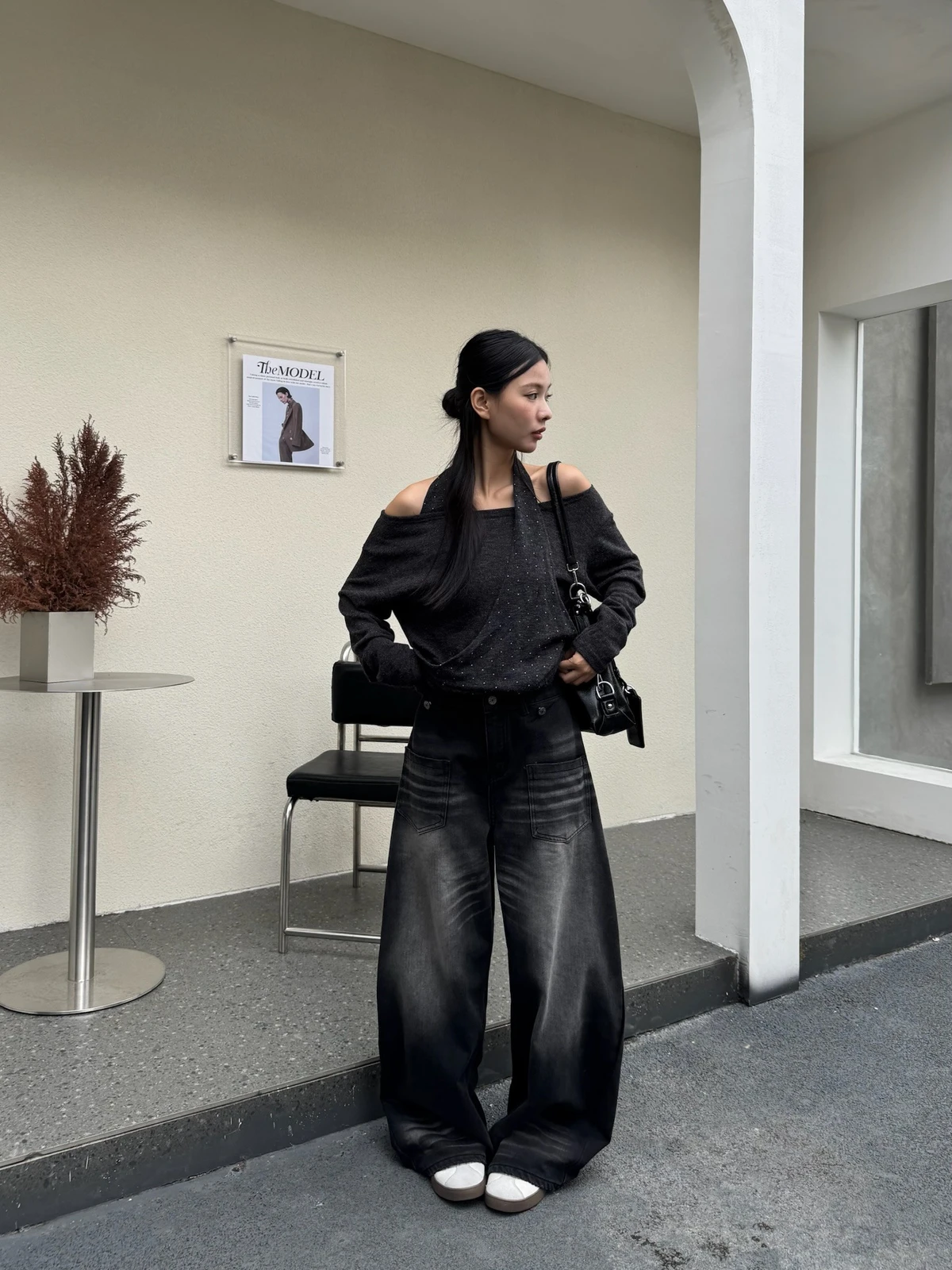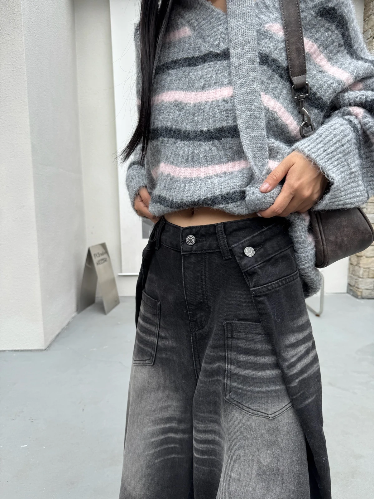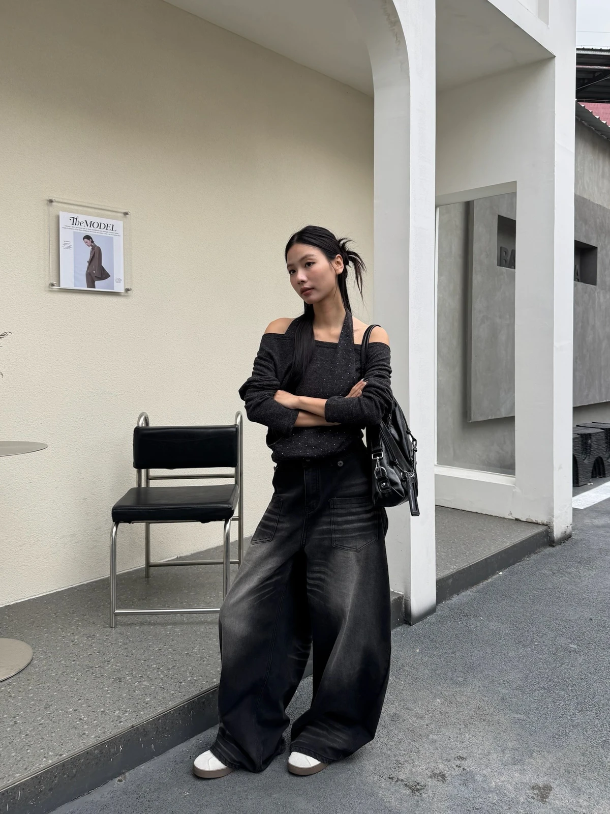 疊腰兩穿寬鬆彎刀牛仔長褲/2colors