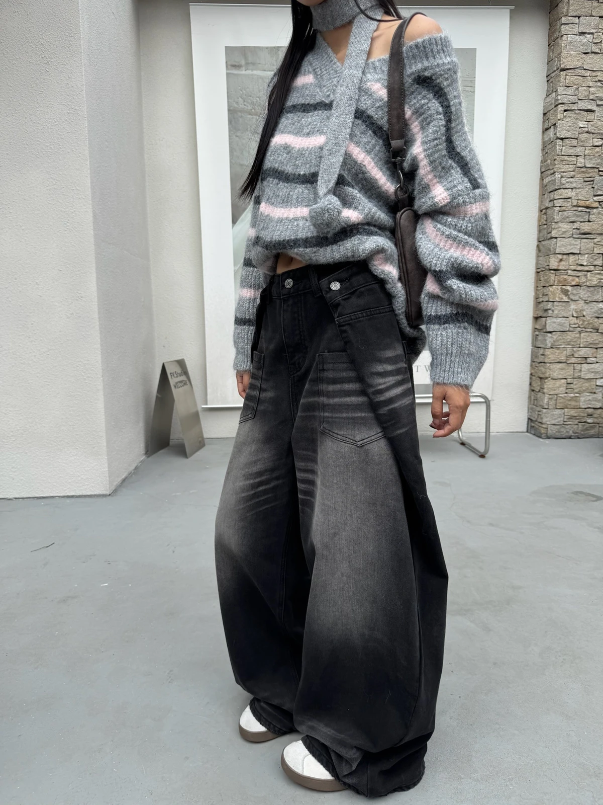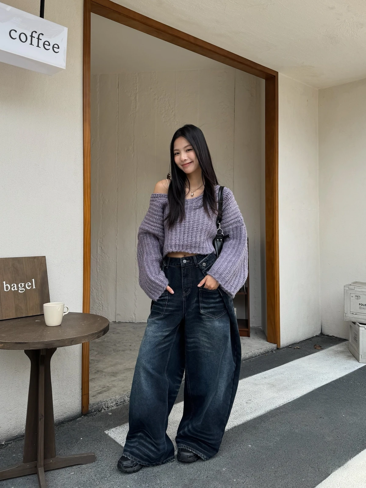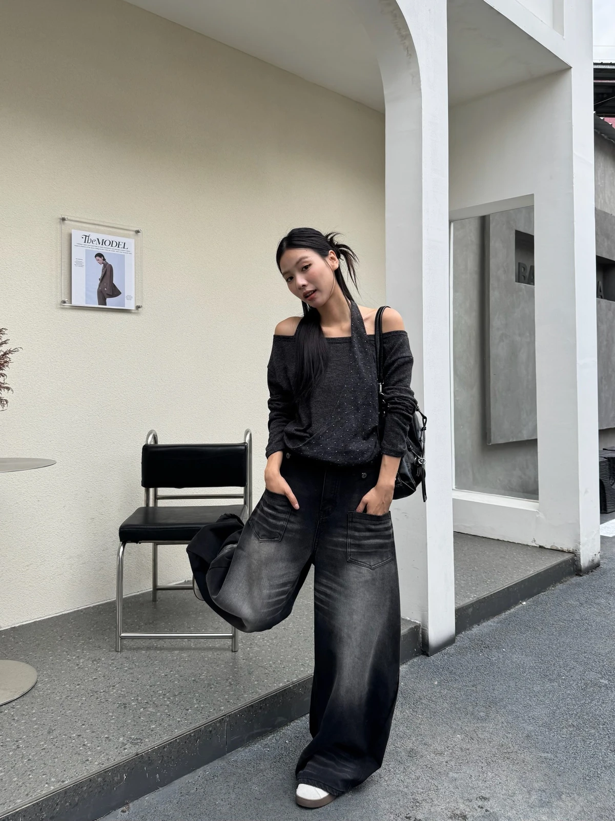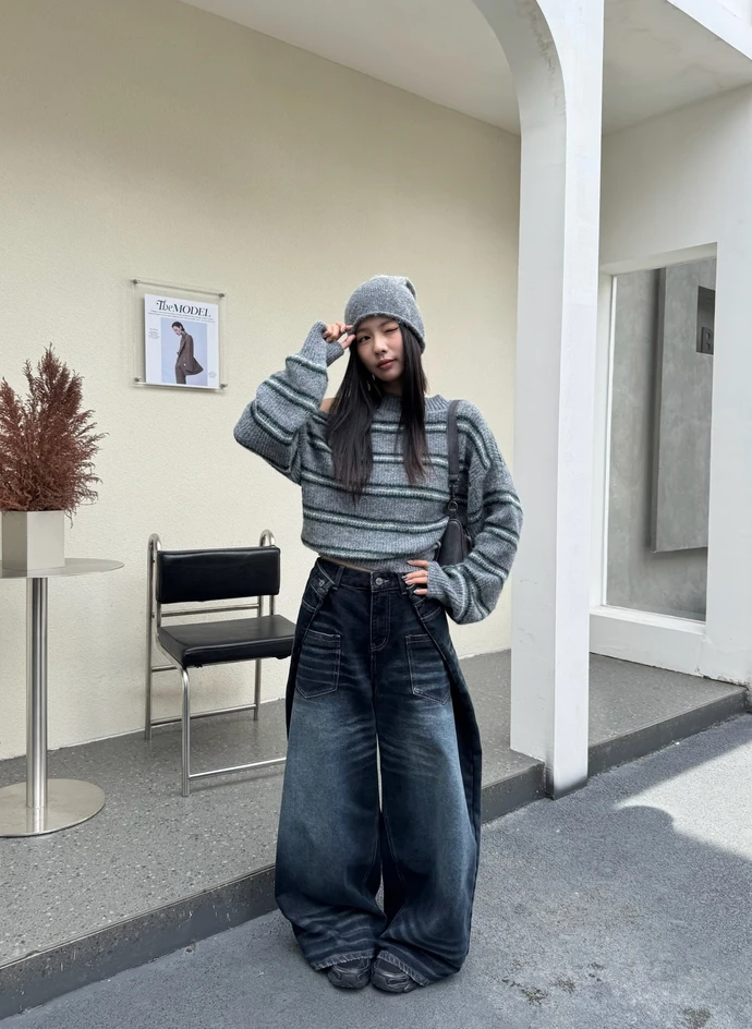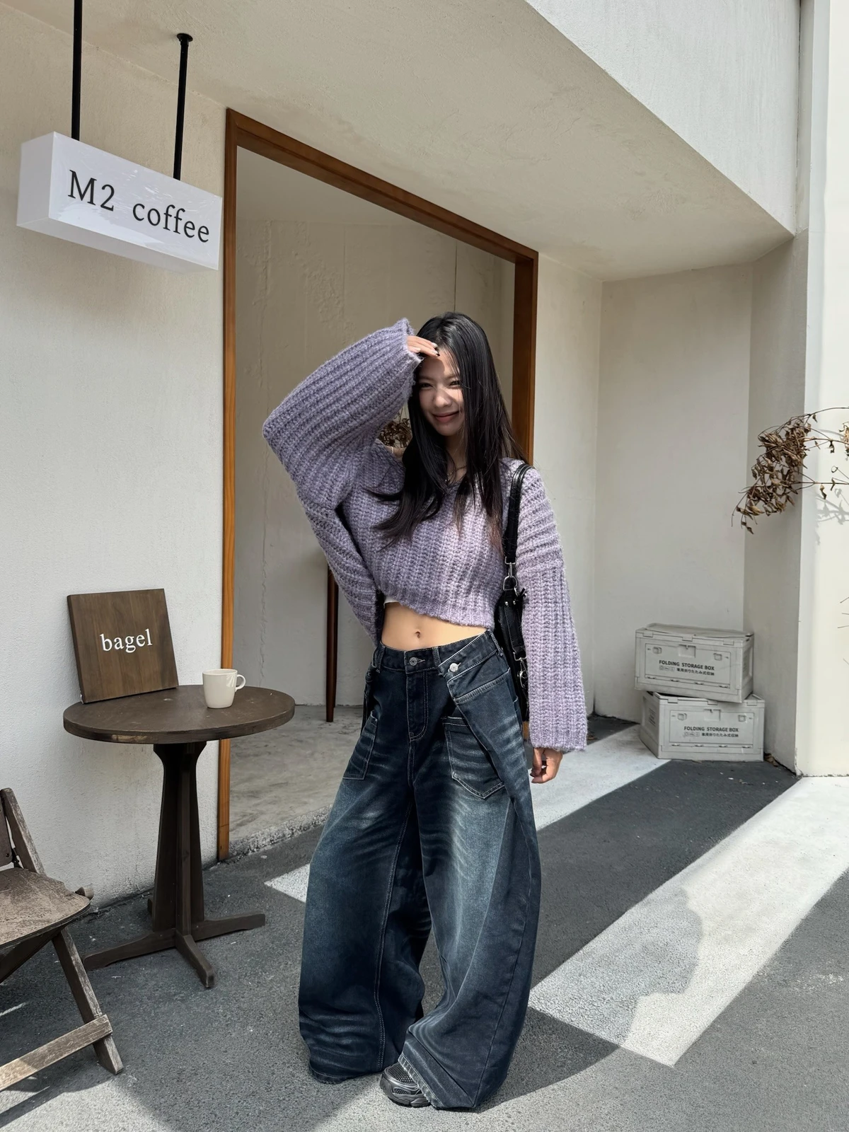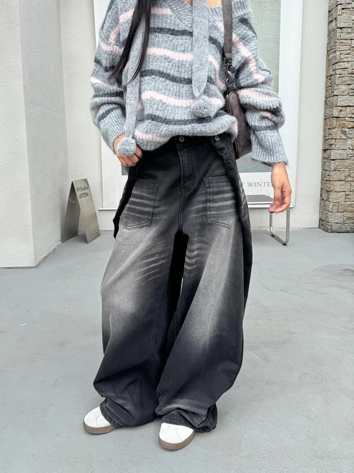 疊腰兩穿寬鬆彎刀牛仔長褲/2colors