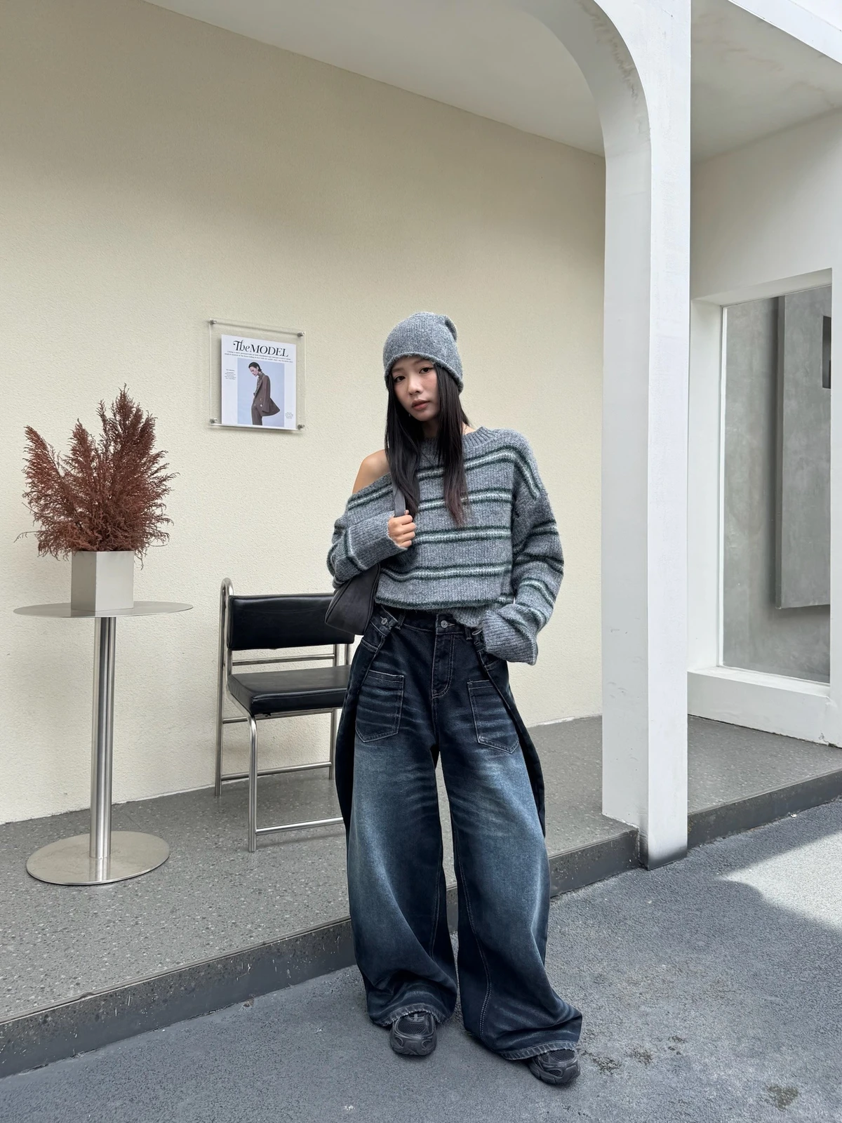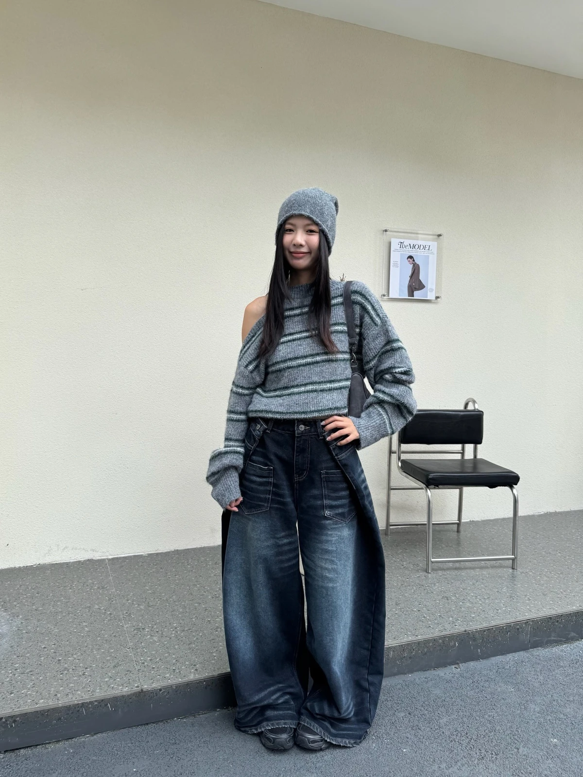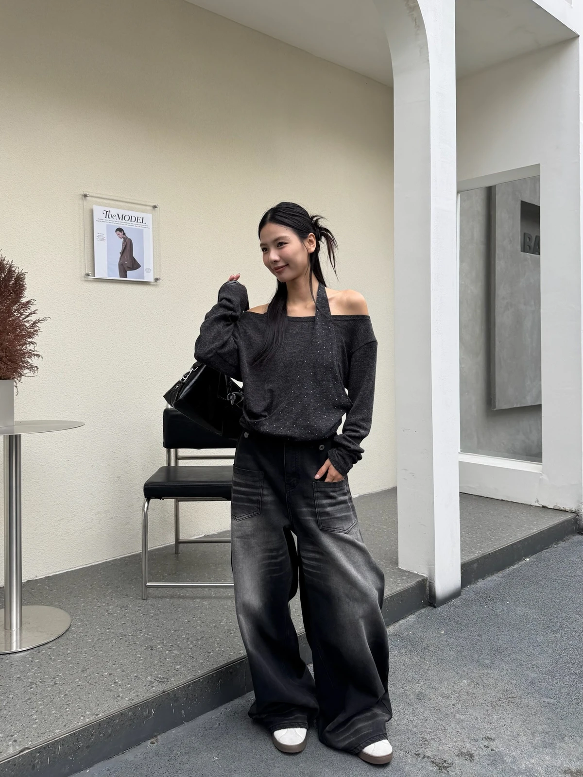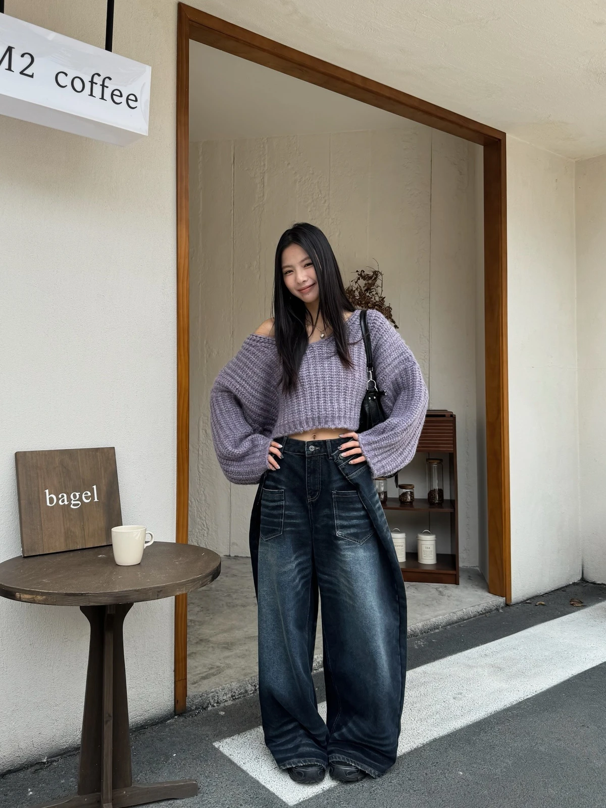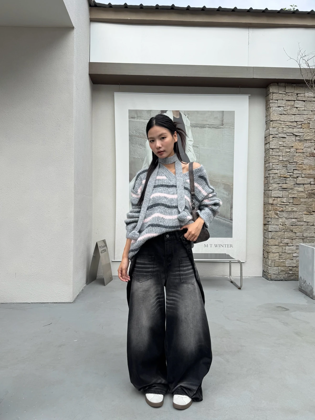 疊腰兩穿寬鬆彎刀牛仔長褲/2colors