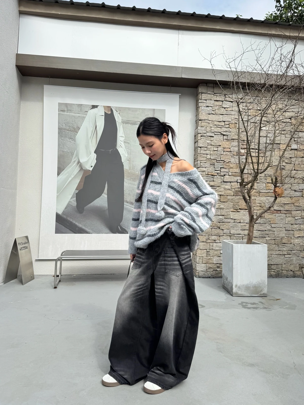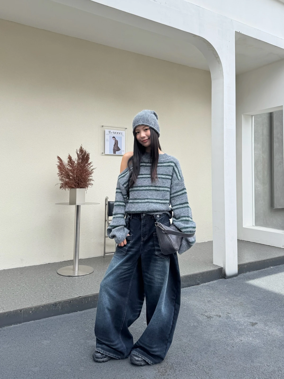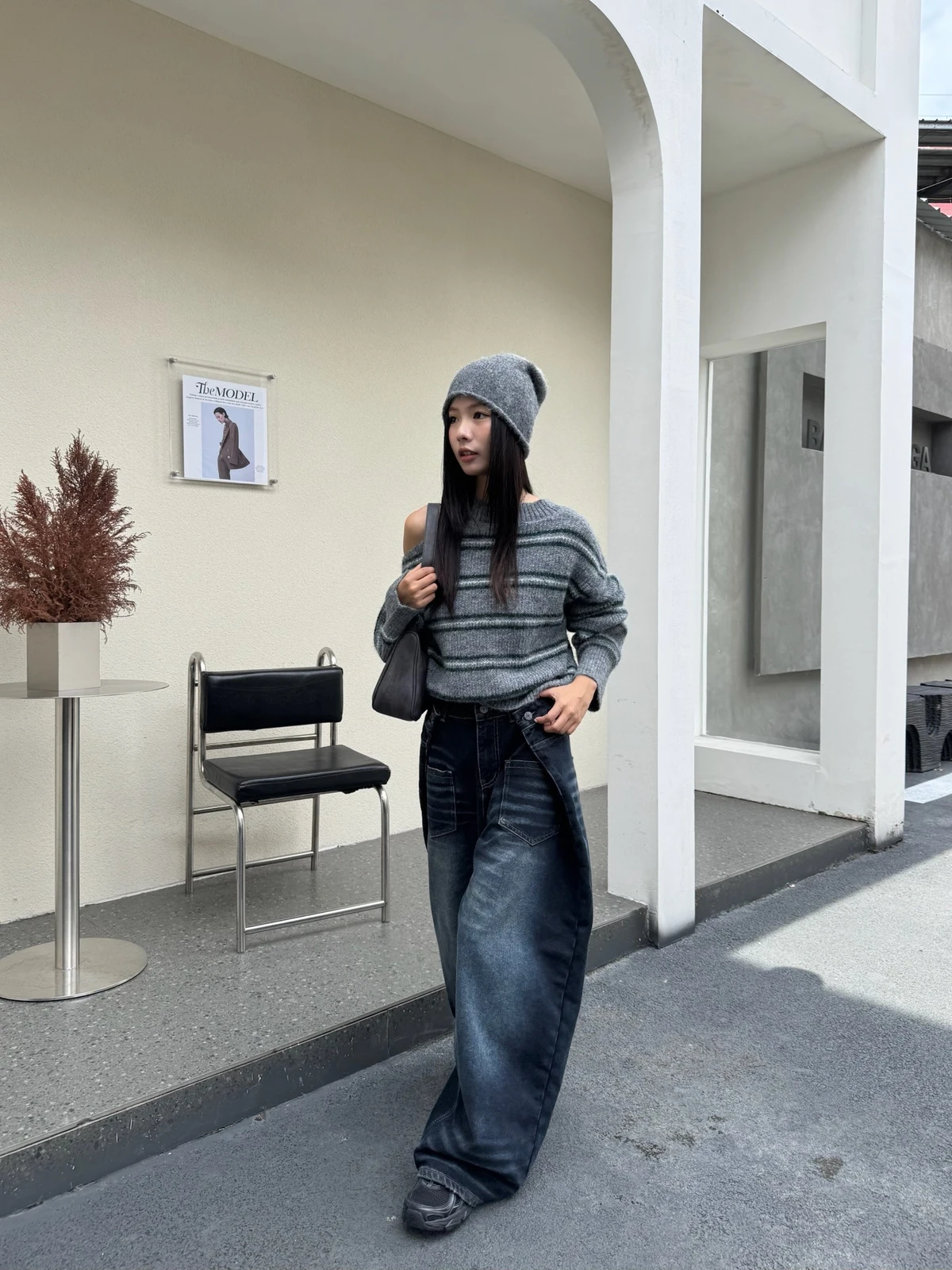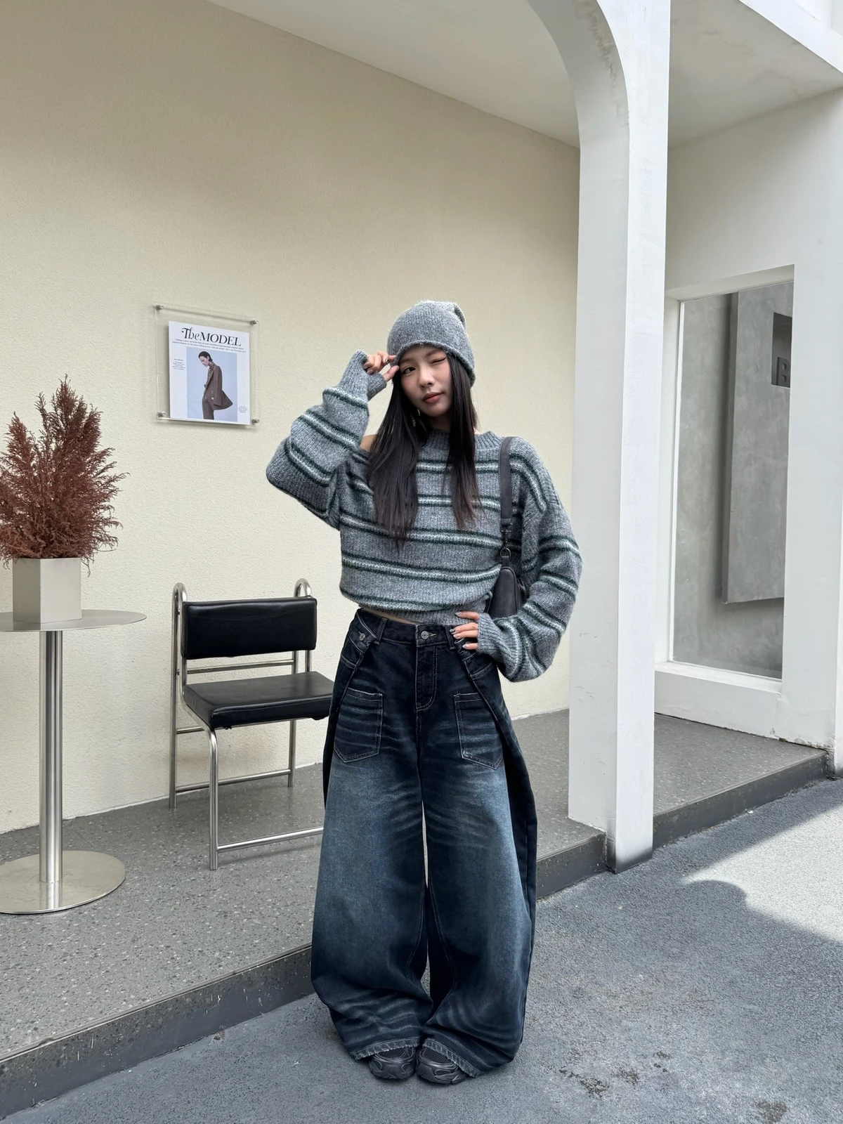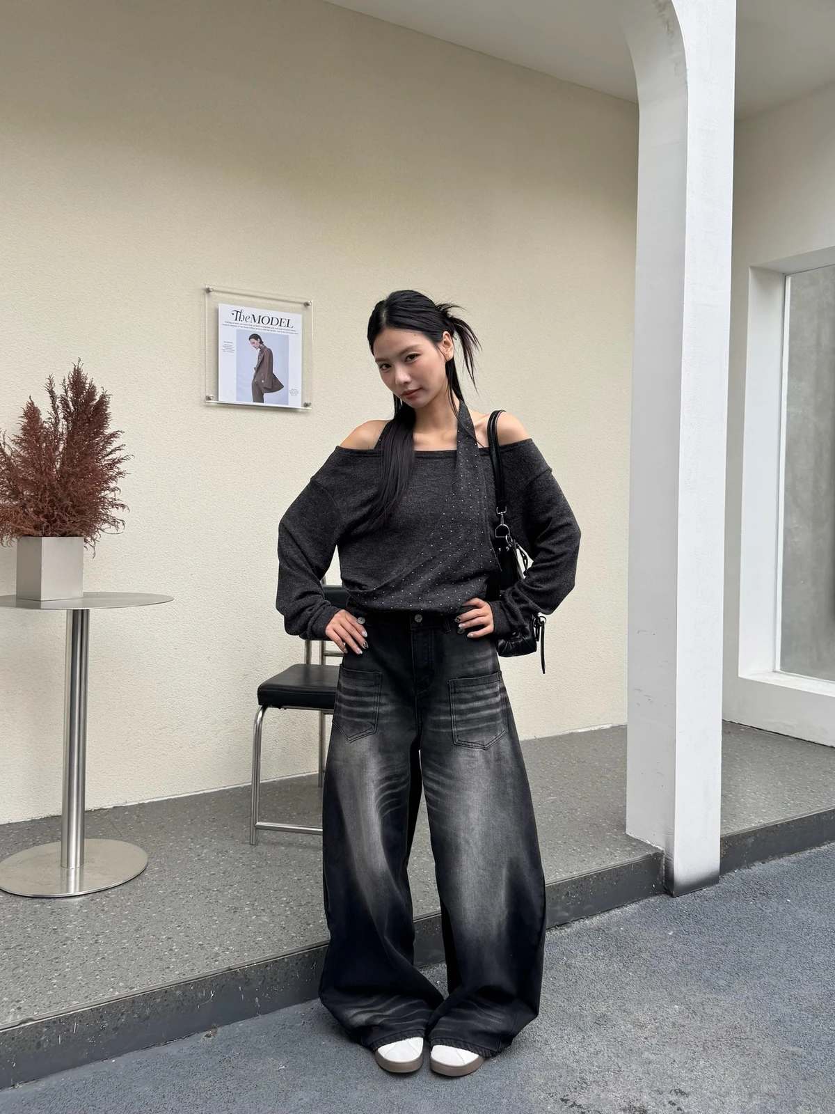 疊腰兩穿寬鬆彎刀牛仔長褲/2colors