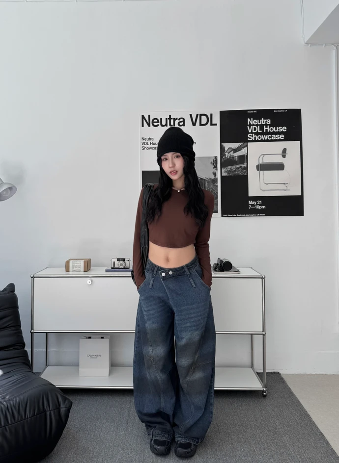 仿舊暈染刷色斜褲頭彎刀牛仔褲