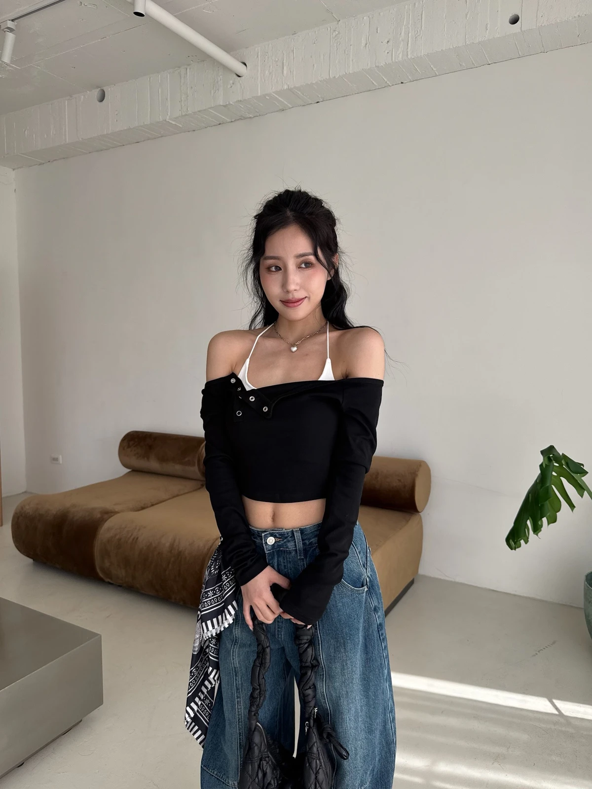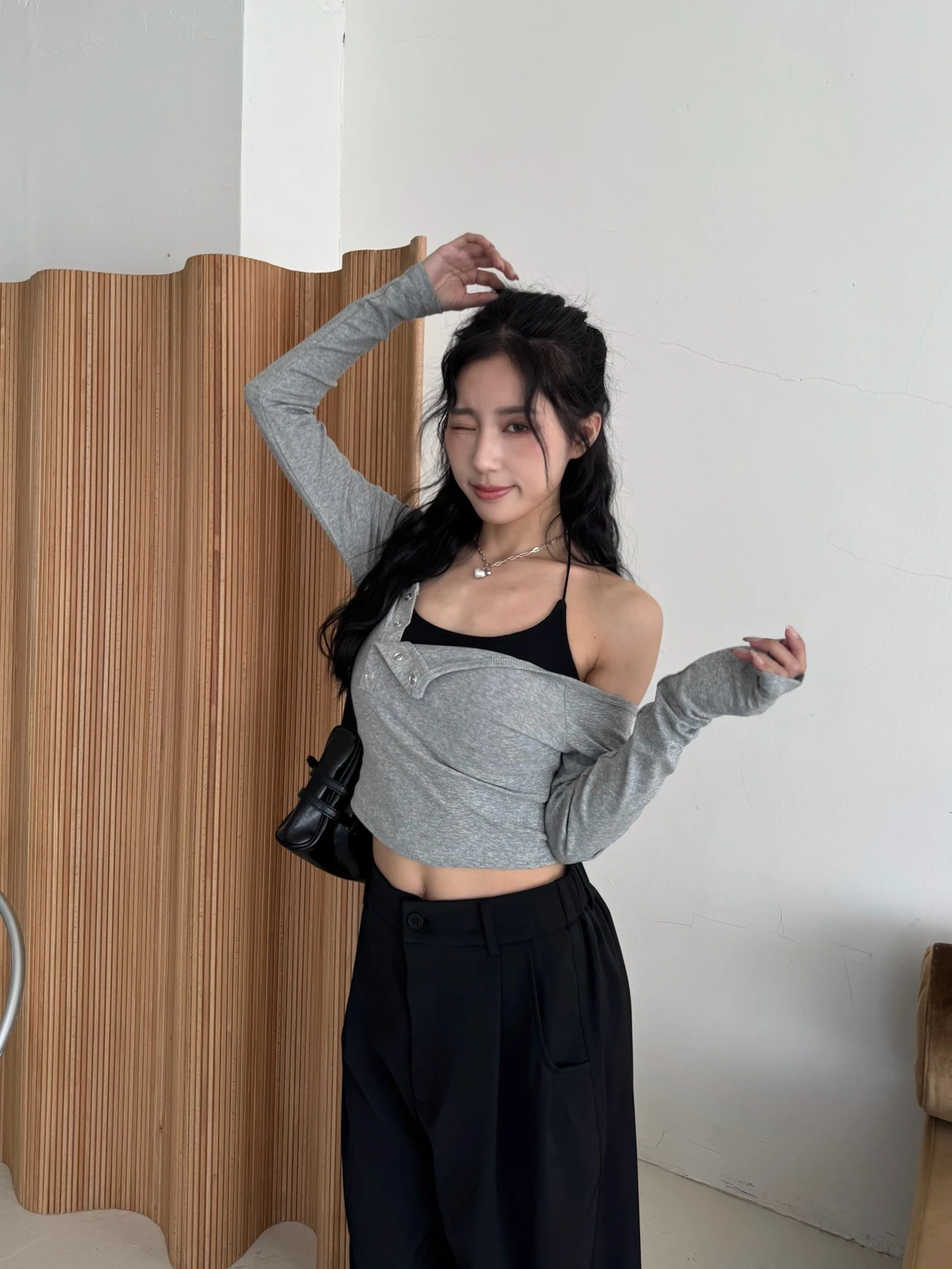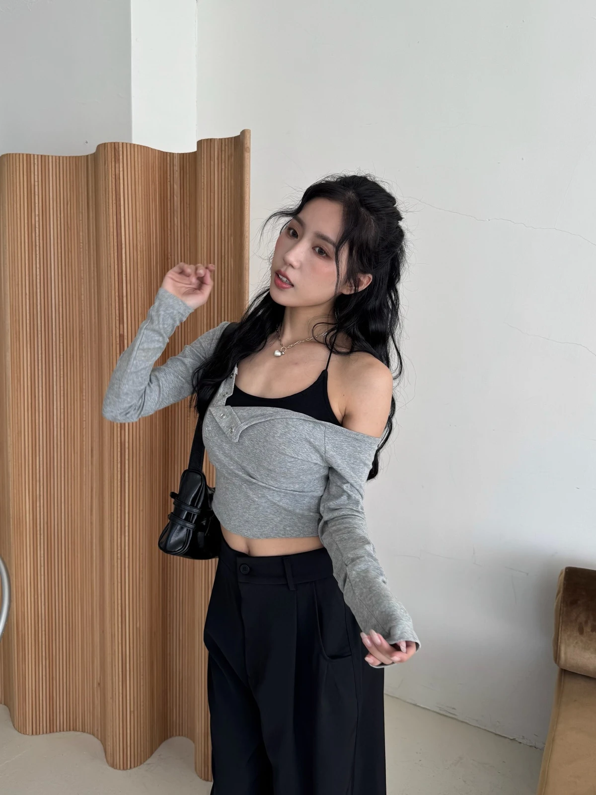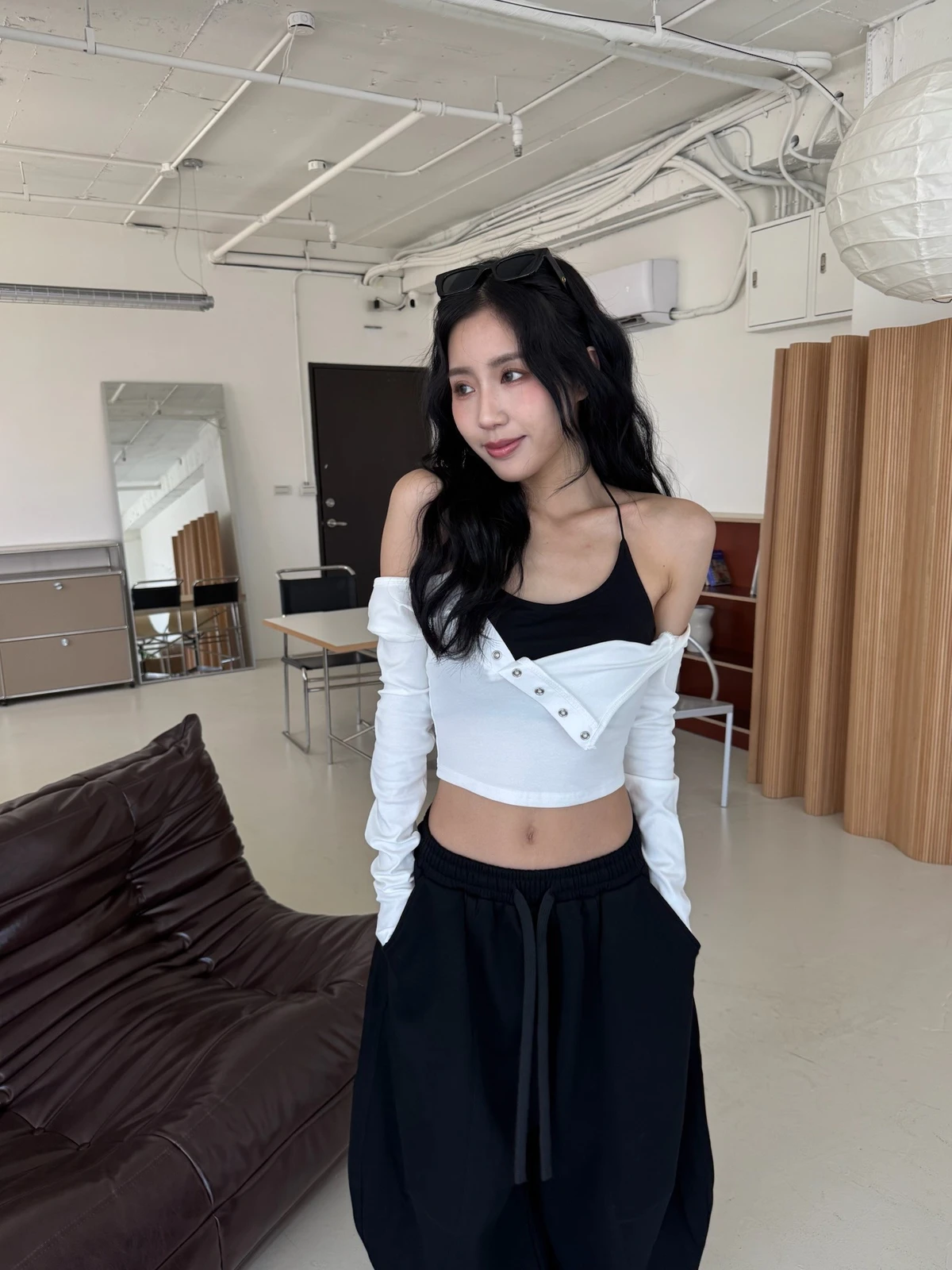 本期推薦!側壓釦斜肩掛脖Bra兩件式上衣/3colors