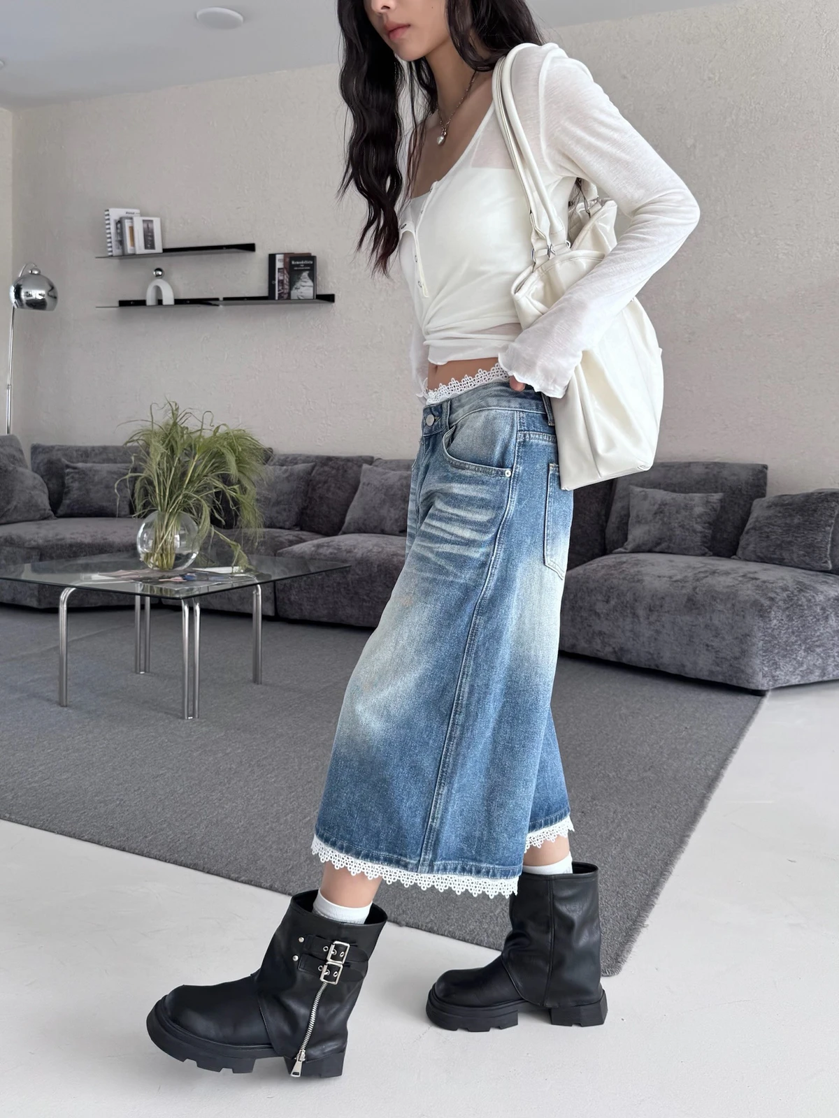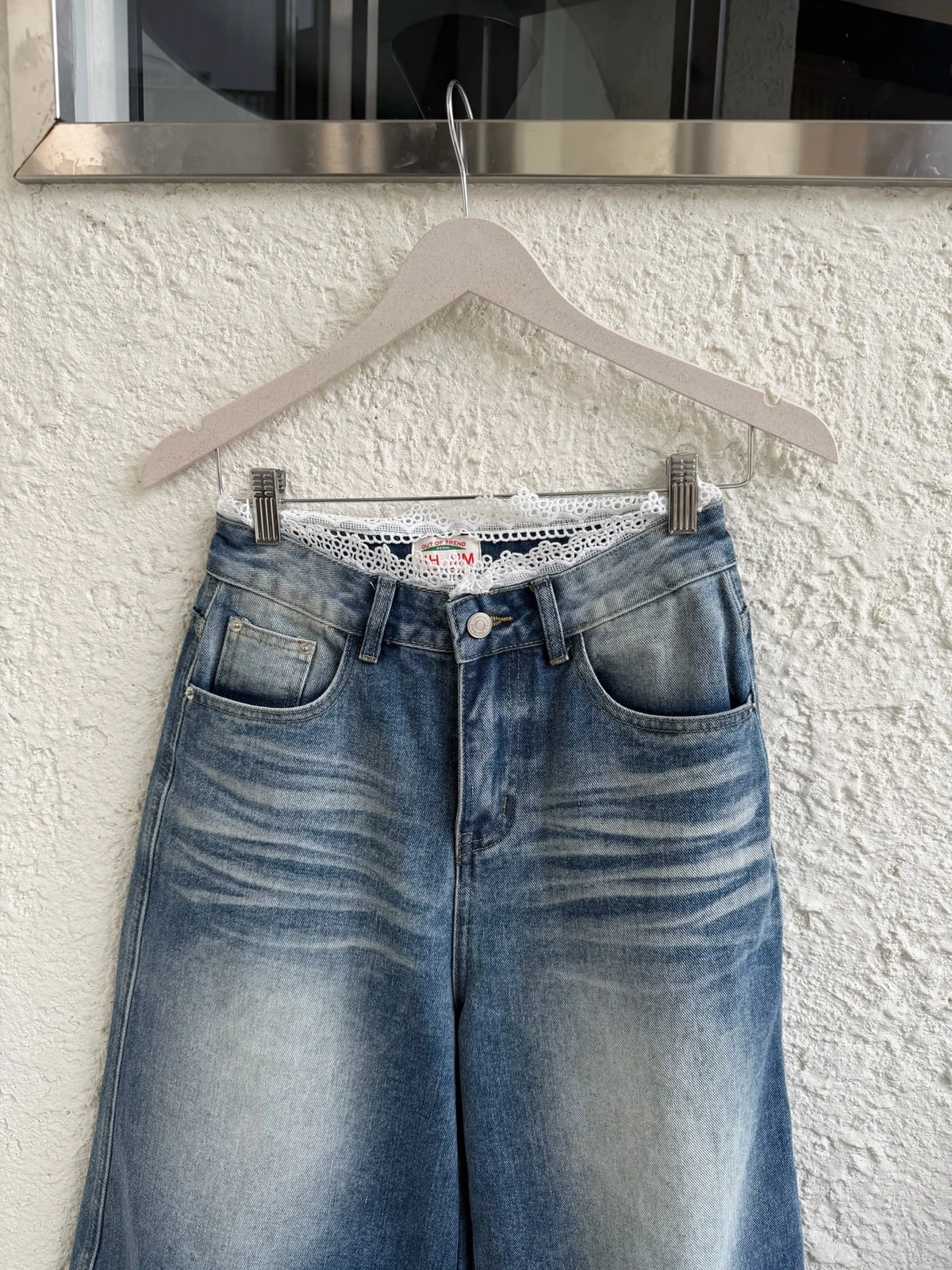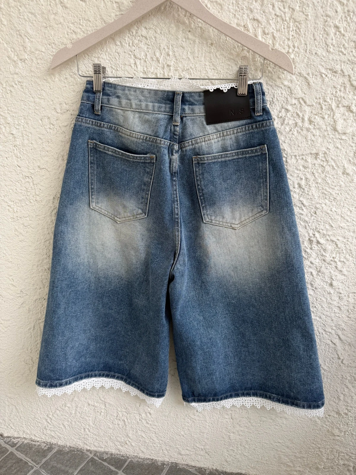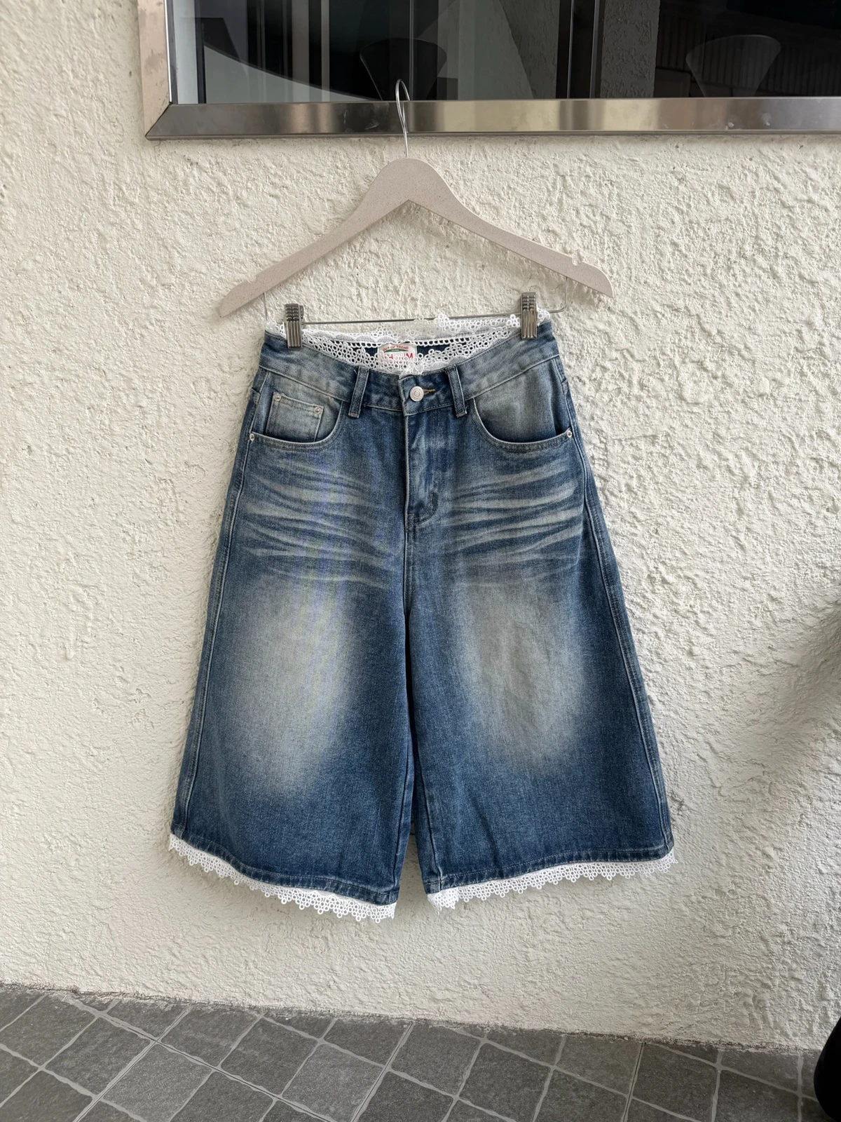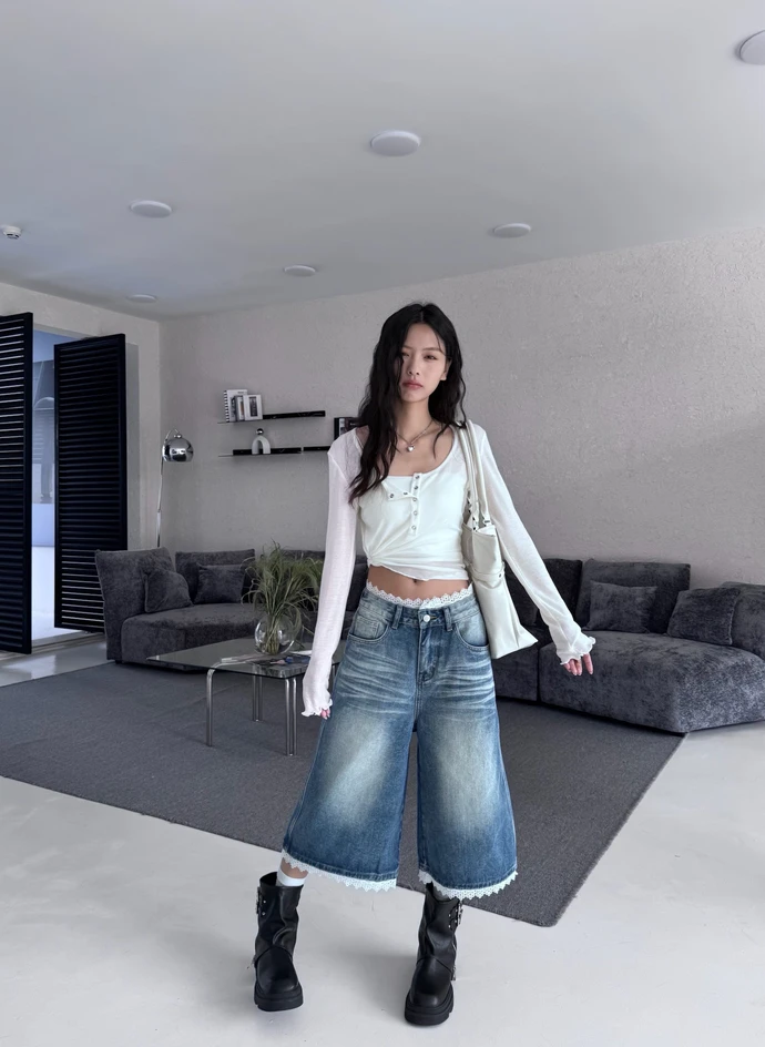 熱賣回歸新色!蕾絲拼接刷色七分牛仔褲