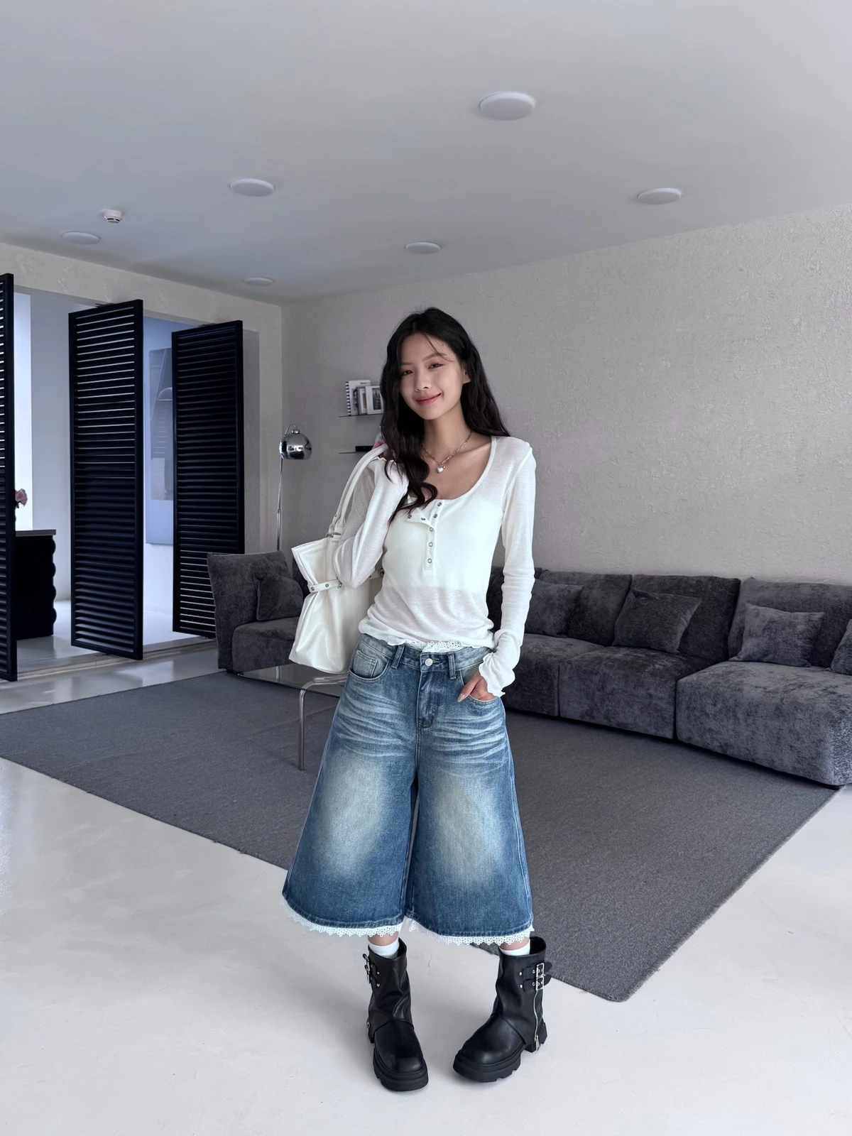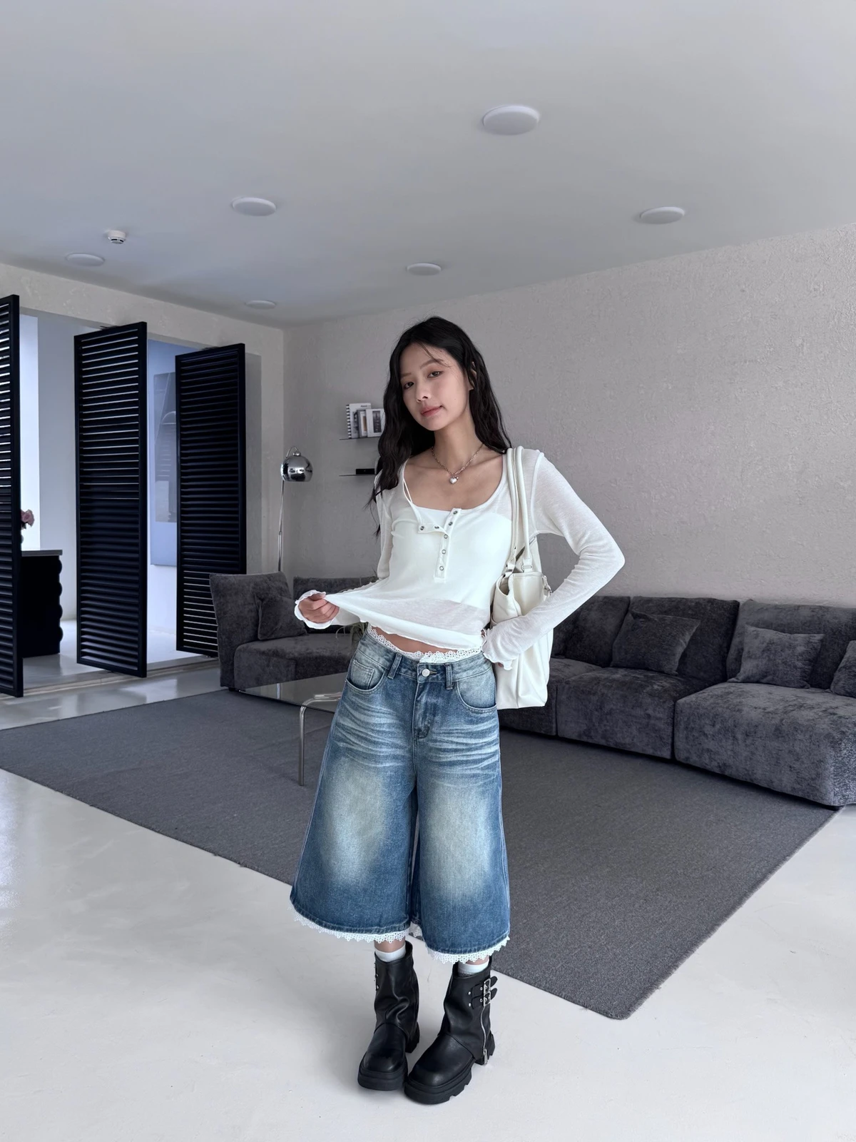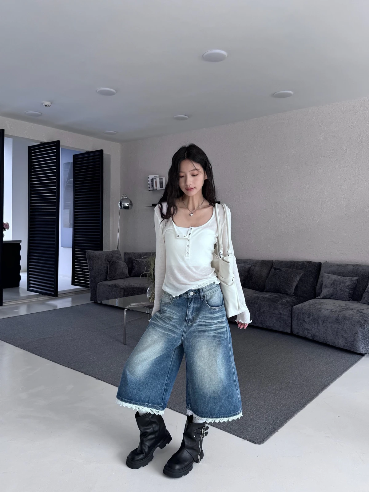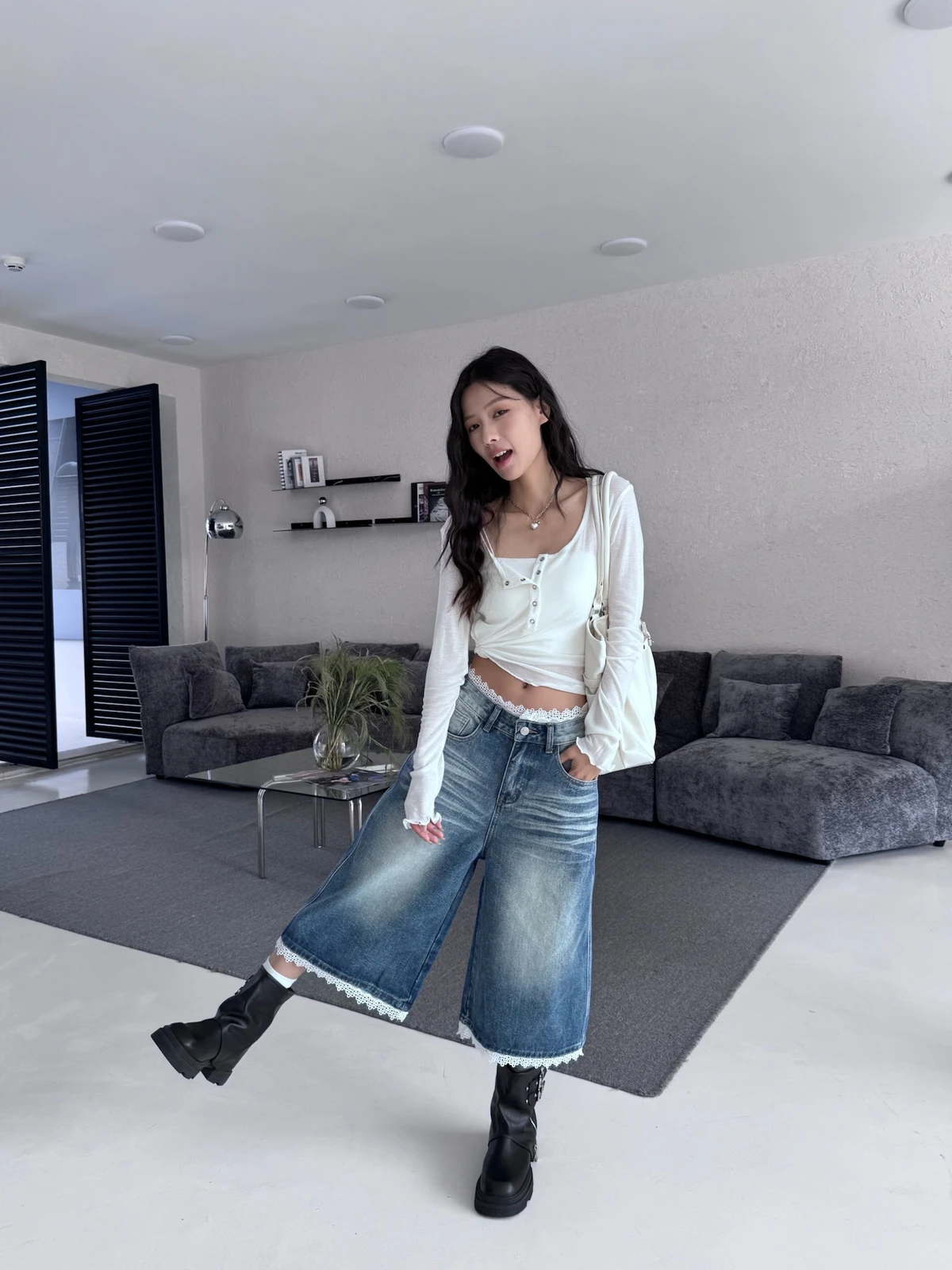 熱賣回歸新色!蕾絲拼接刷色七分牛仔褲