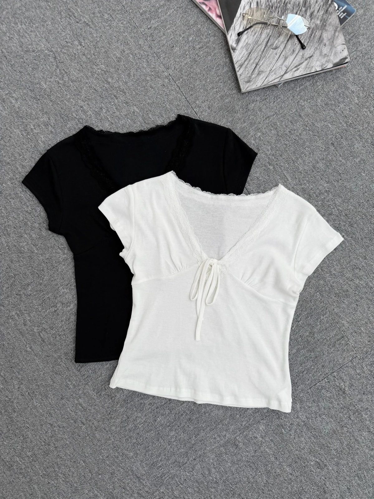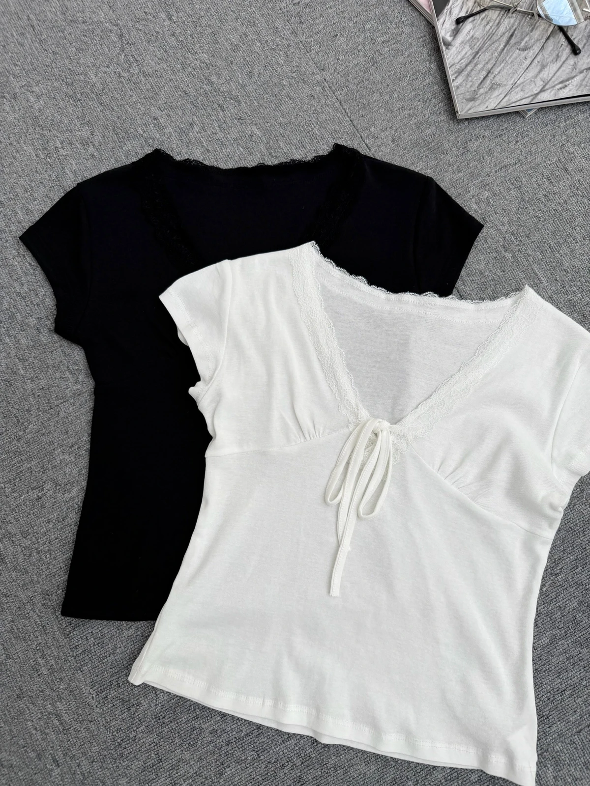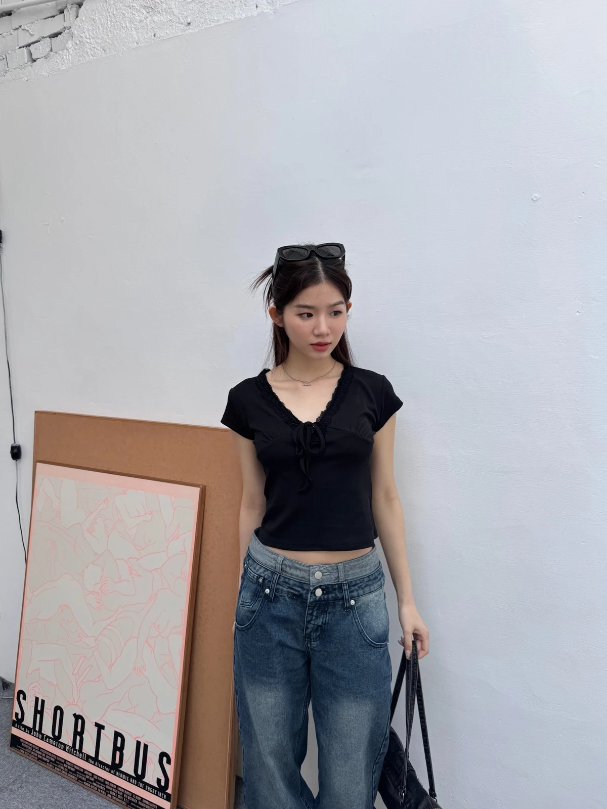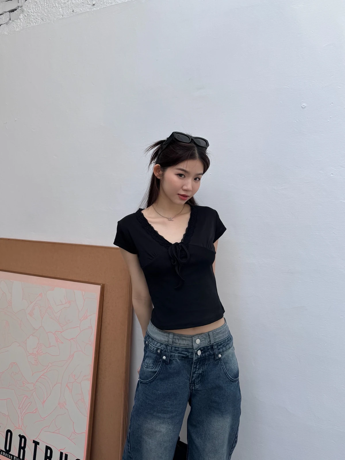 本期推薦!蕾絲滾邊綁繩V領上衣/2colors