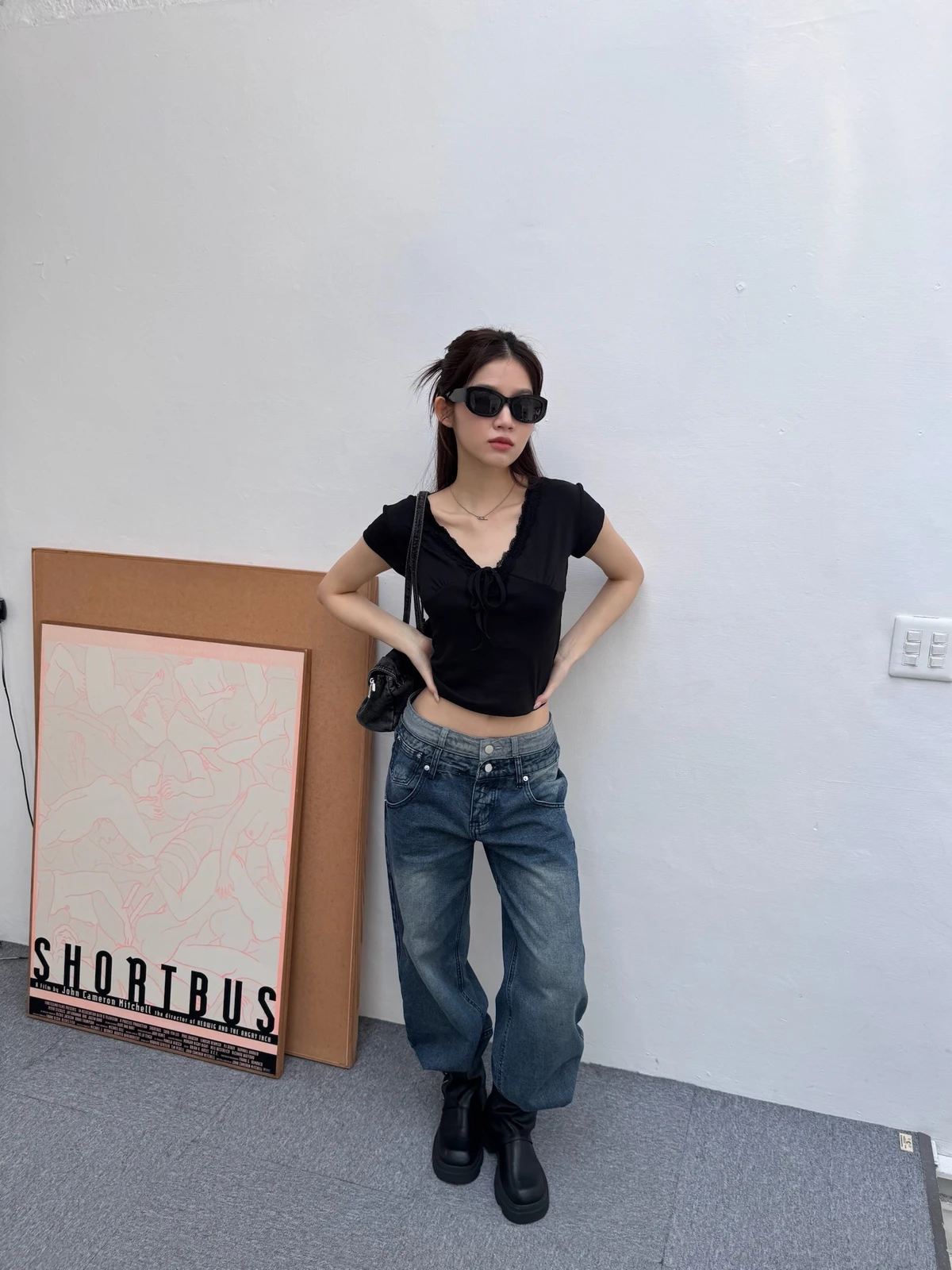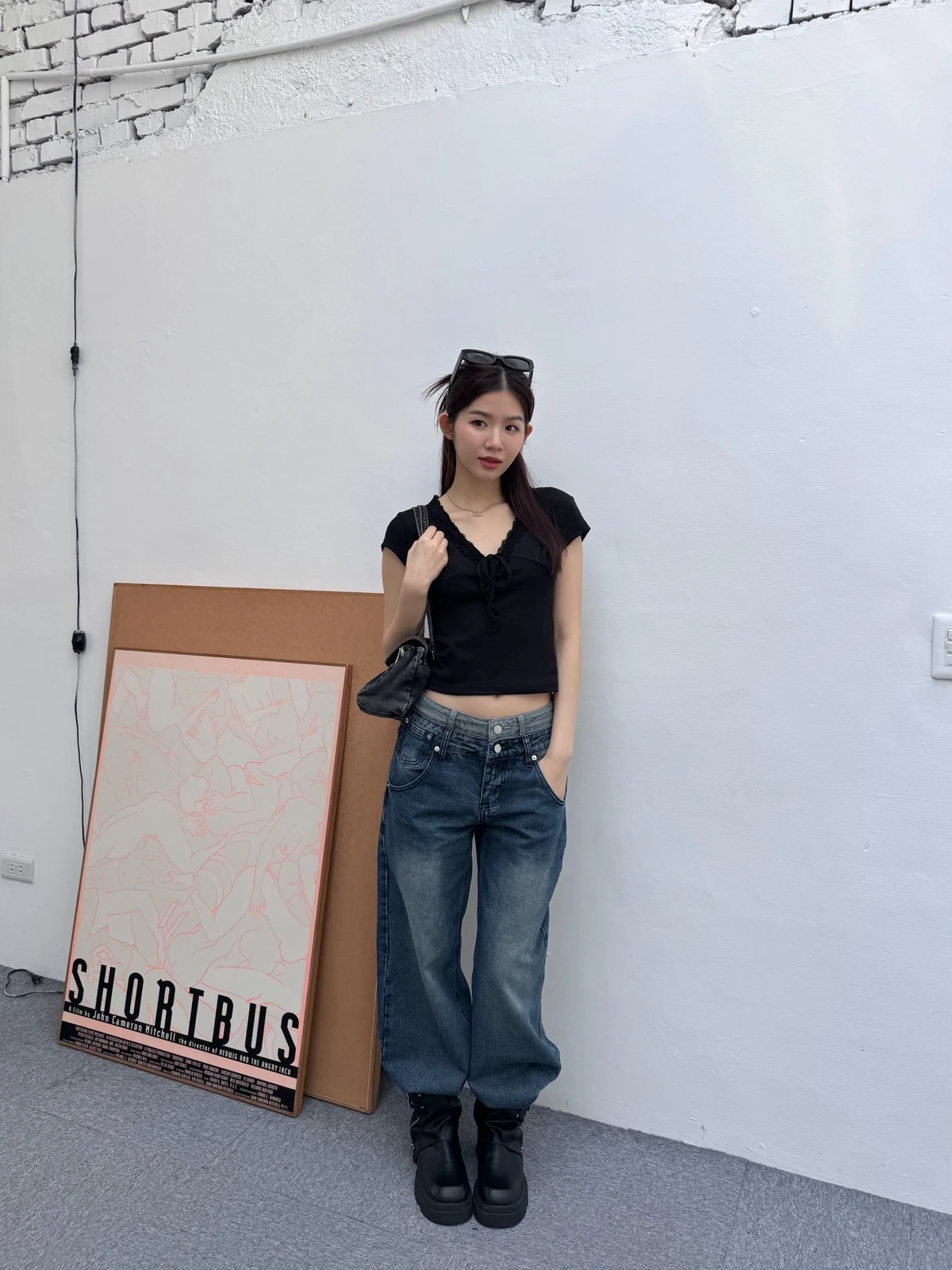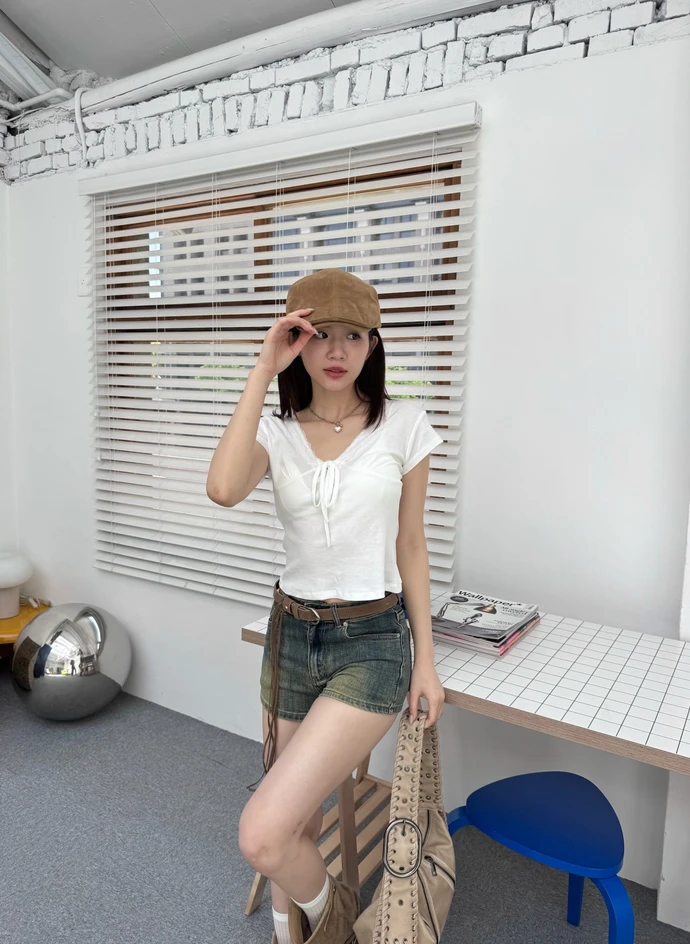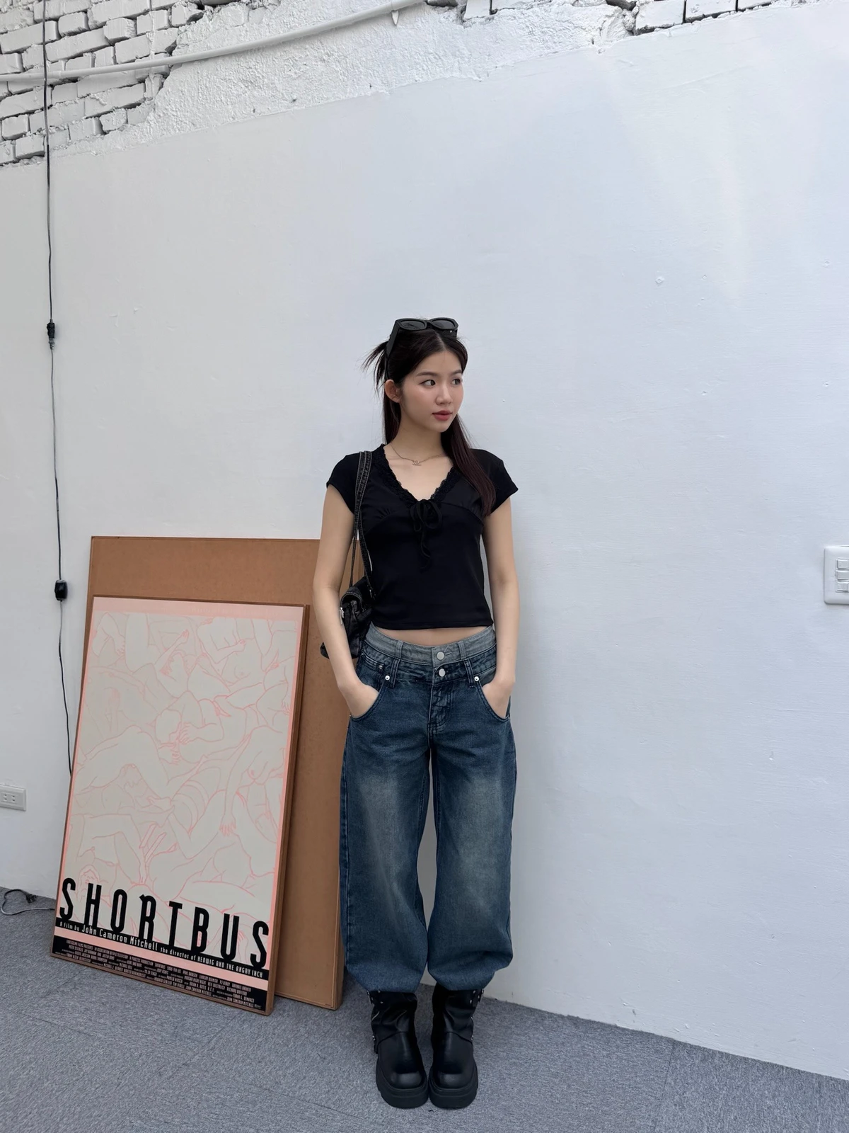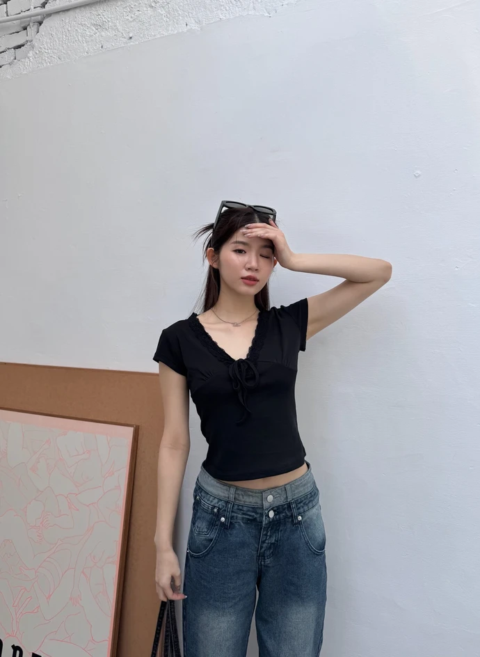 本期推薦!蕾絲滾邊綁繩V領上衣/2colors