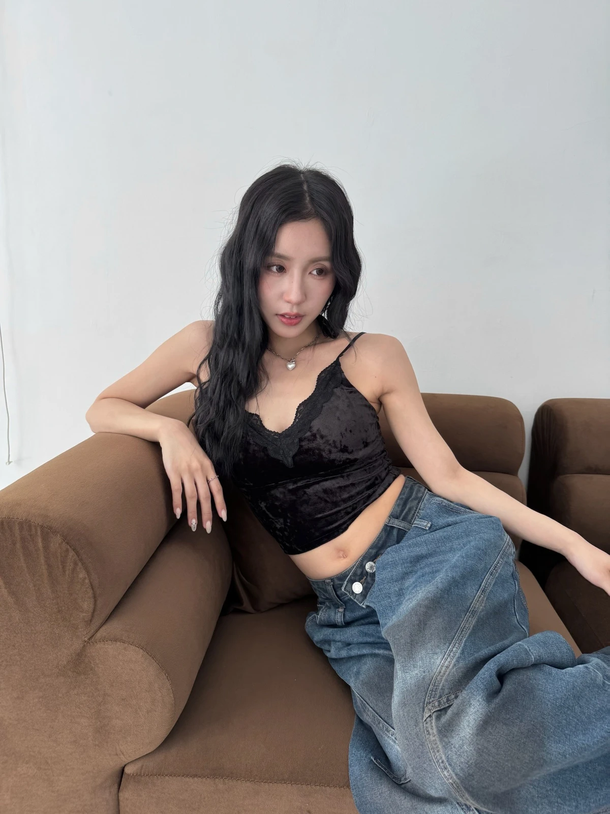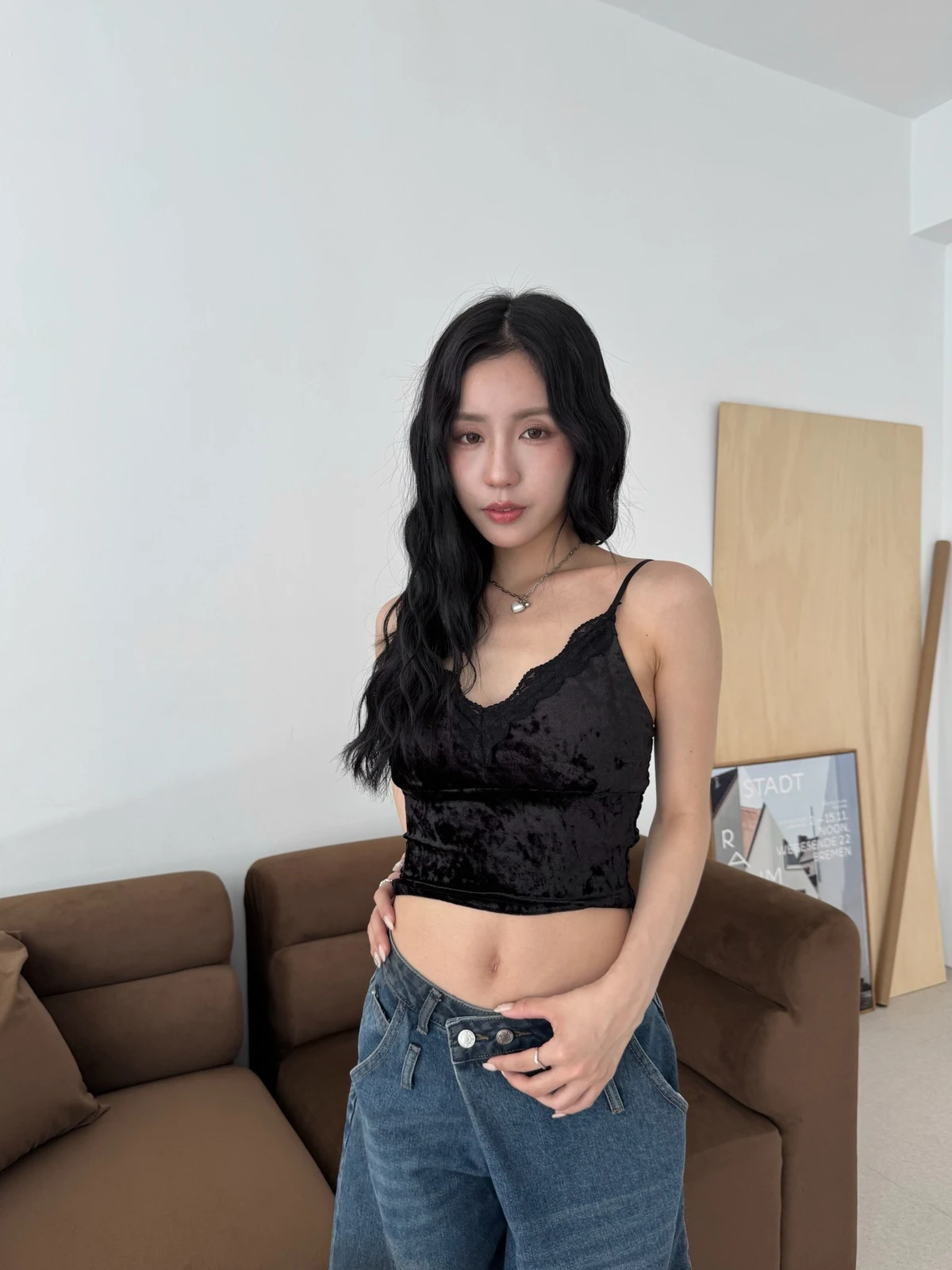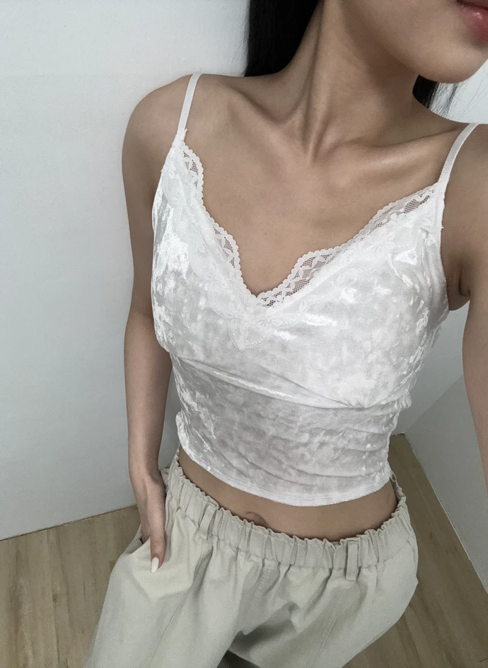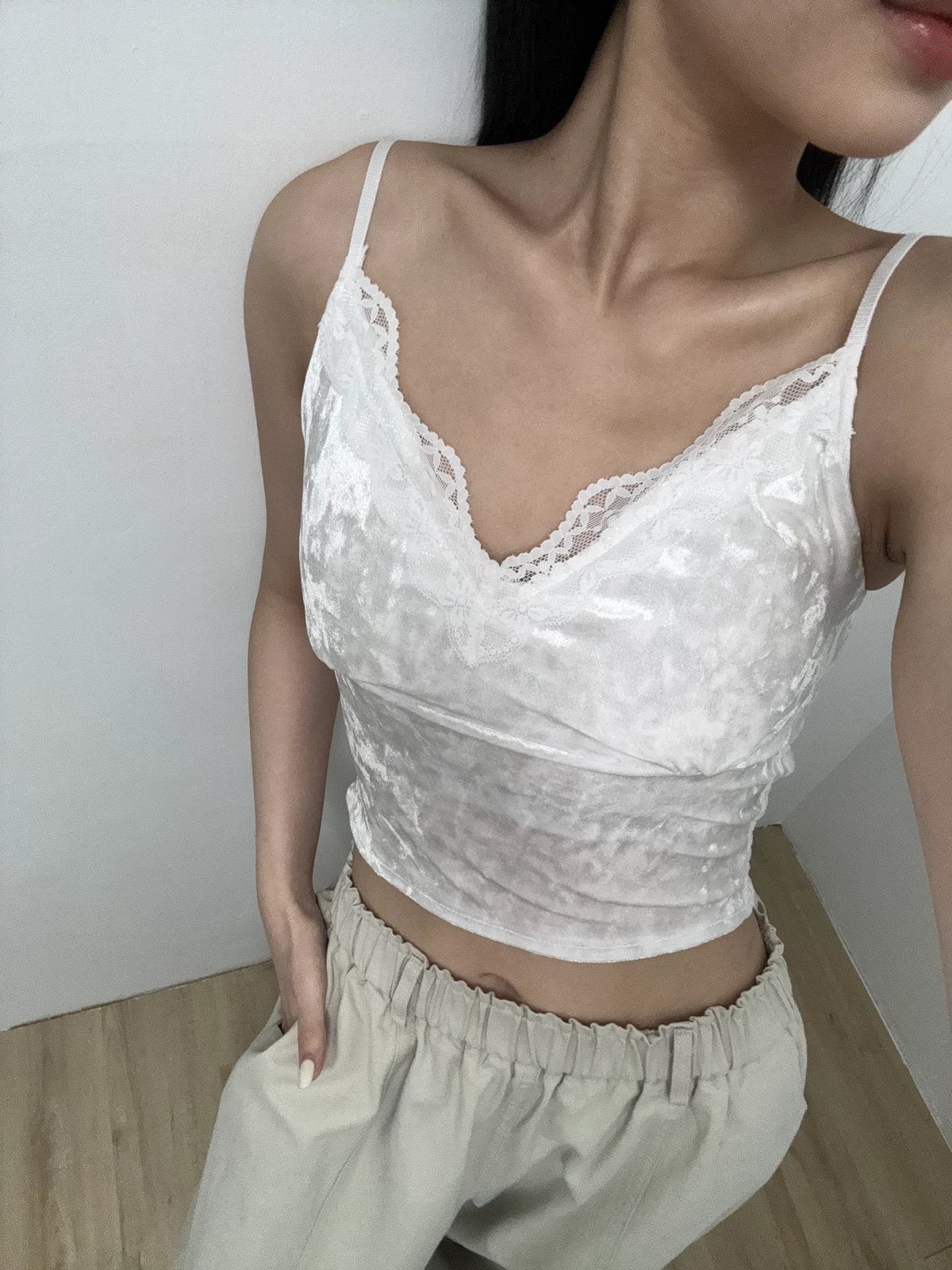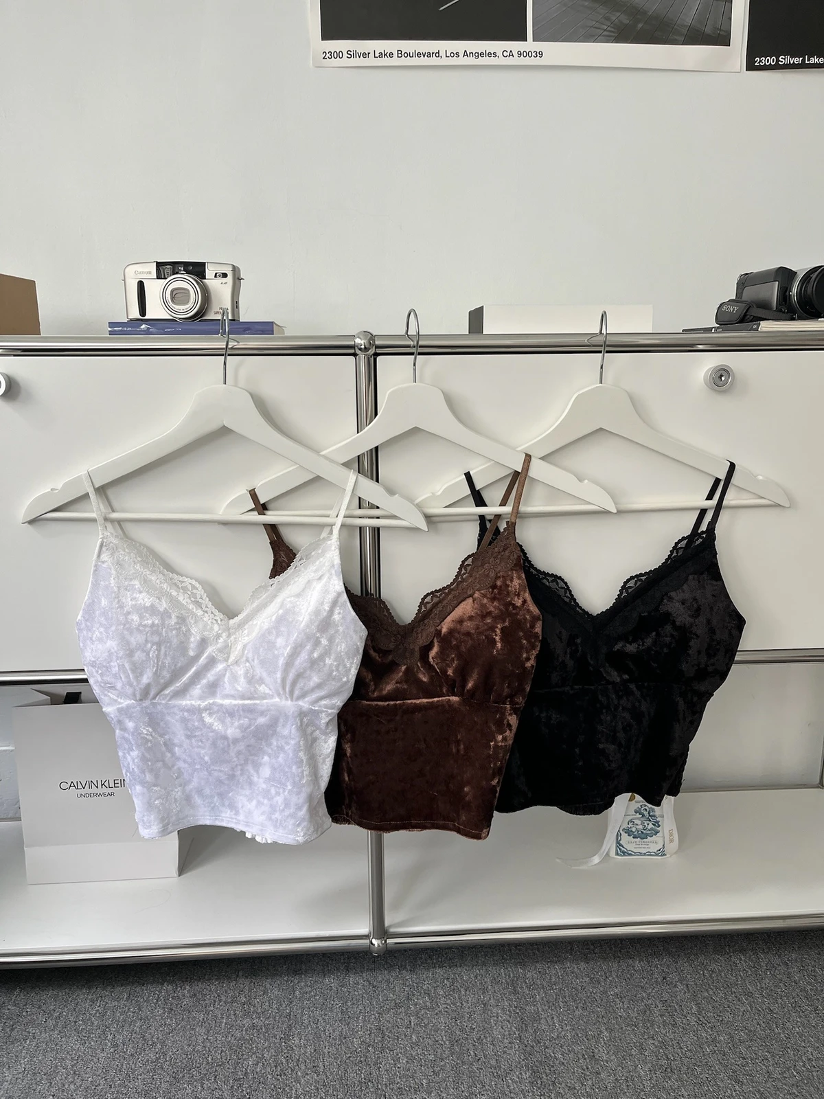 法式絲絨蕾絲滾邊細肩帶Bra Top/3colors
