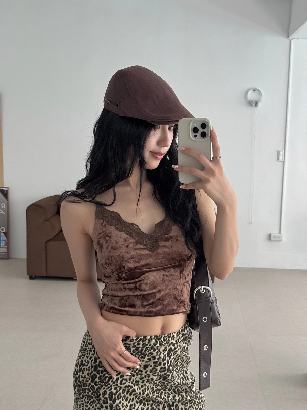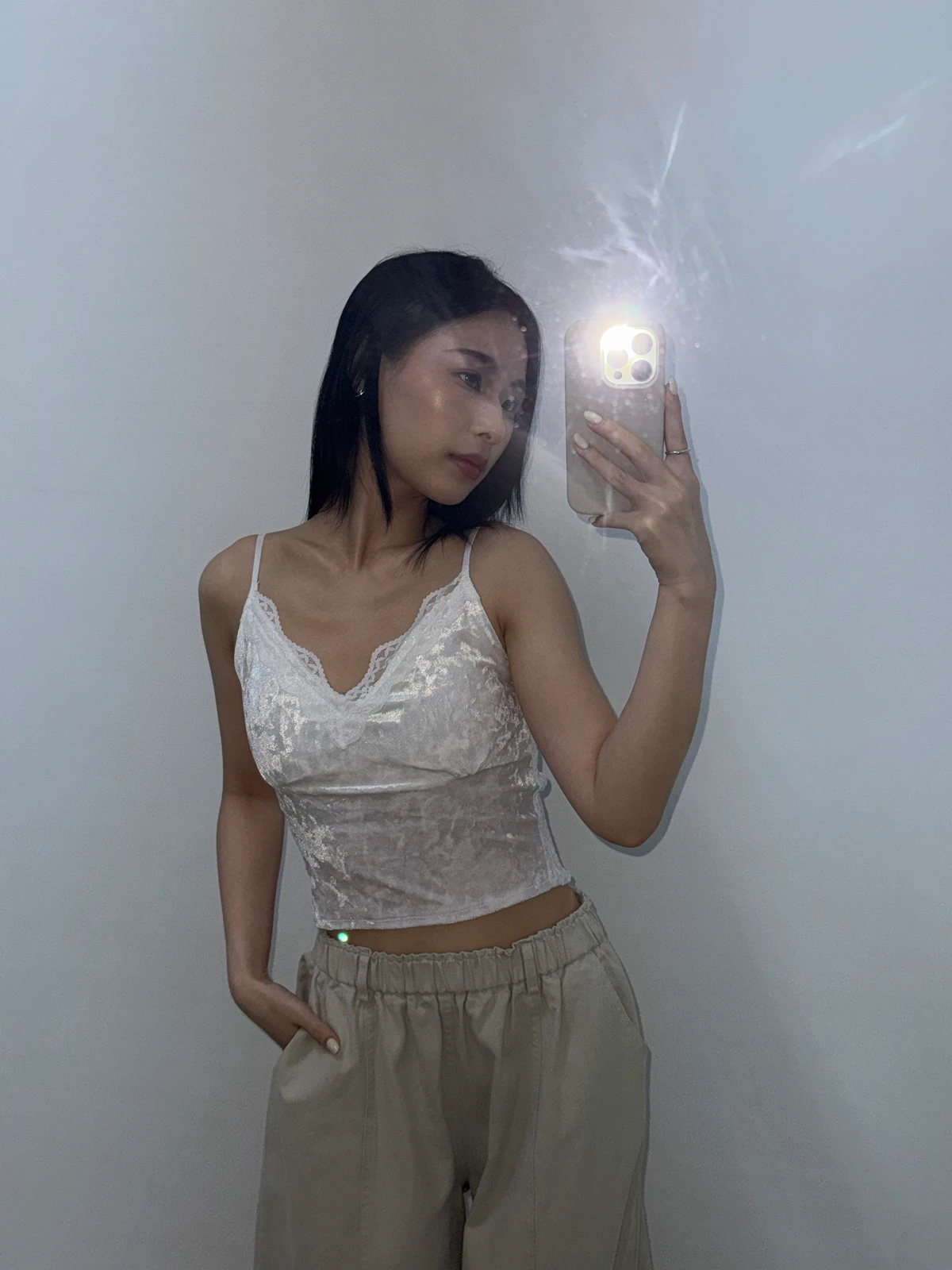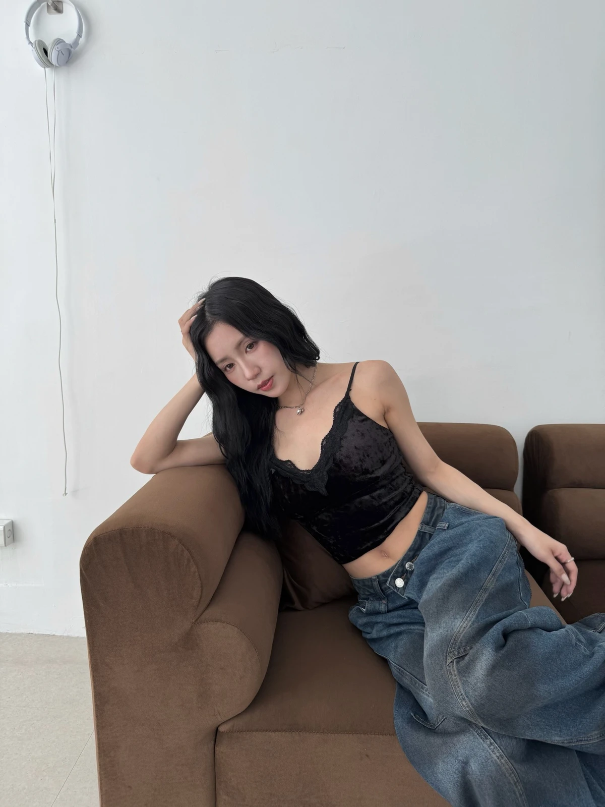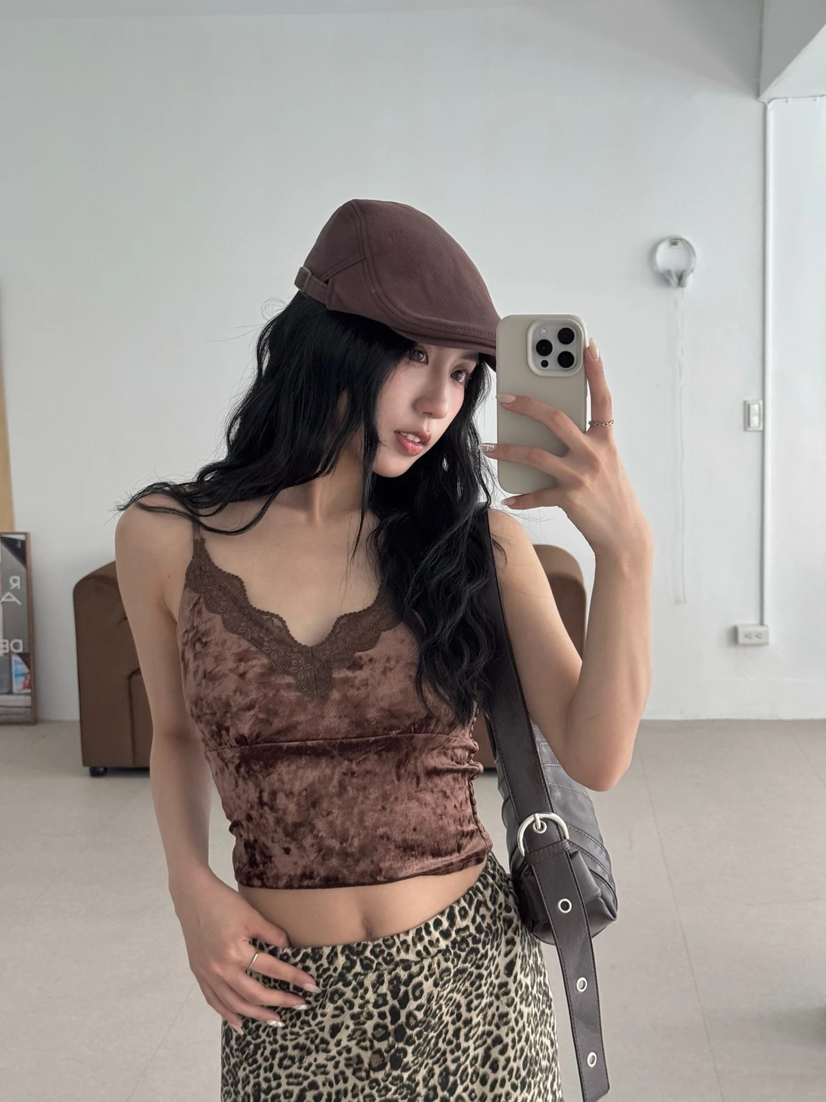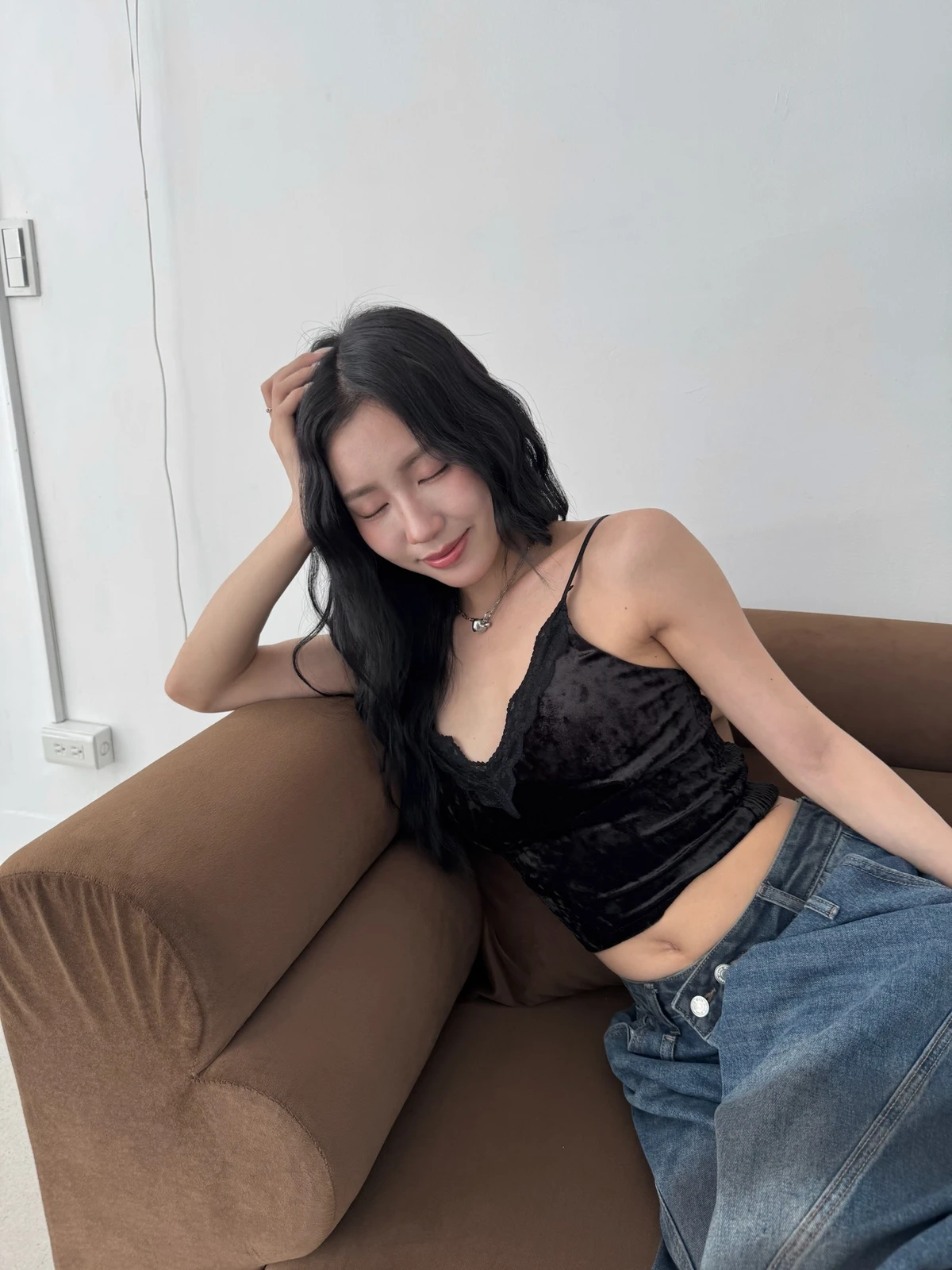 法式絲絨蕾絲滾邊細肩帶Bra Top/3colors