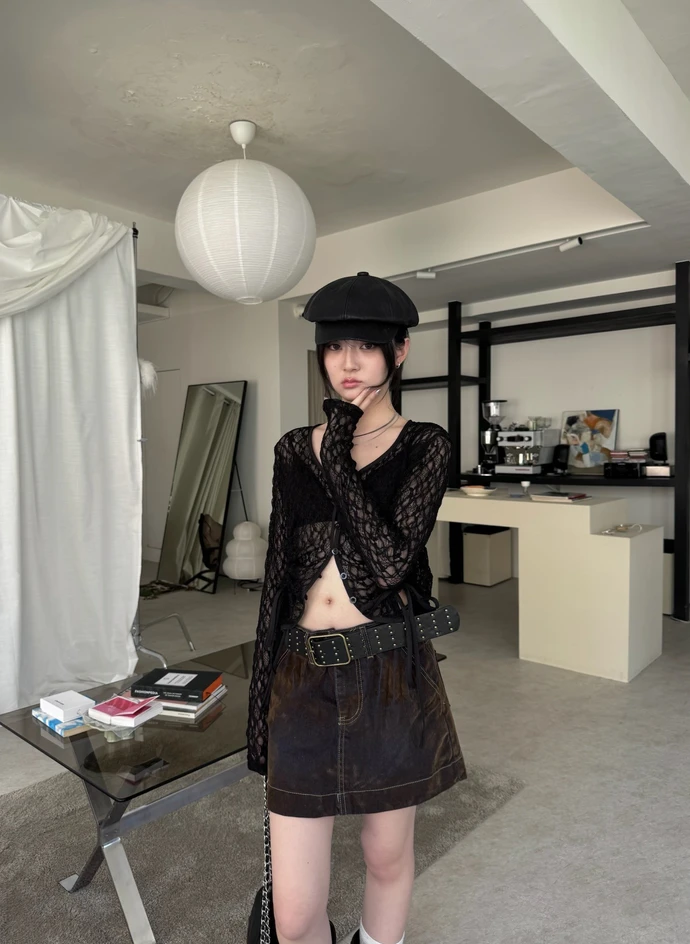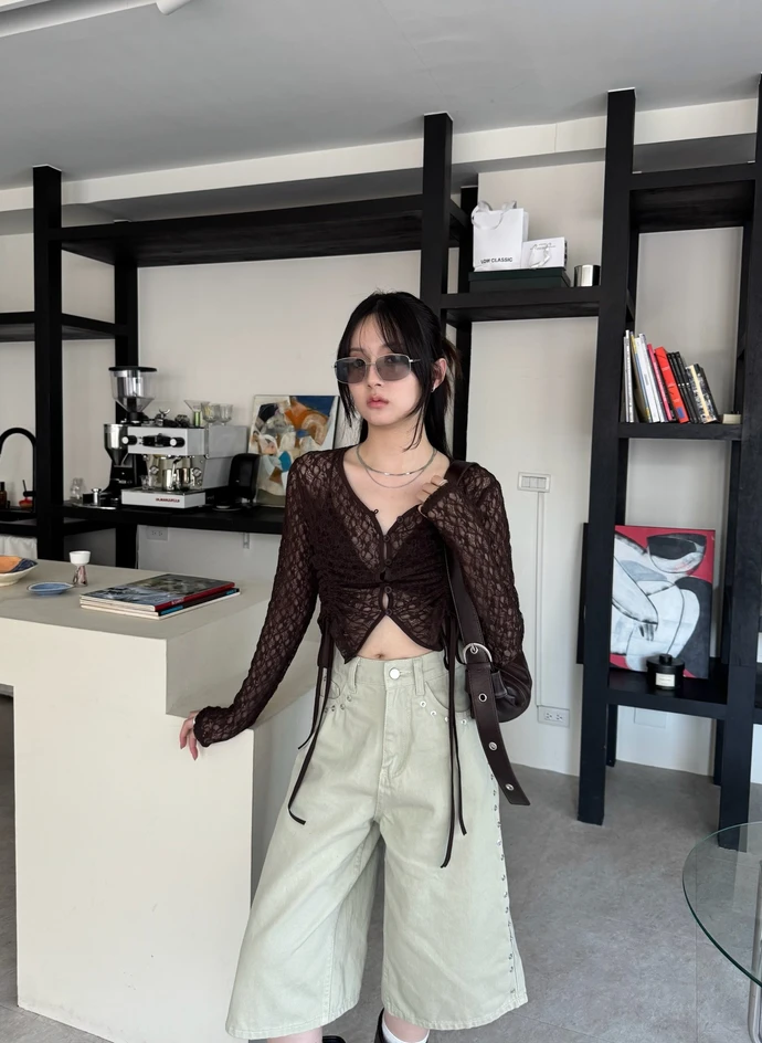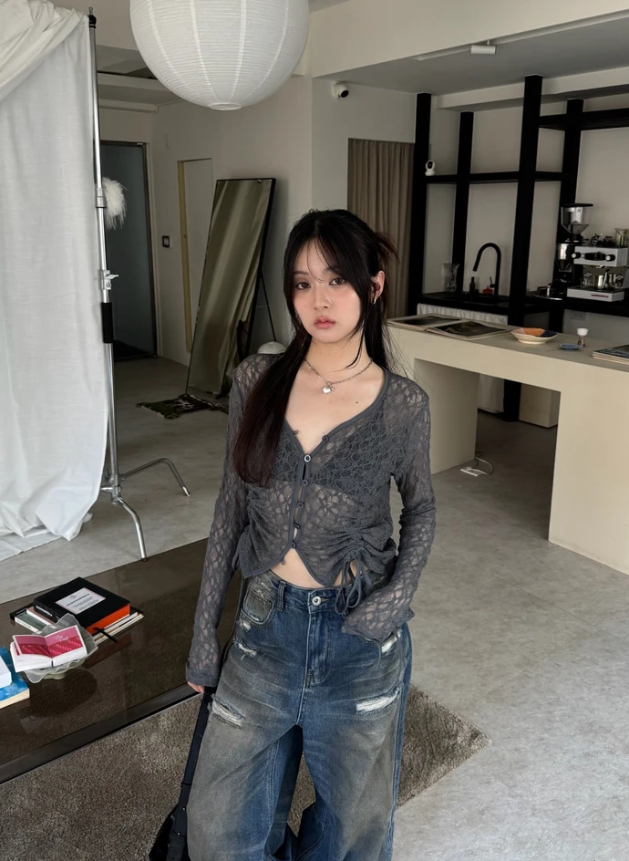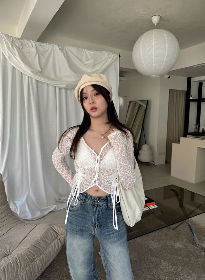 法式蕾絲透膚排扣抽繩上衣/4colors