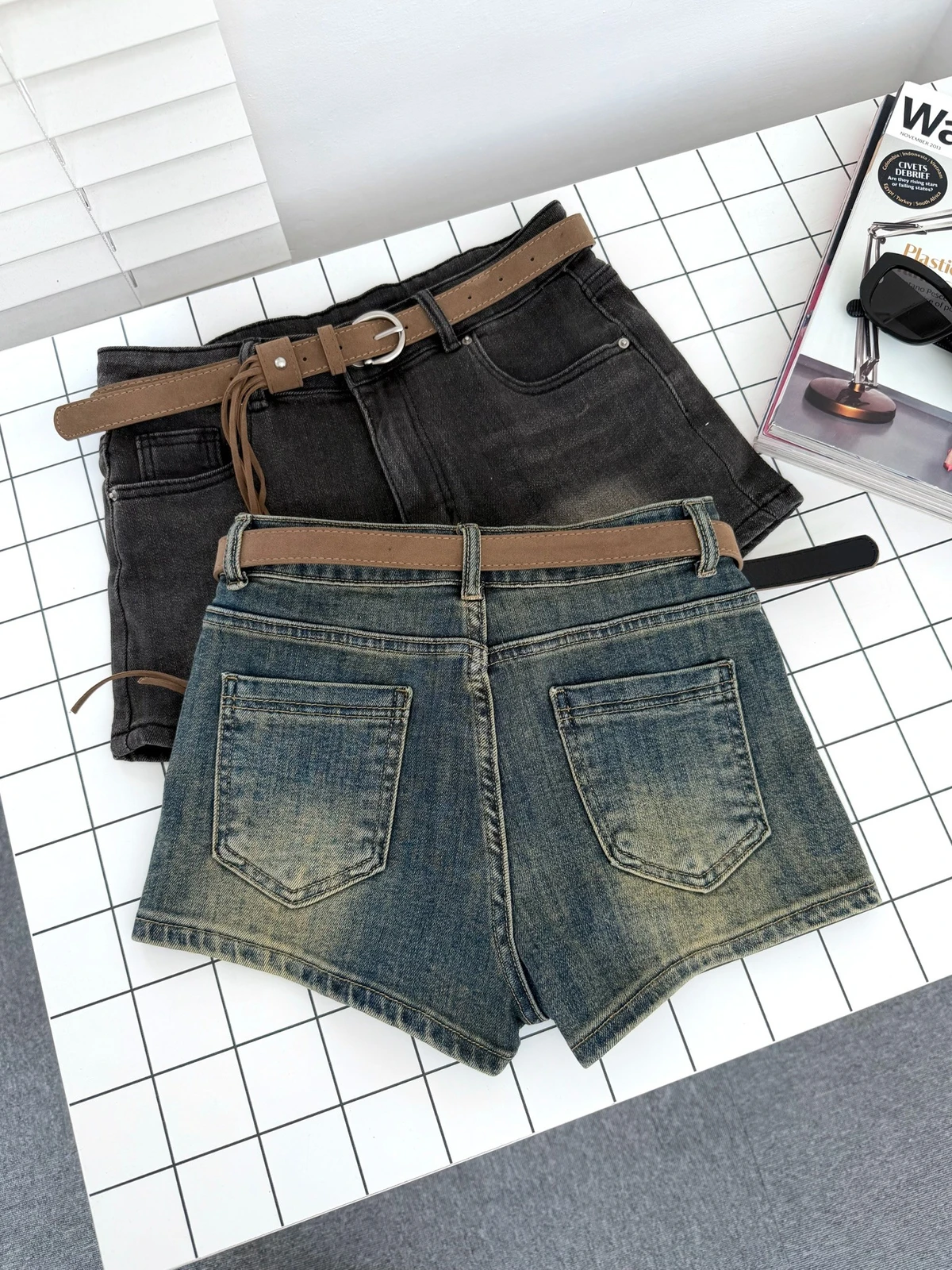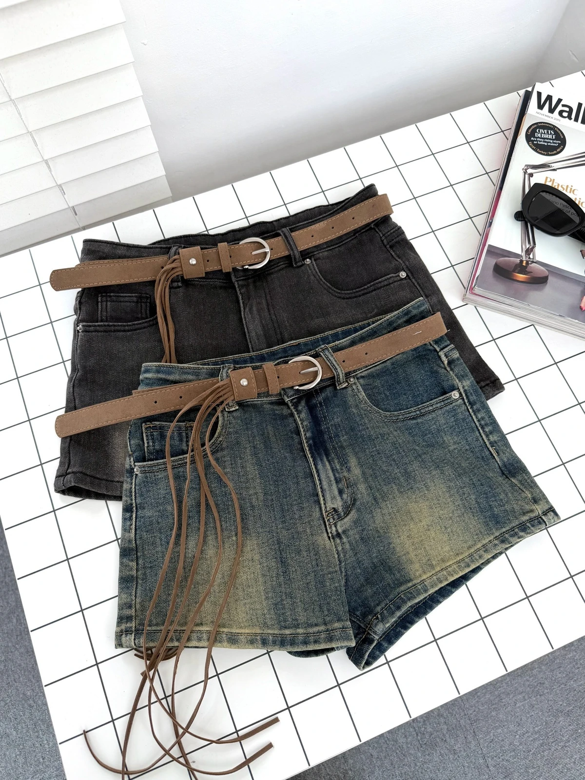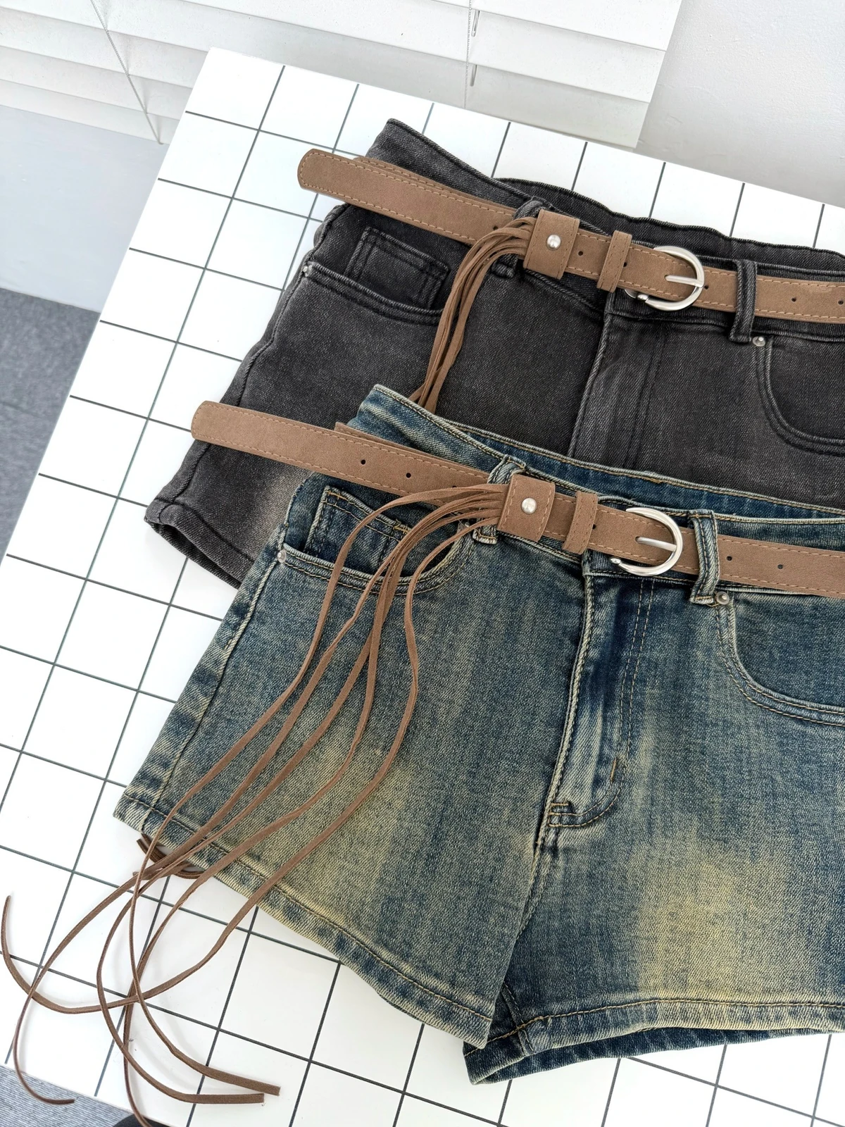 超彈力洗水牛仔短褲-附腰帶/2colors
