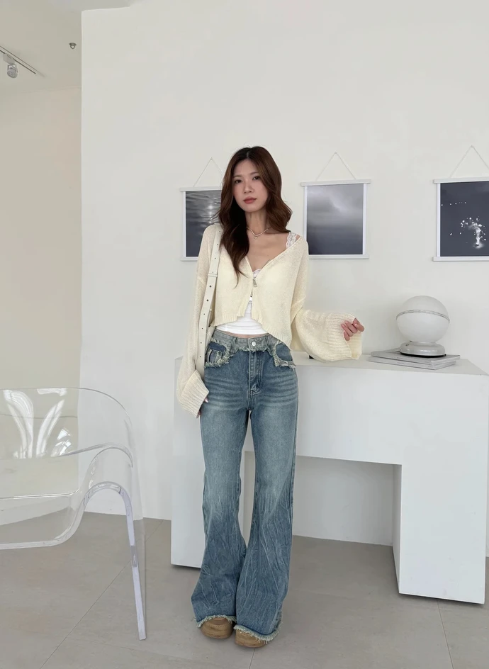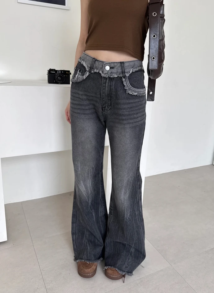 褲頭拼接毛鬚邊微喇叭牛仔褲/2colors