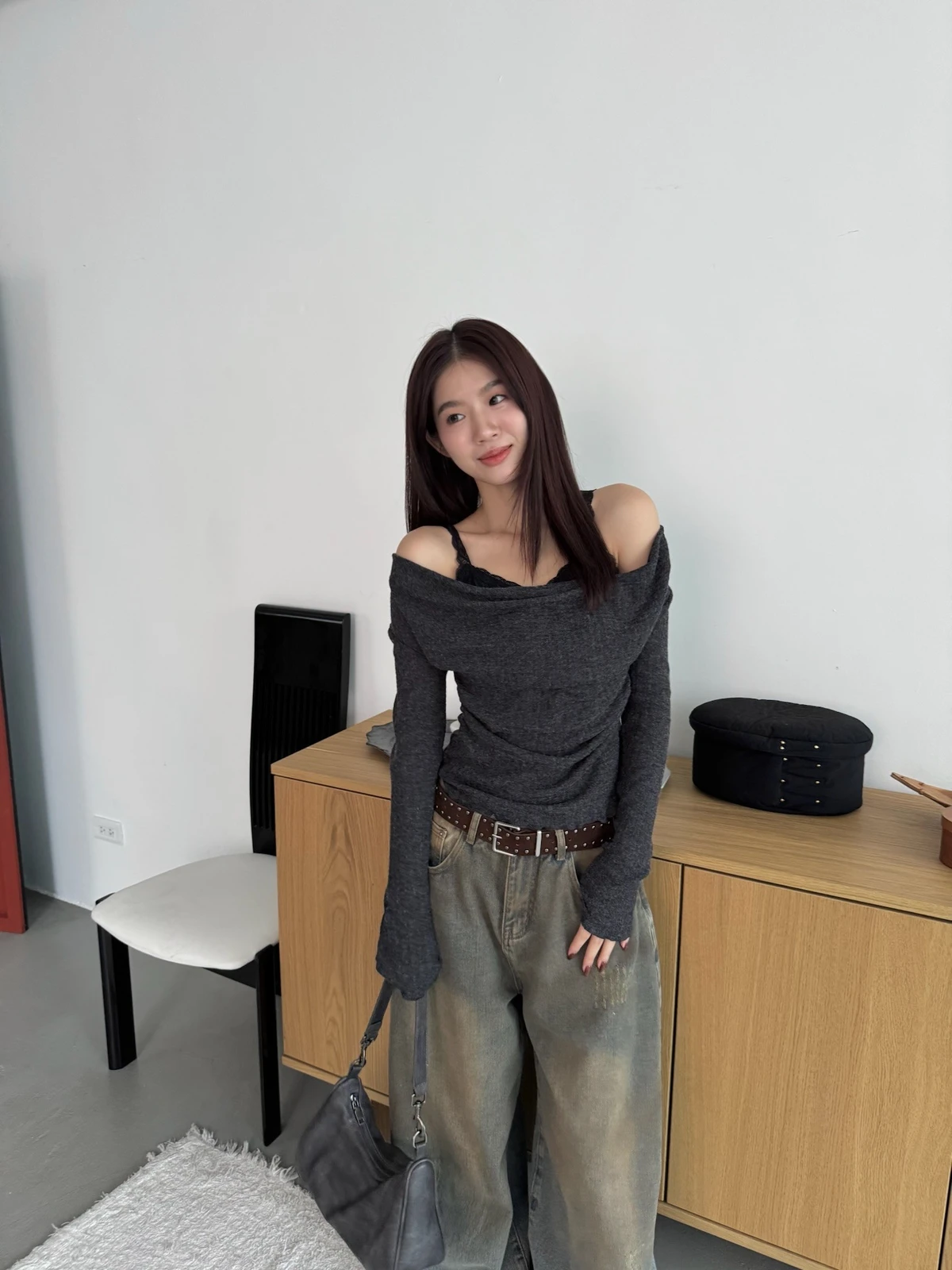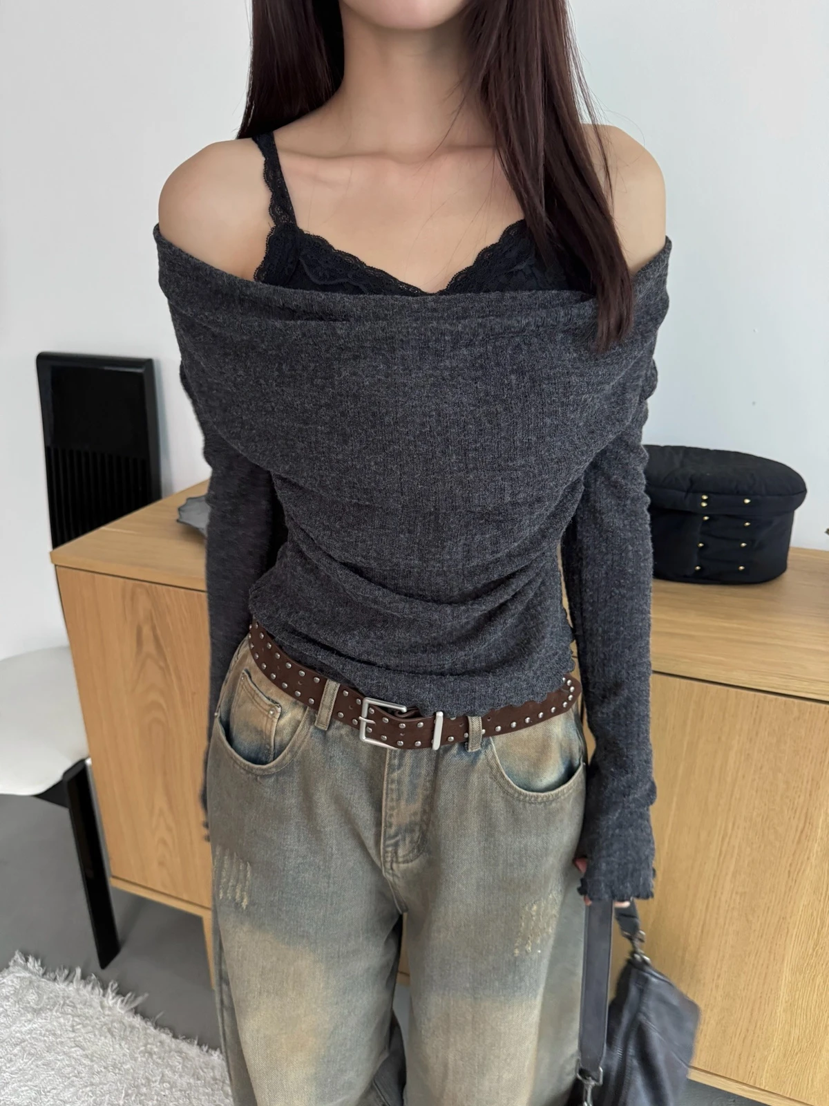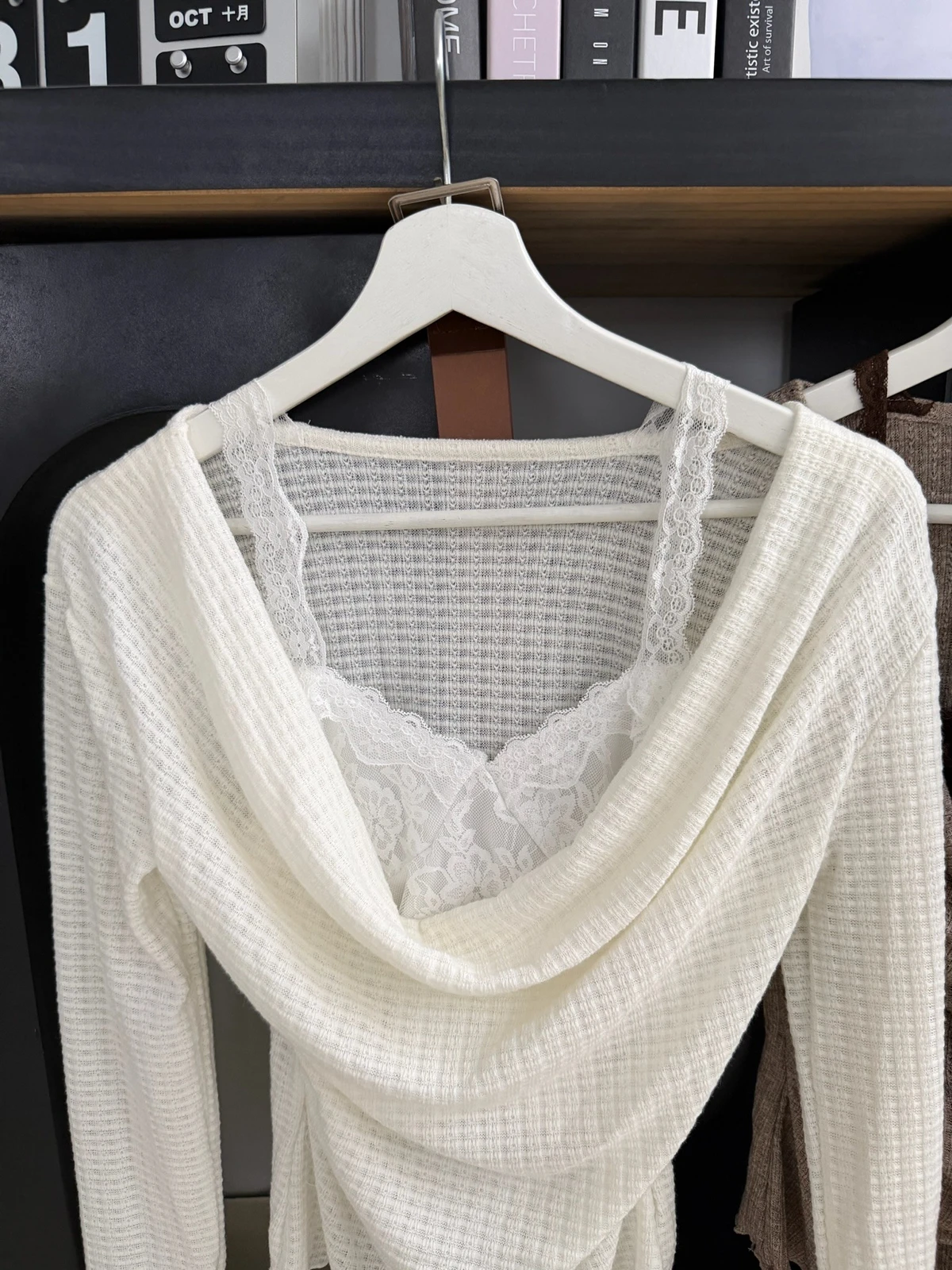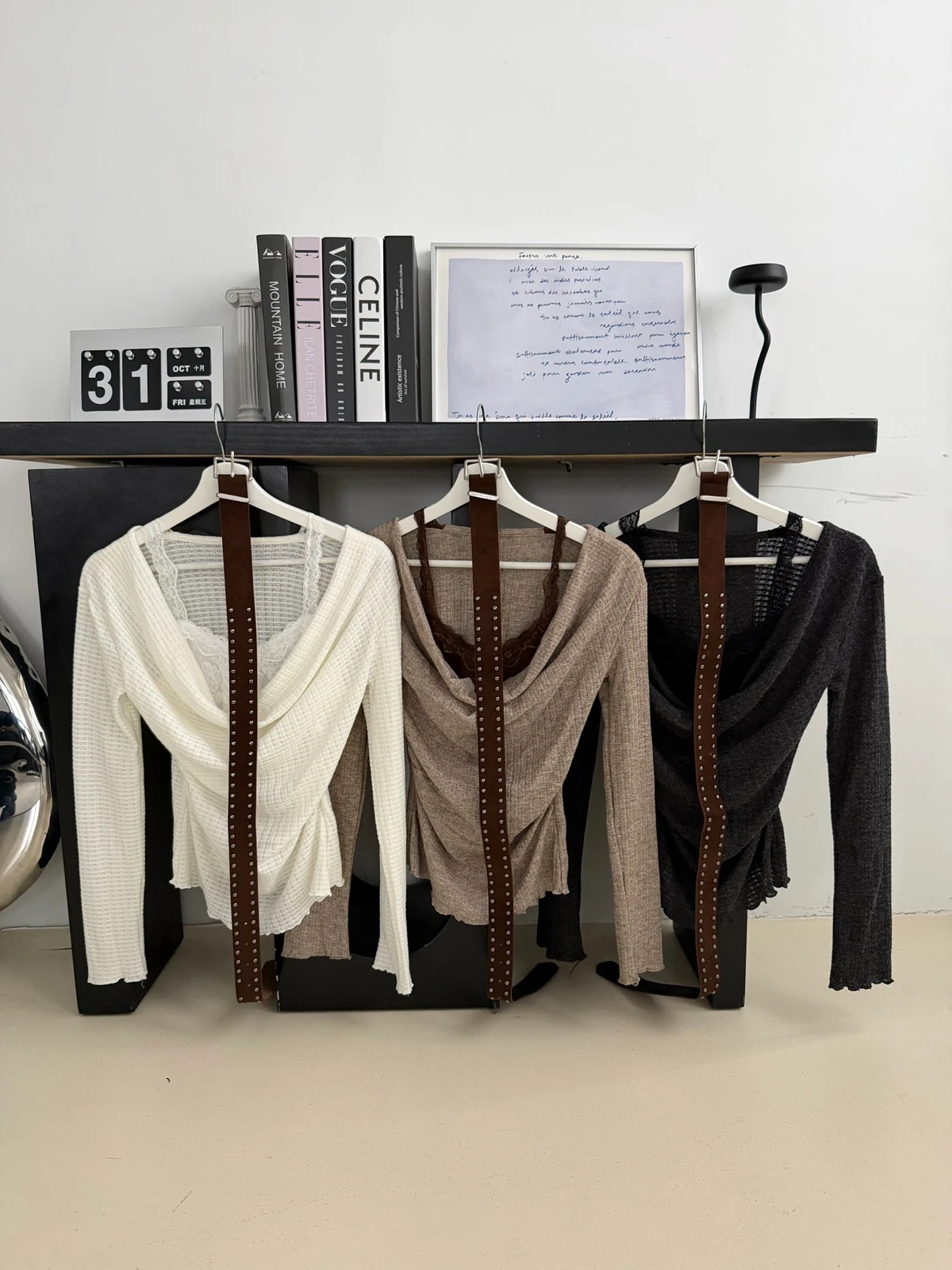 本期推薦!垂墜領蕾絲假兩件針織上衣-附皮帶/3colors