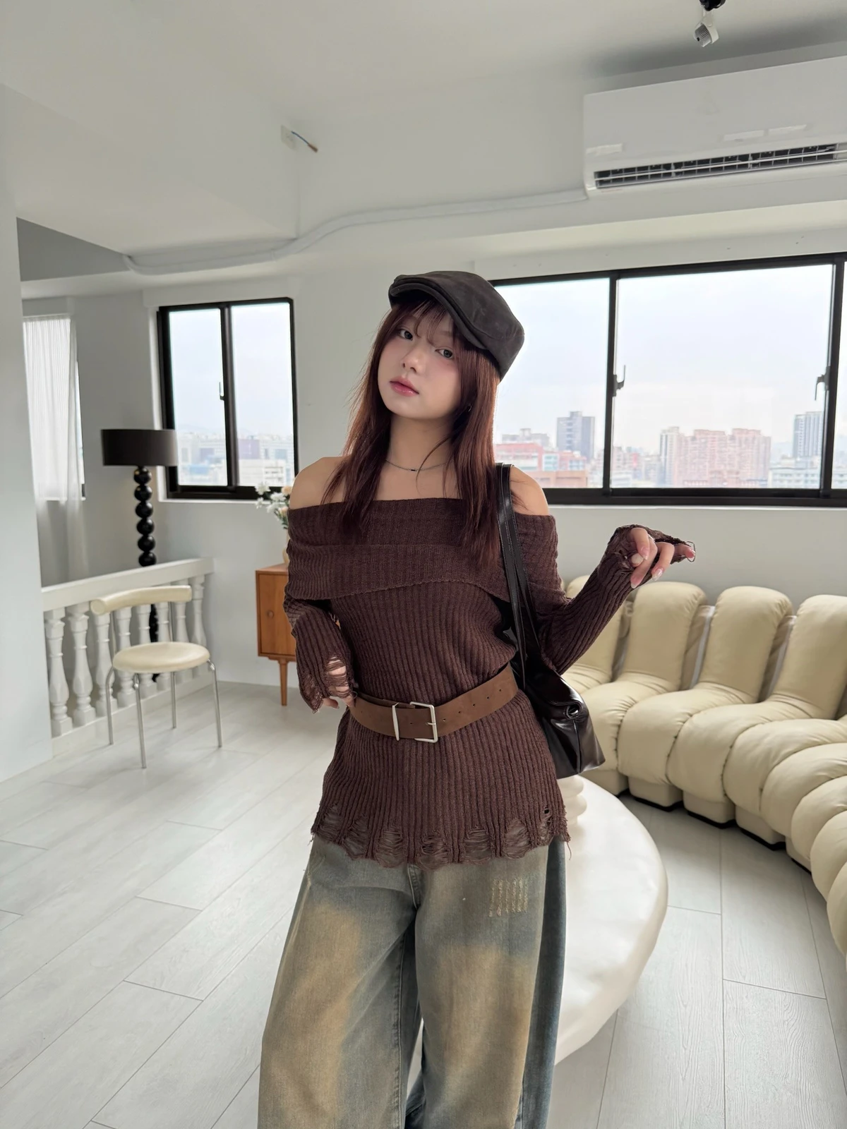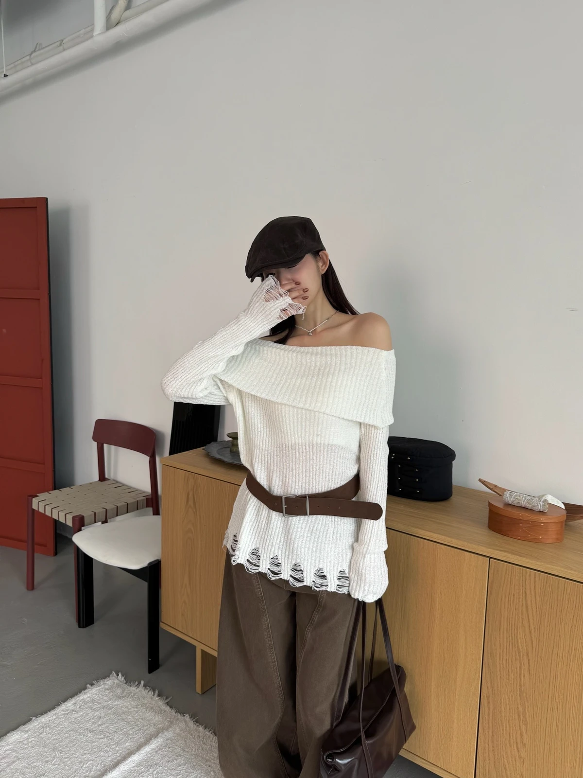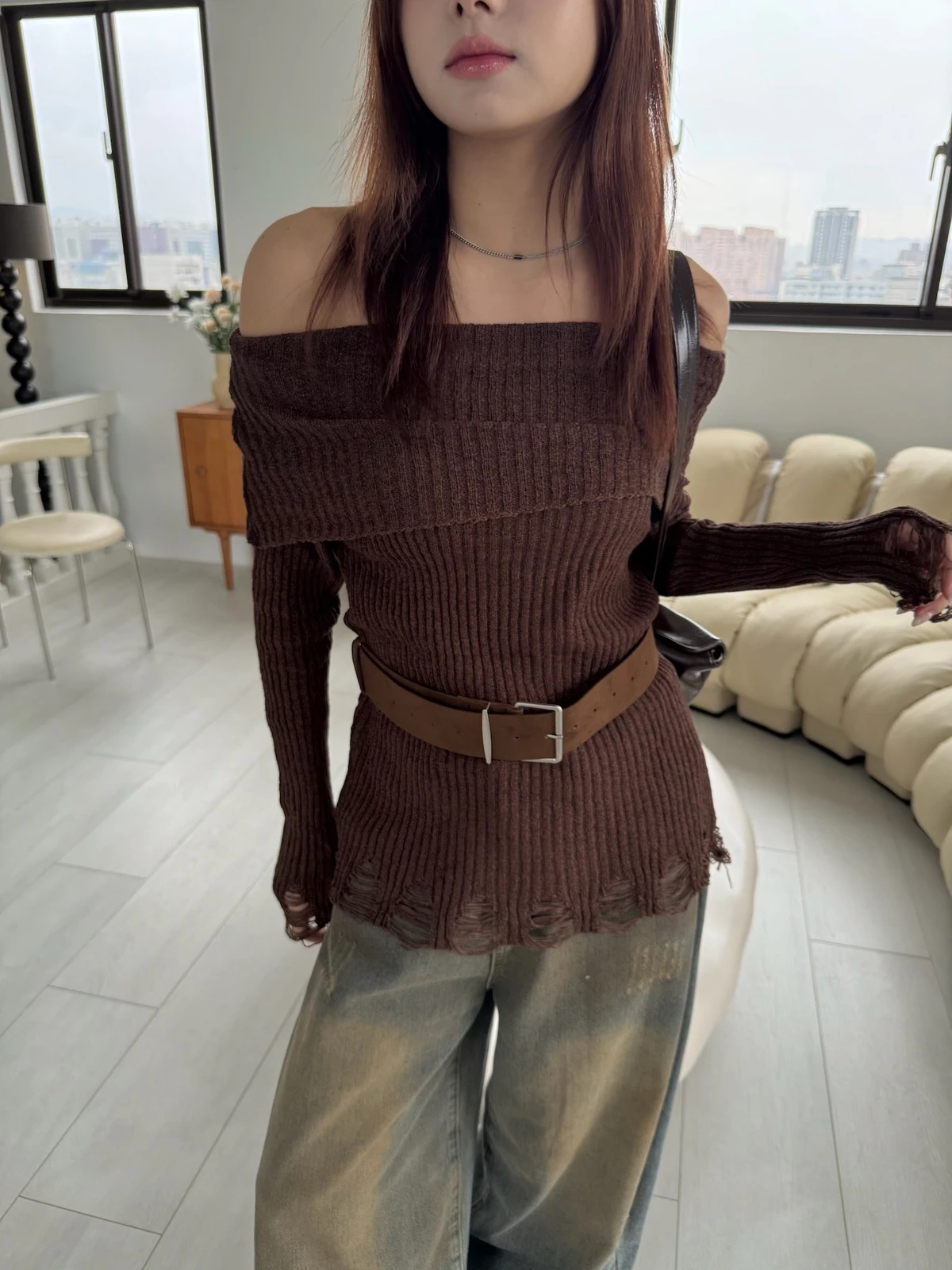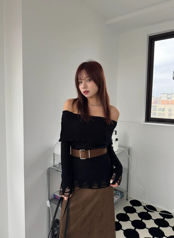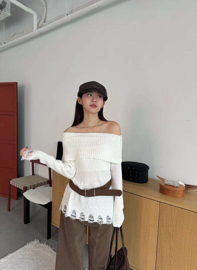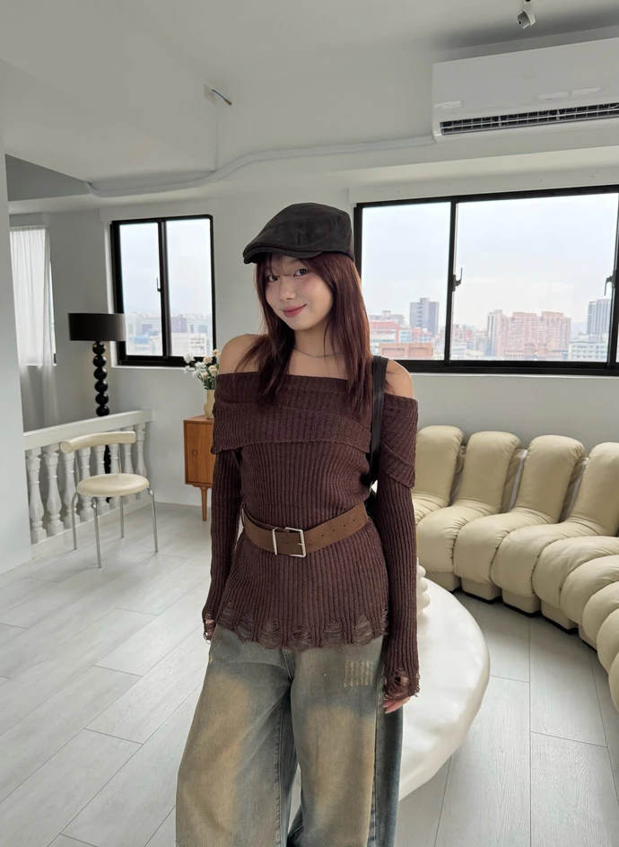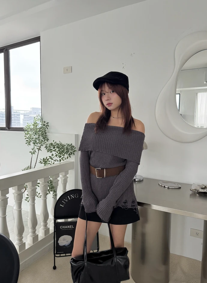 翻領刷破毛衣-附腰帶/4colors