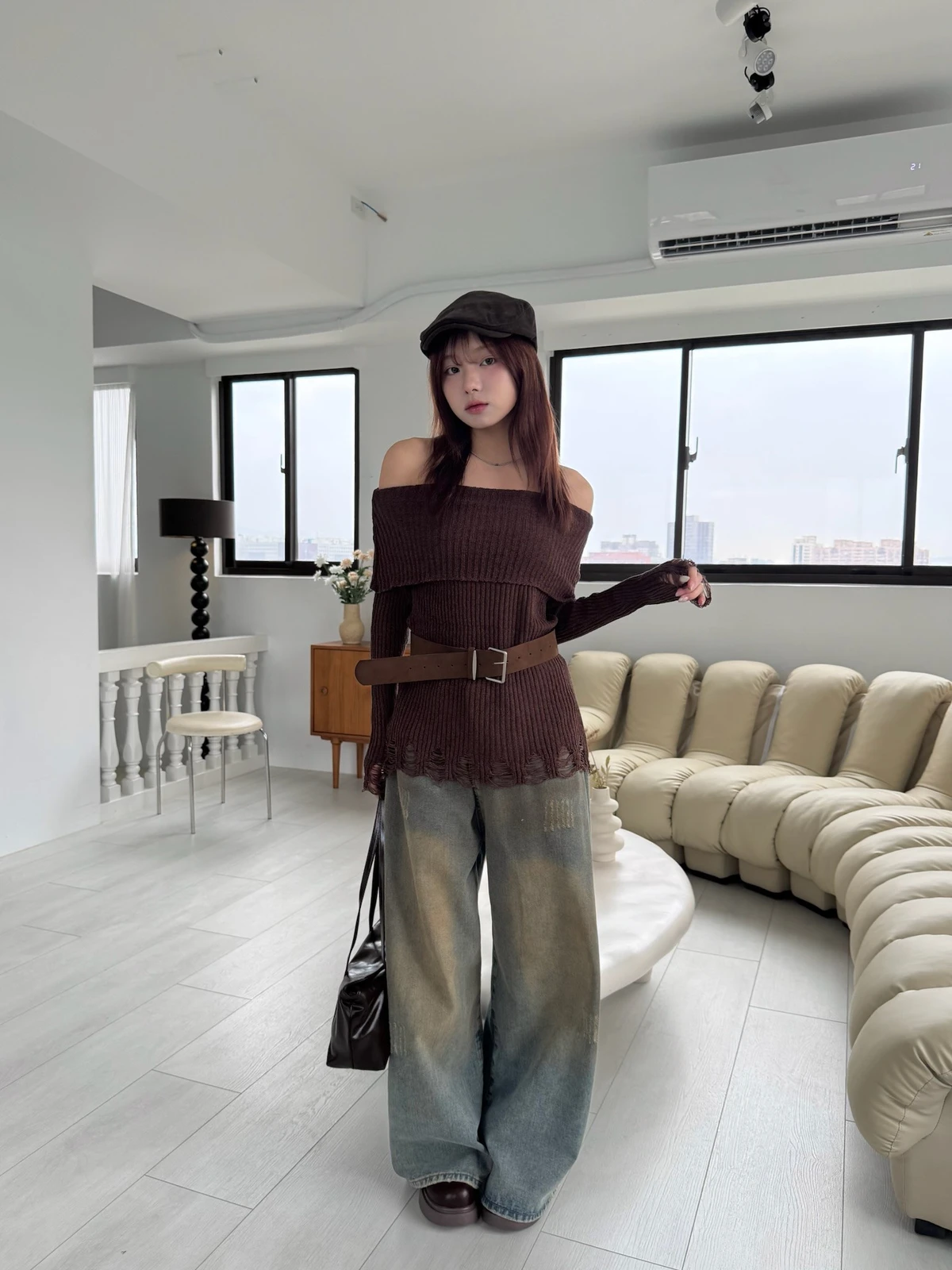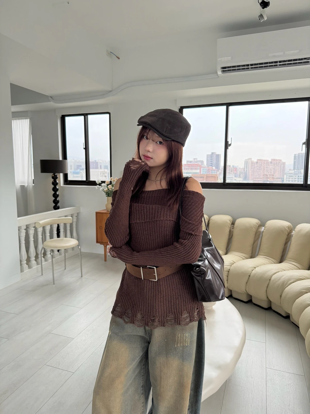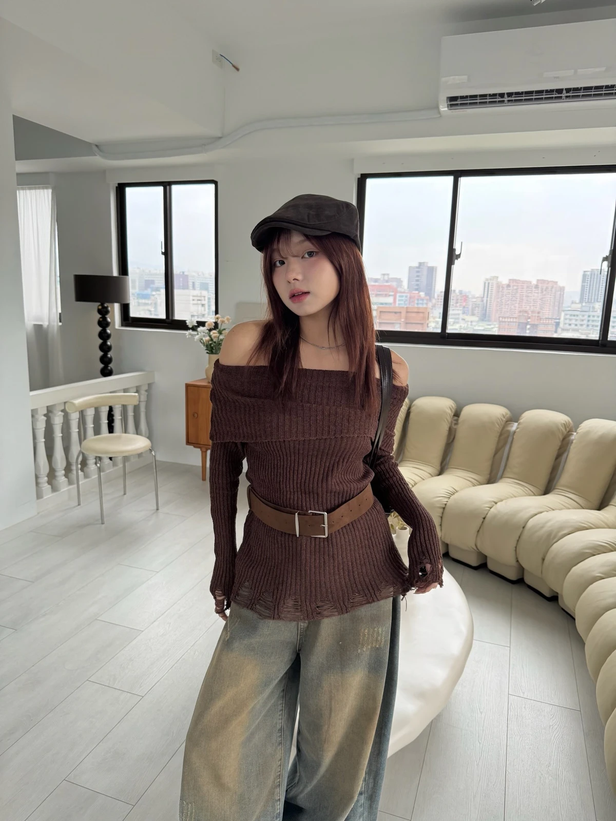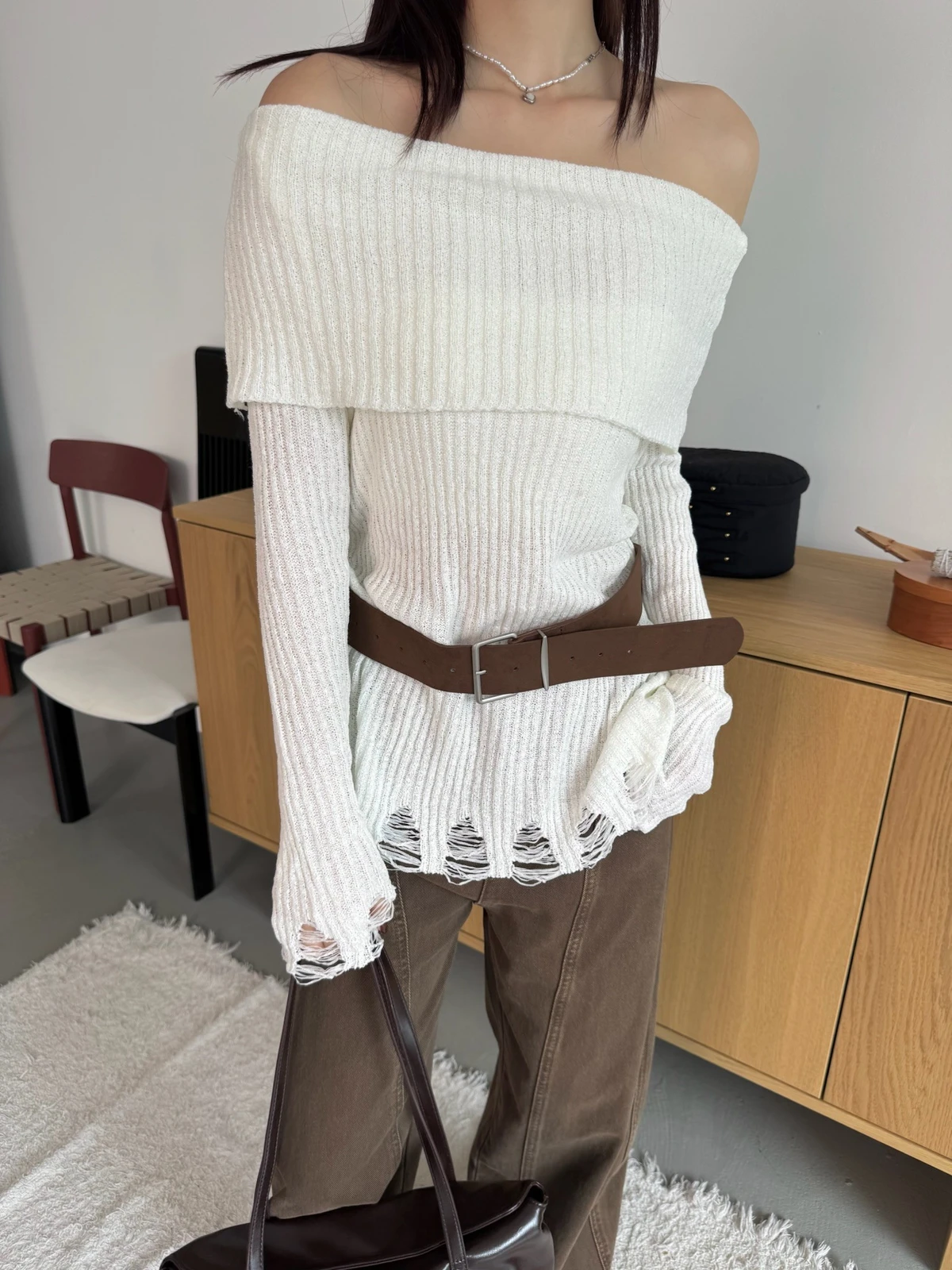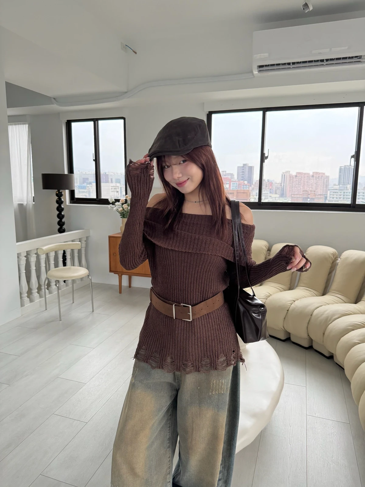 翻領刷破毛衣-附腰帶/4colors