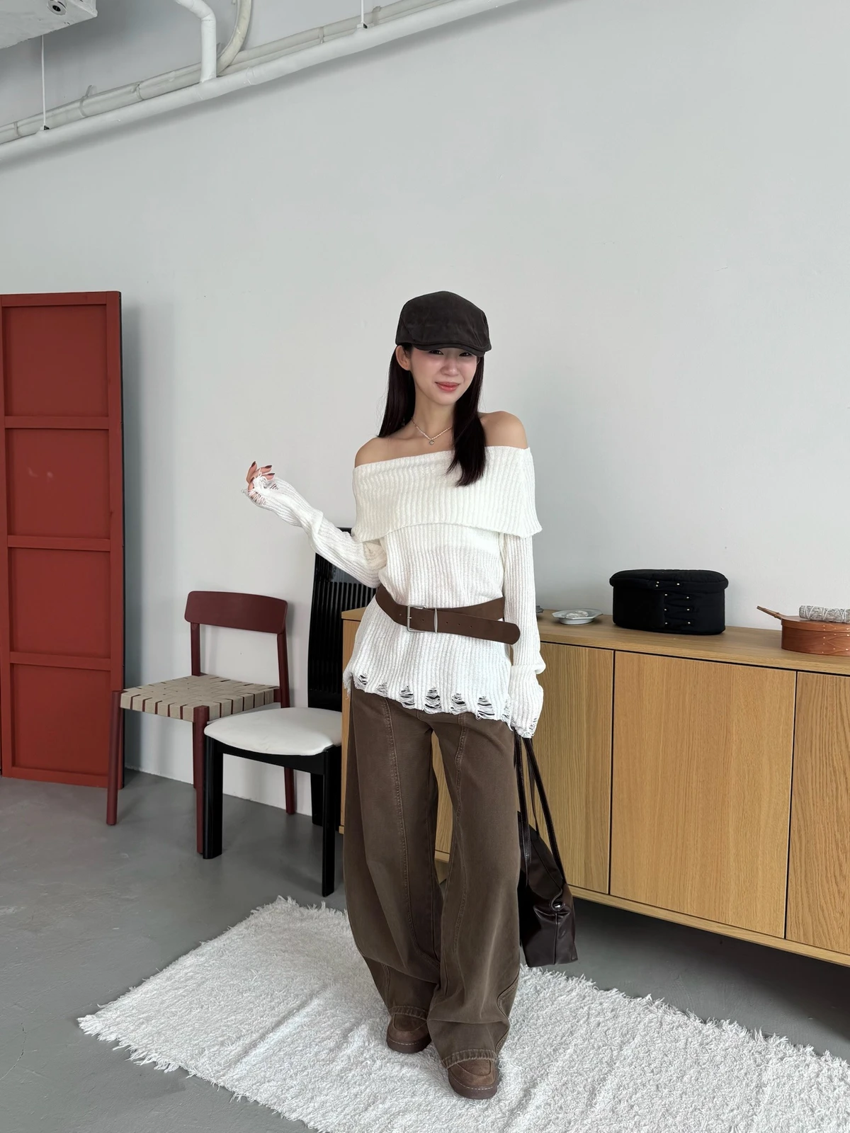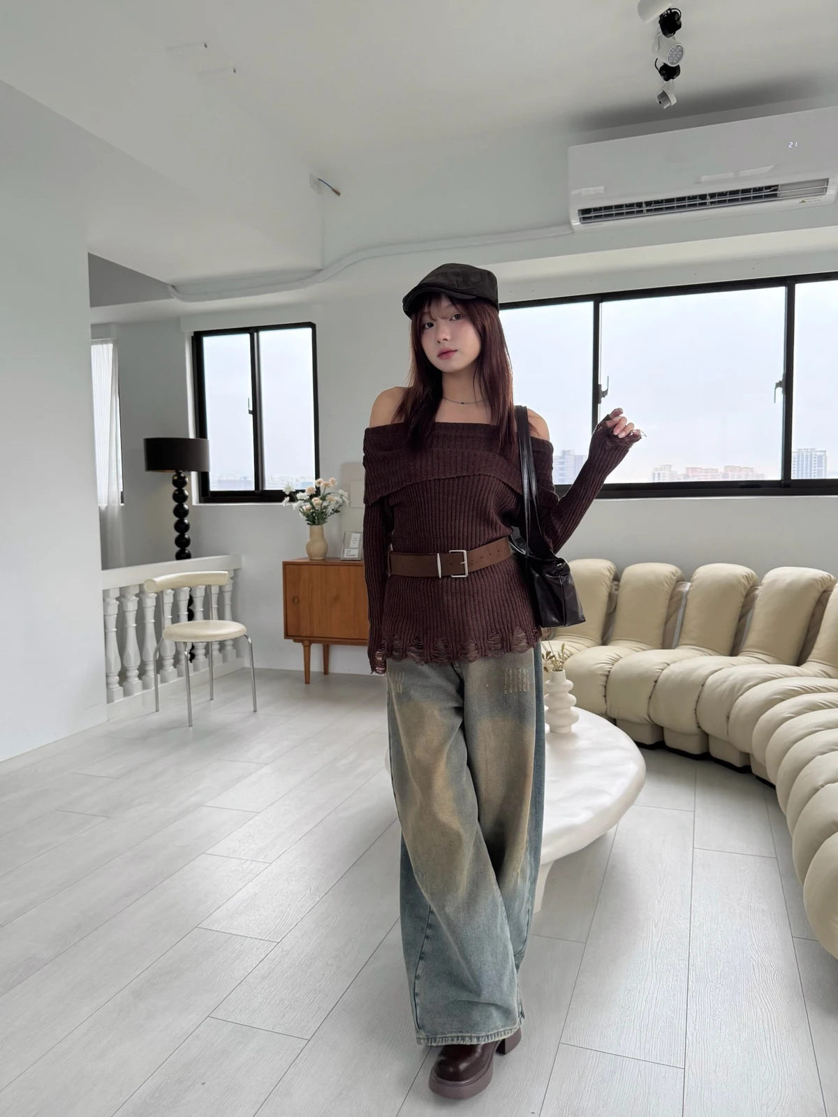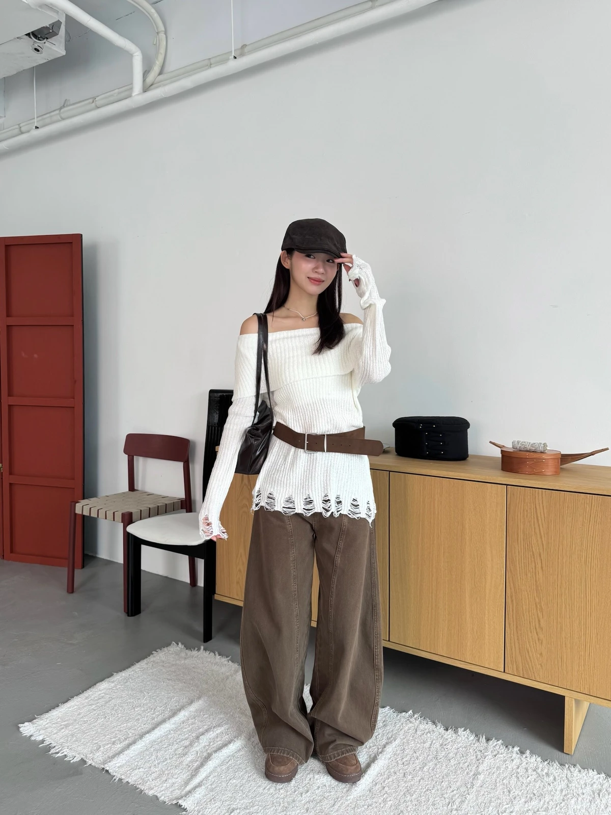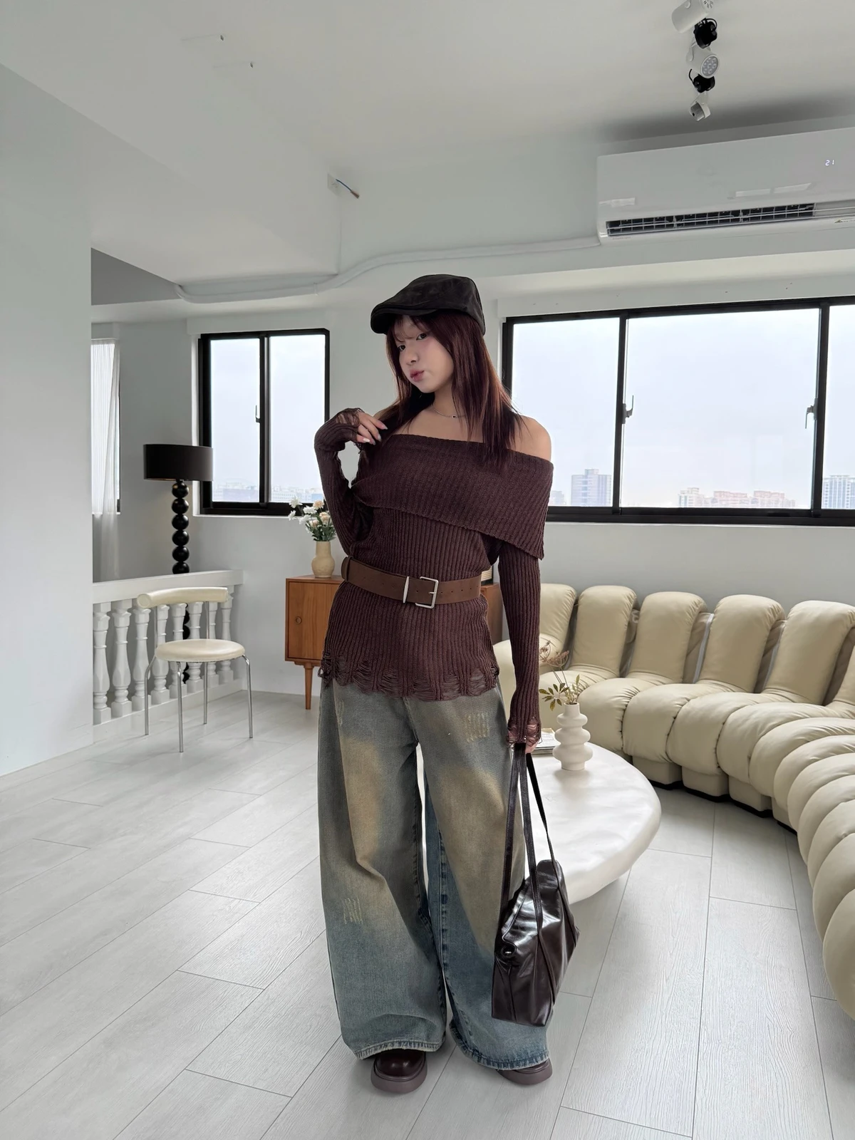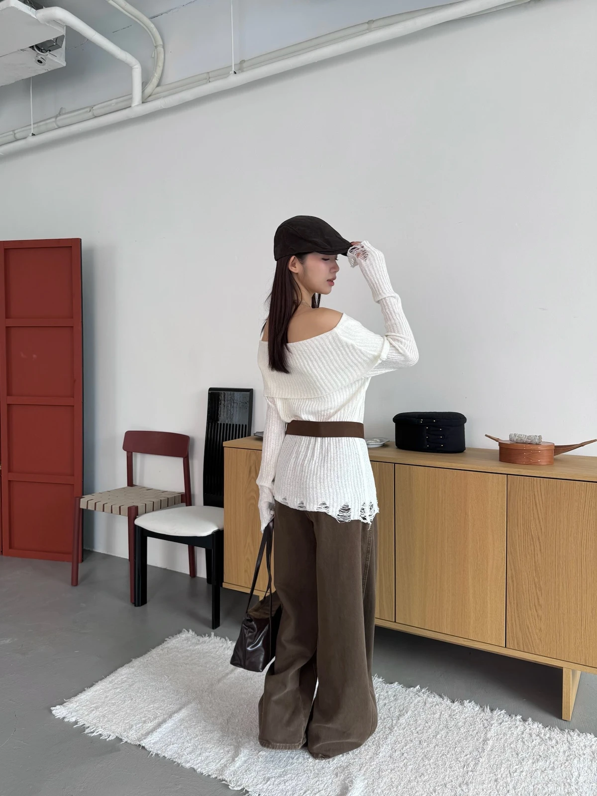 翻領刷破毛衣-附腰帶/4colors