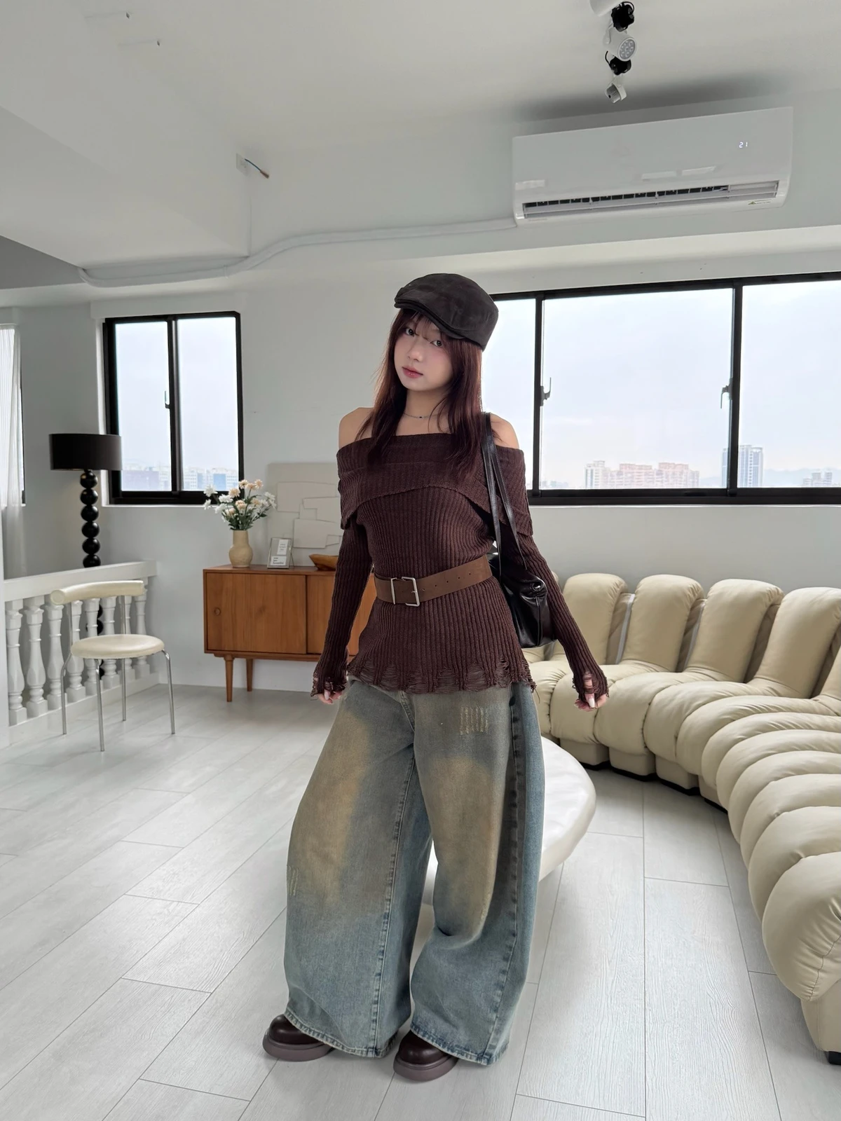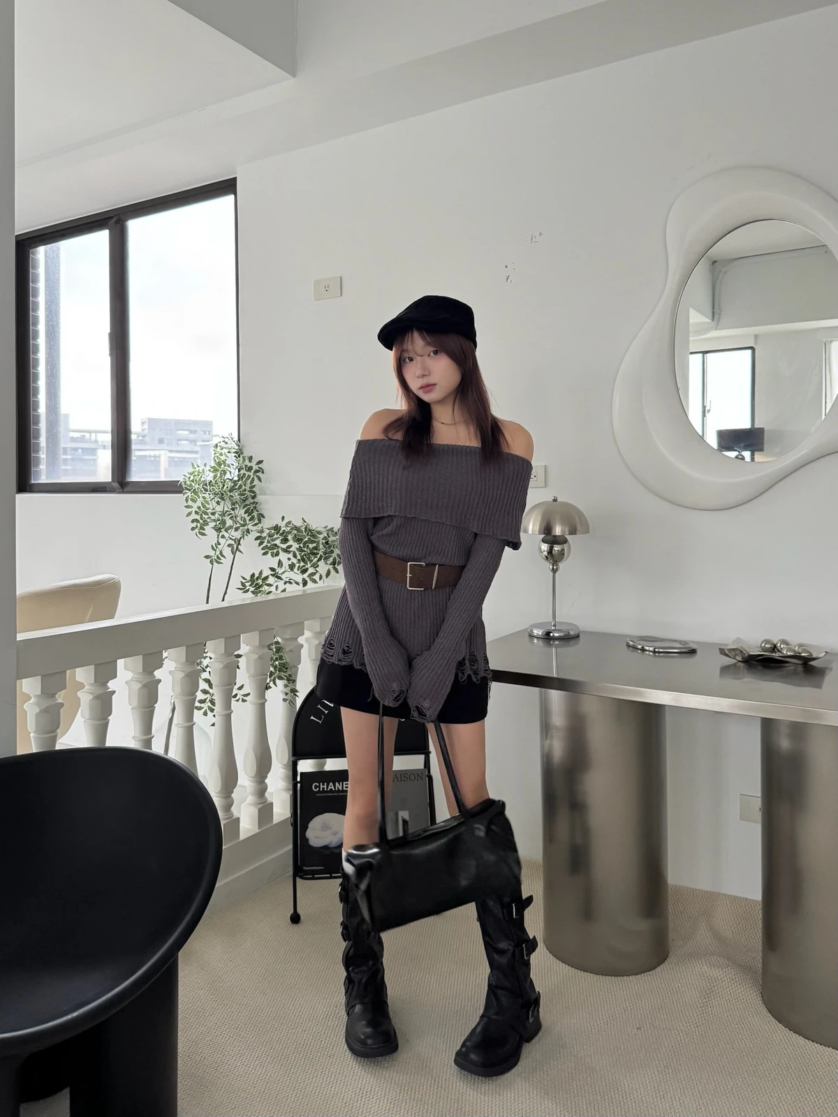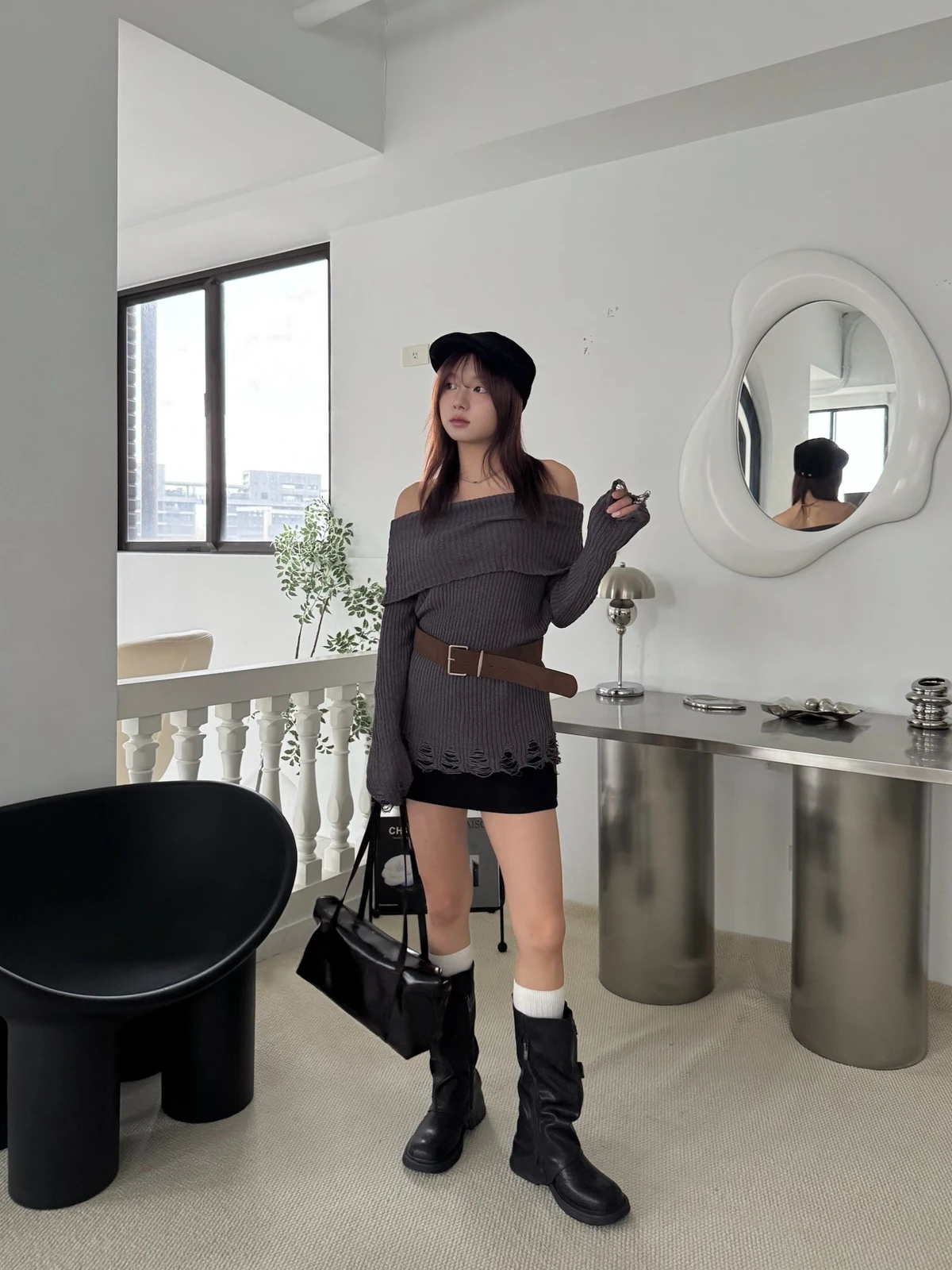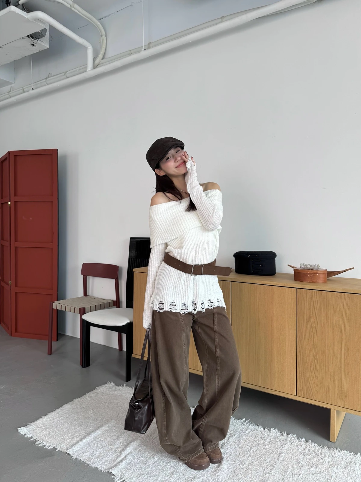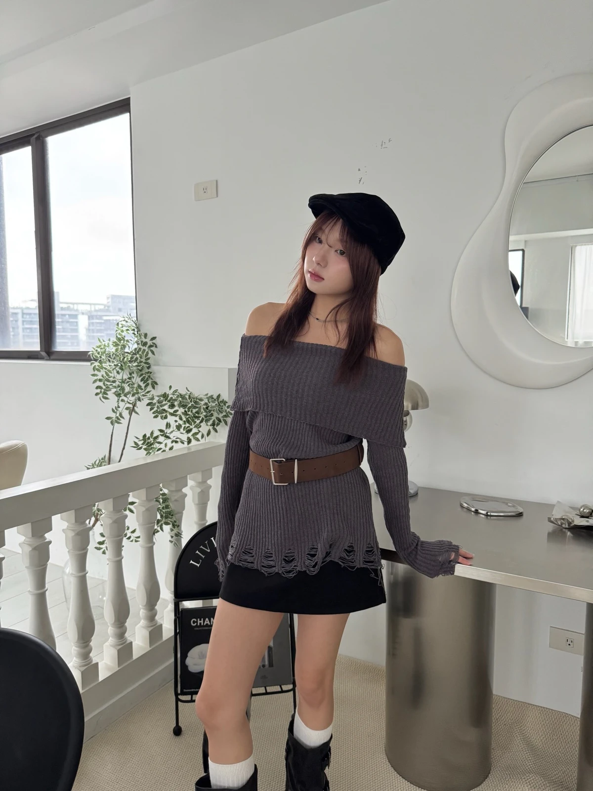 翻領刷破毛衣-附腰帶/4colors